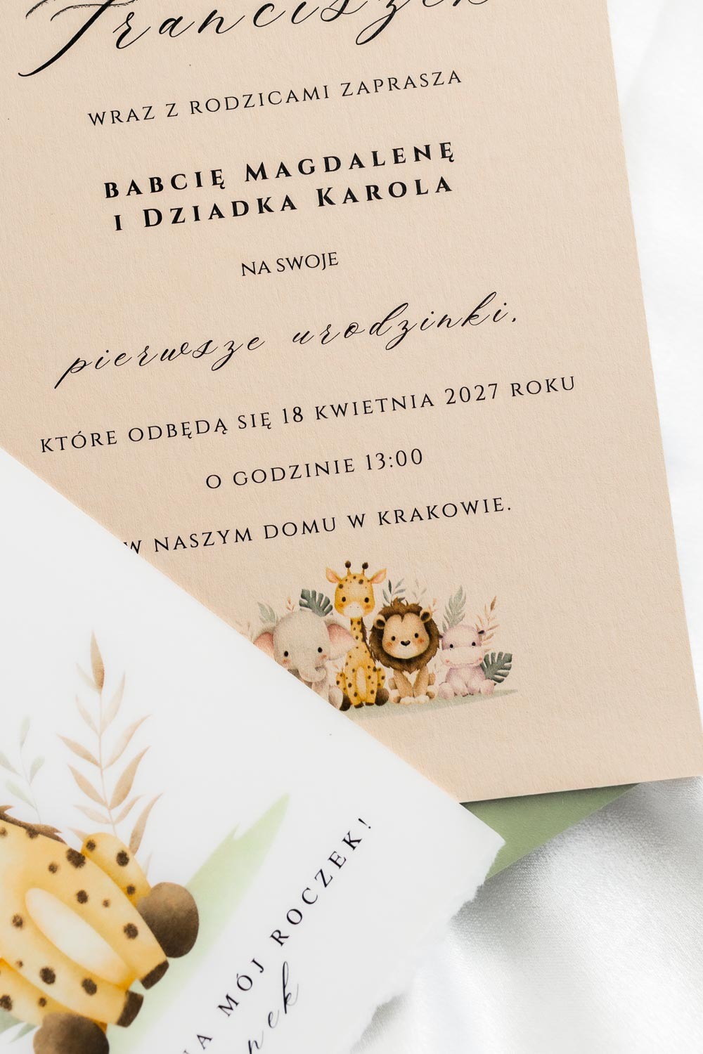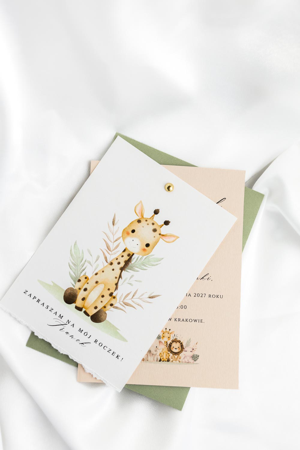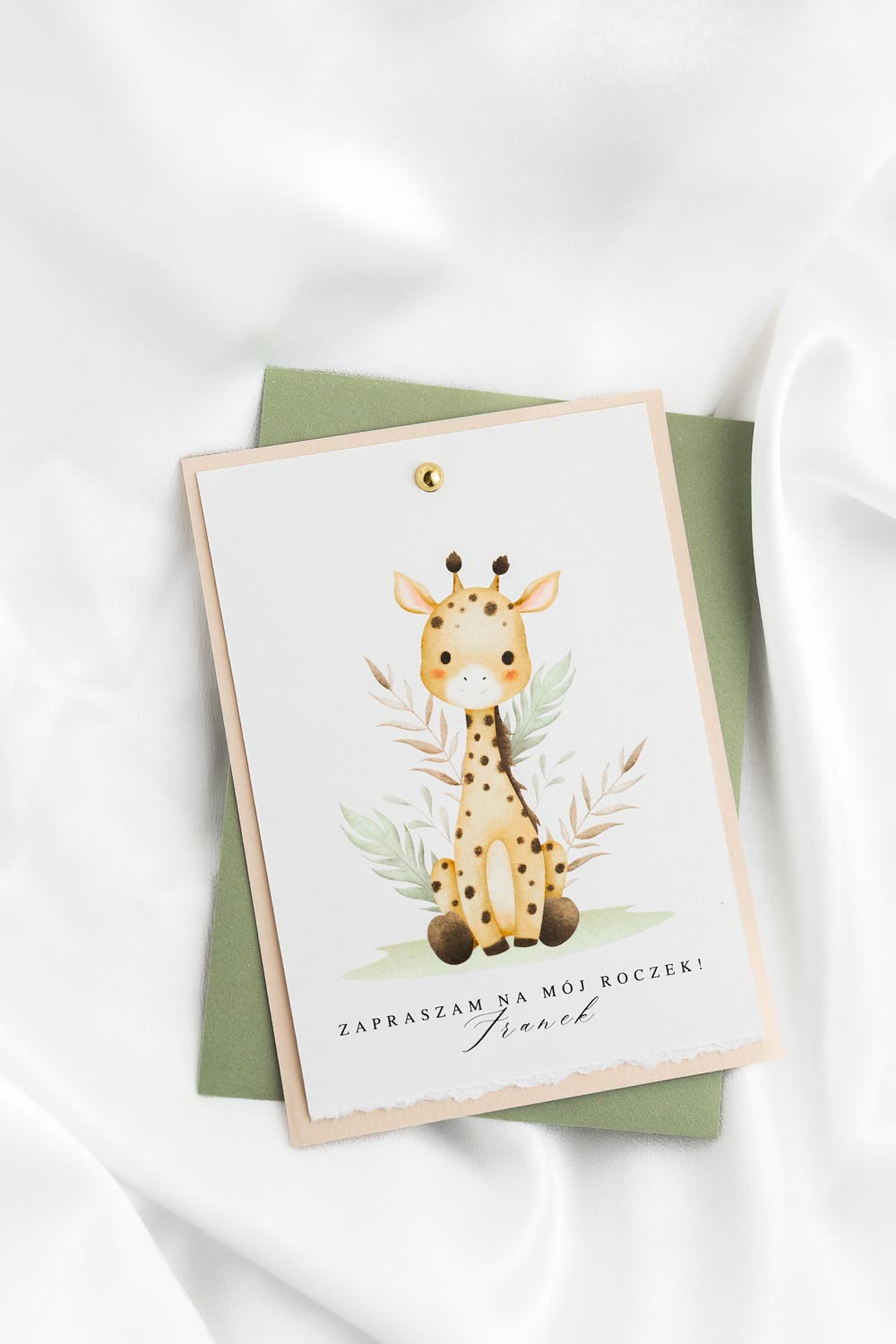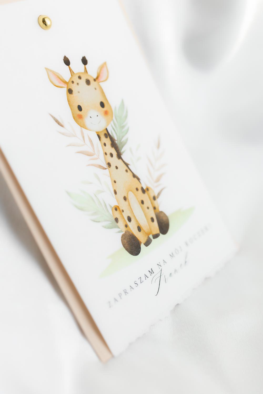 Nowoczesne zaproszenie na pierwsze i każde kolejne urodziny. Minimalistyczna forma z grafiką żyrafy.