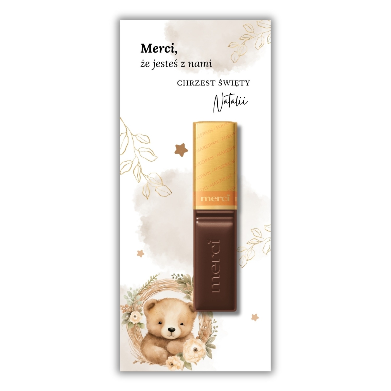 Podziękowanie komunijne do czekoladek Merci