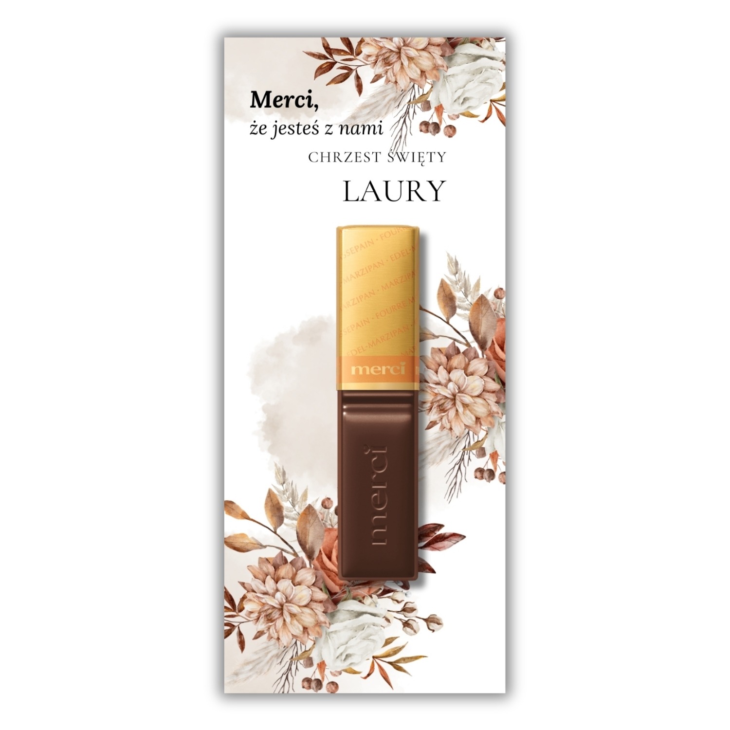 Podziękowanie komunijne do czekoladek Merci