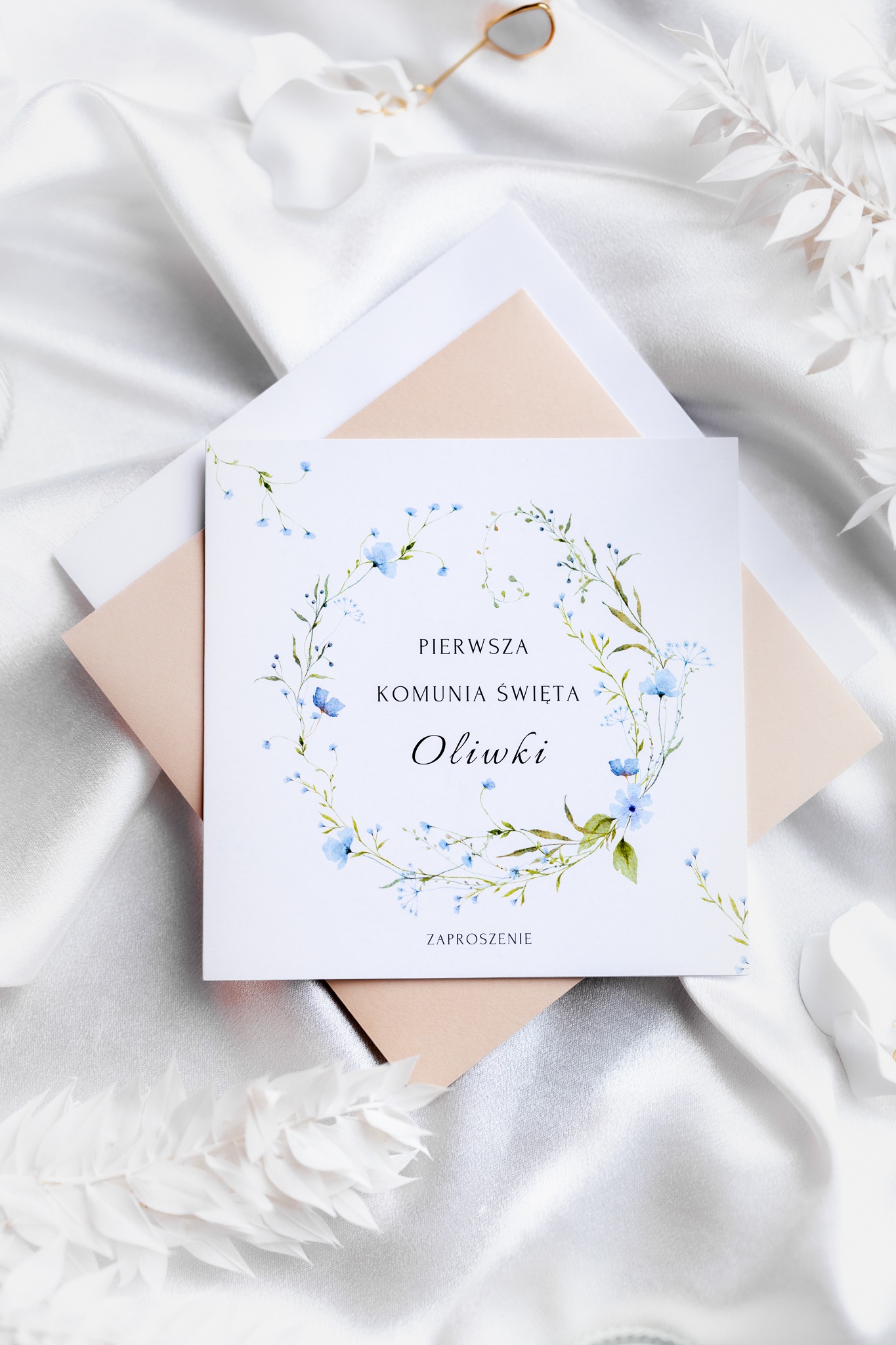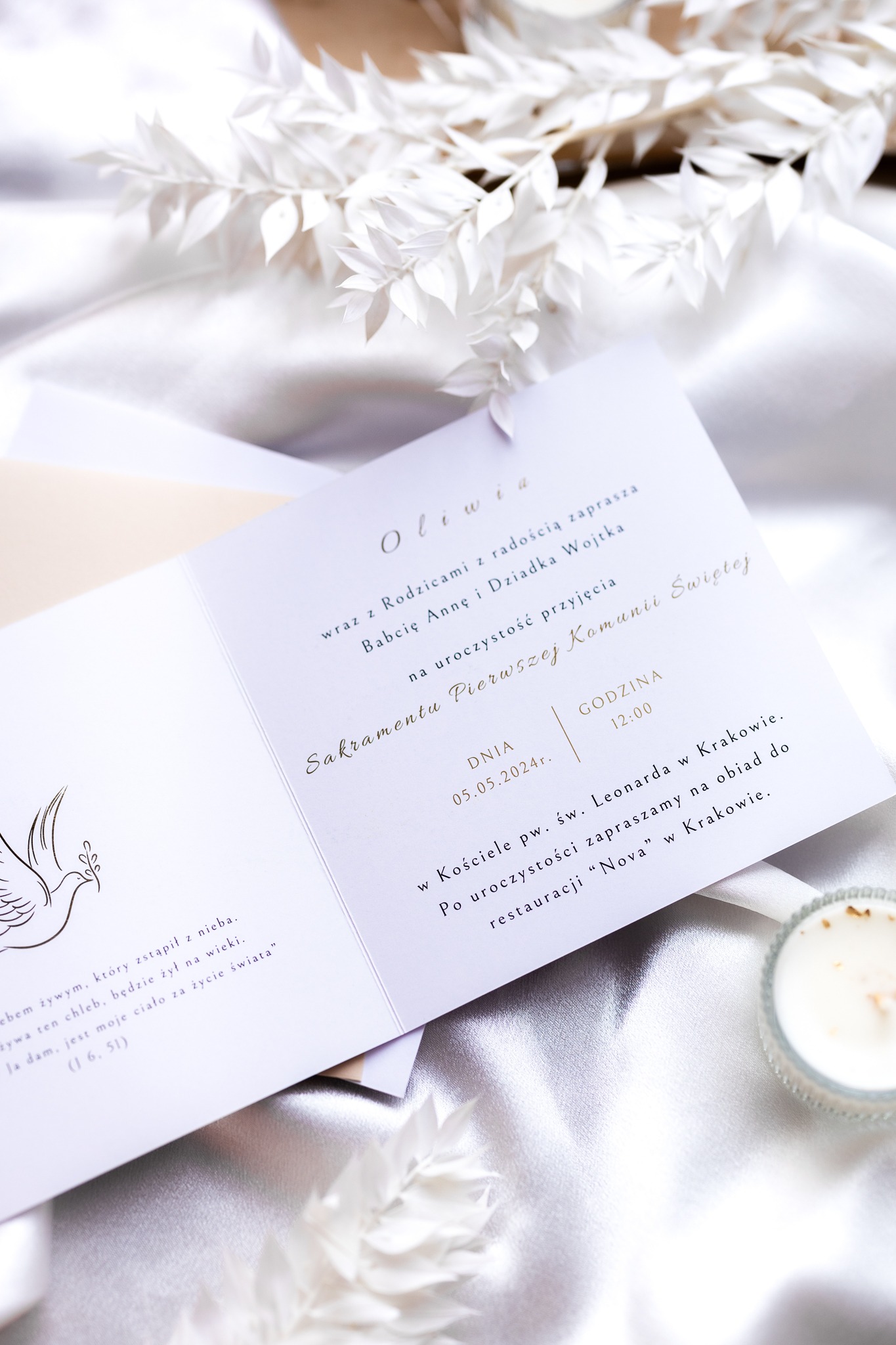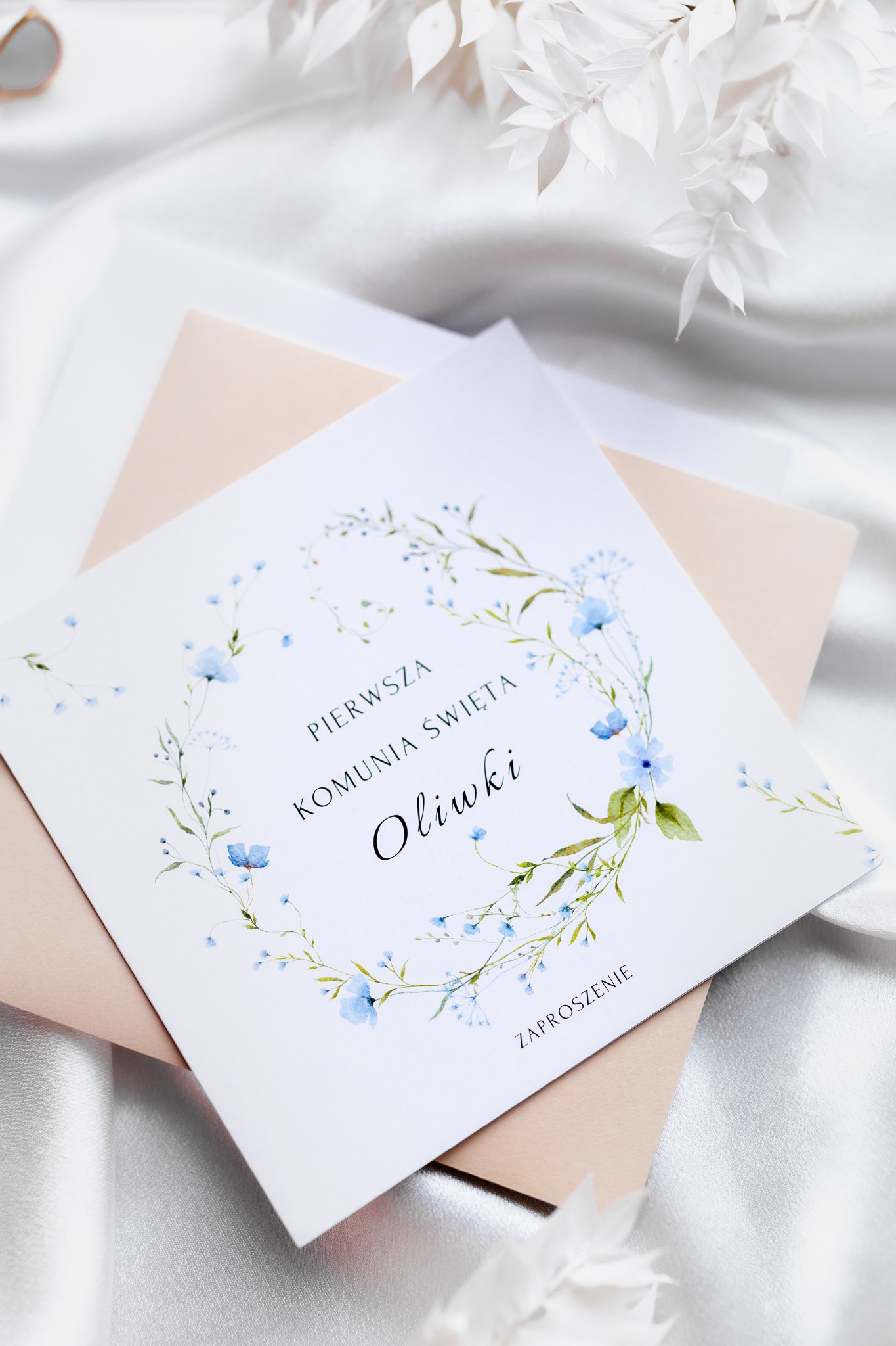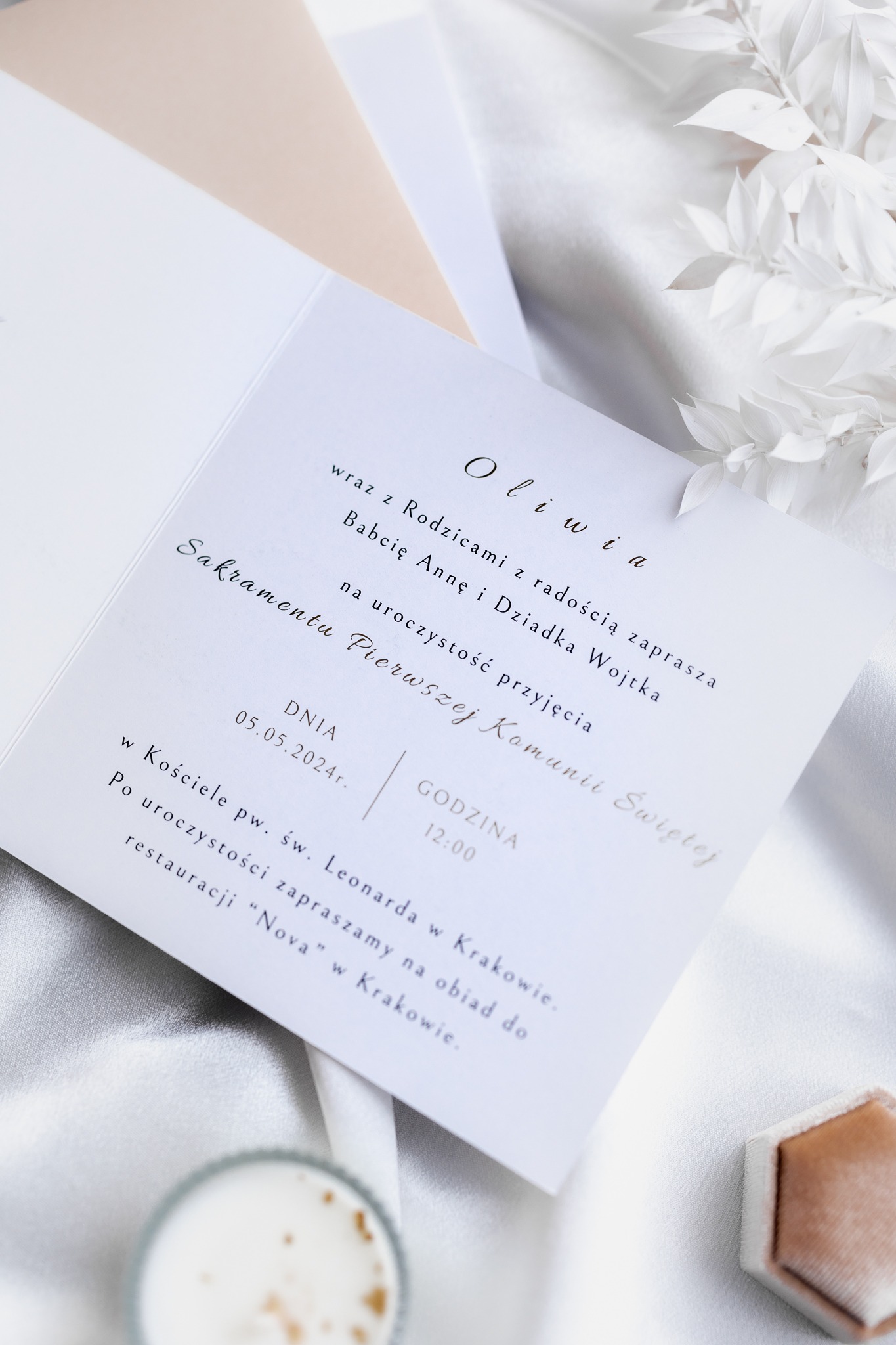 - Zakres personalizacji: imię i data na przodzie zaproszenia, imię dziecka, dane gości, godzina, adres kościoła i lokalu.