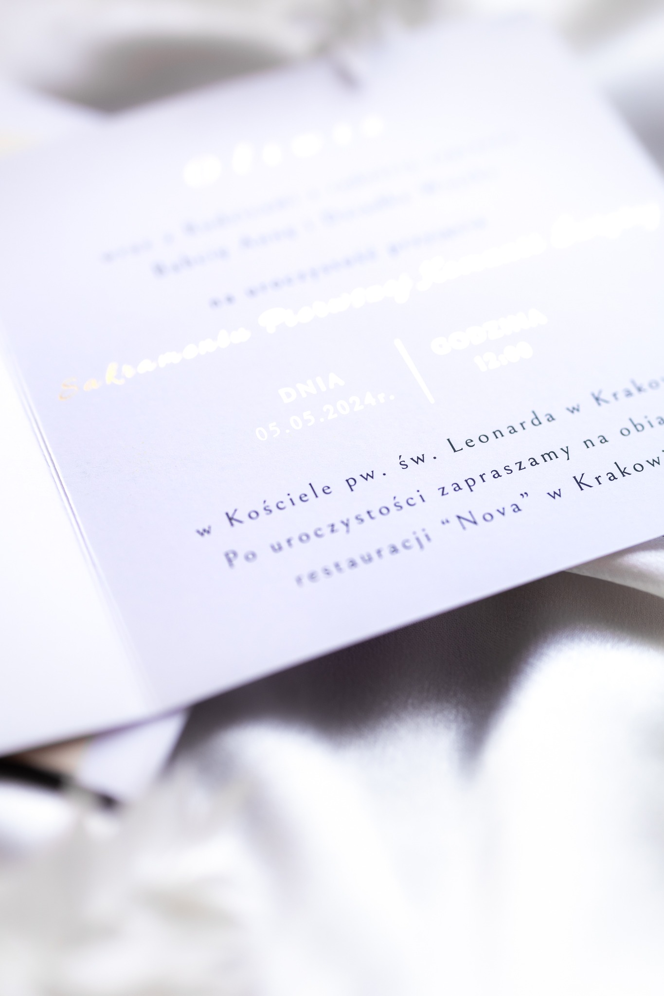 - Złocenia: środek zaproszenia zdobi złote grafika ptaka oraz złocona treść w środku (imię dziecka, rodzaj sakramentu oraz data i godzina mszy).