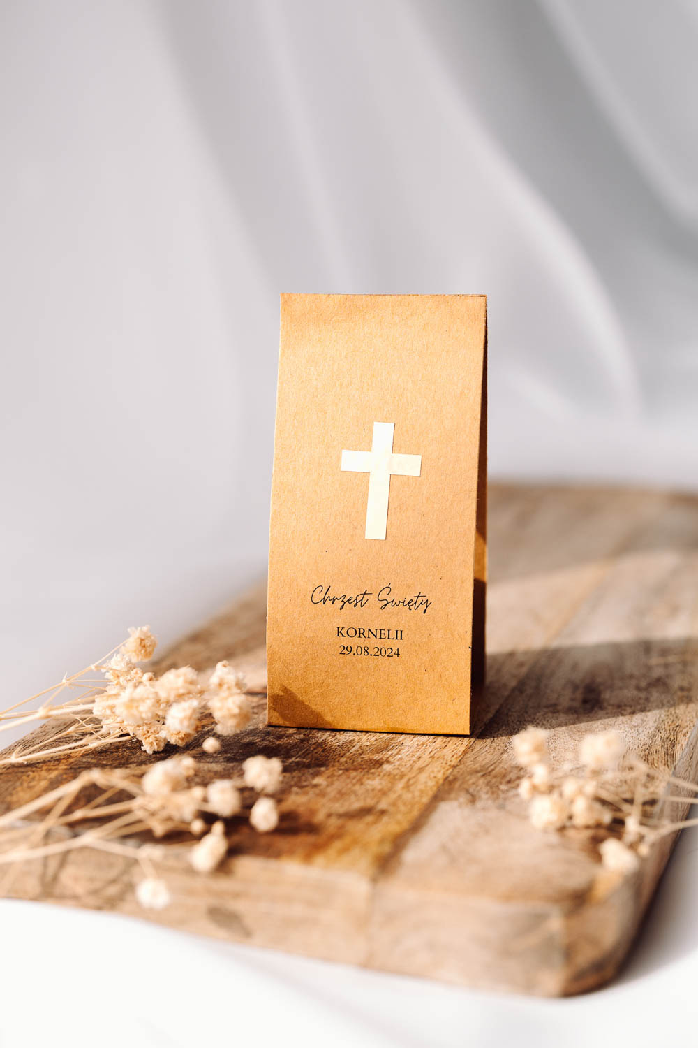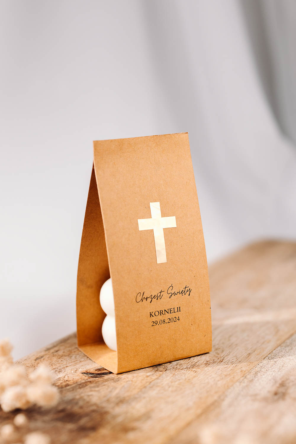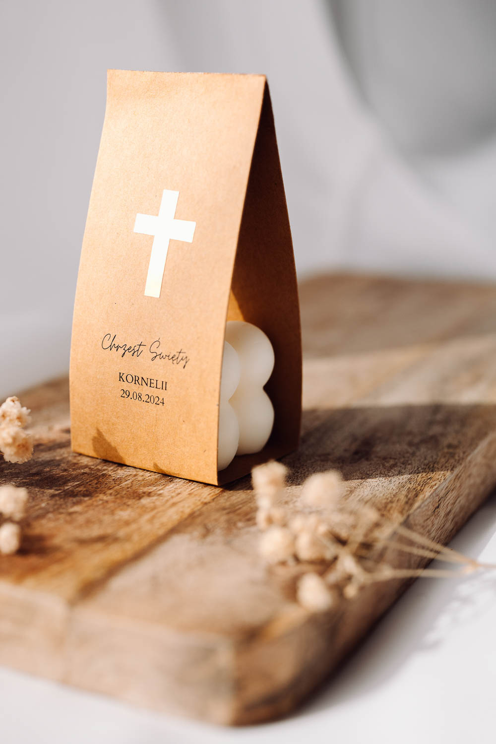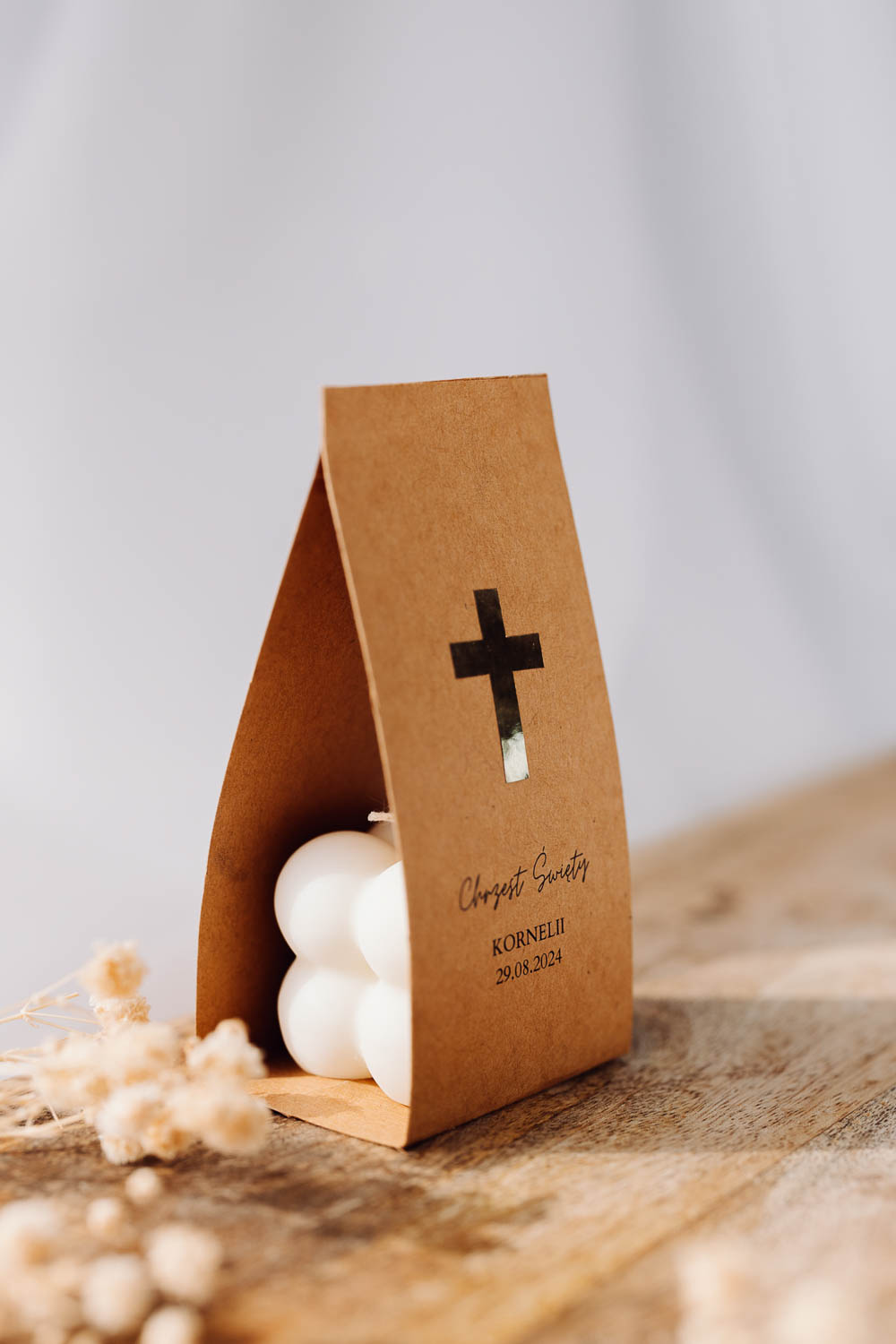 Zestaw ze zdjęcia obejmuje: świecę w kształcie bubble, opakowanie EKO papierowe z treścią oraz naklejkę w kształcie złotego krzyża. Ze względu na ręczne wykonanie, na świecy mogą wystąpić drobne niedoskonałości, które nie wpływają na jej walory. Czas realizacji to około 10 dni roboczych, jednak w okresie gorącego sezonu (maj-sierpień) czas realizacji może się wydłużyć. Zachęcamy do składania zamówień z wyprzedzeniem.