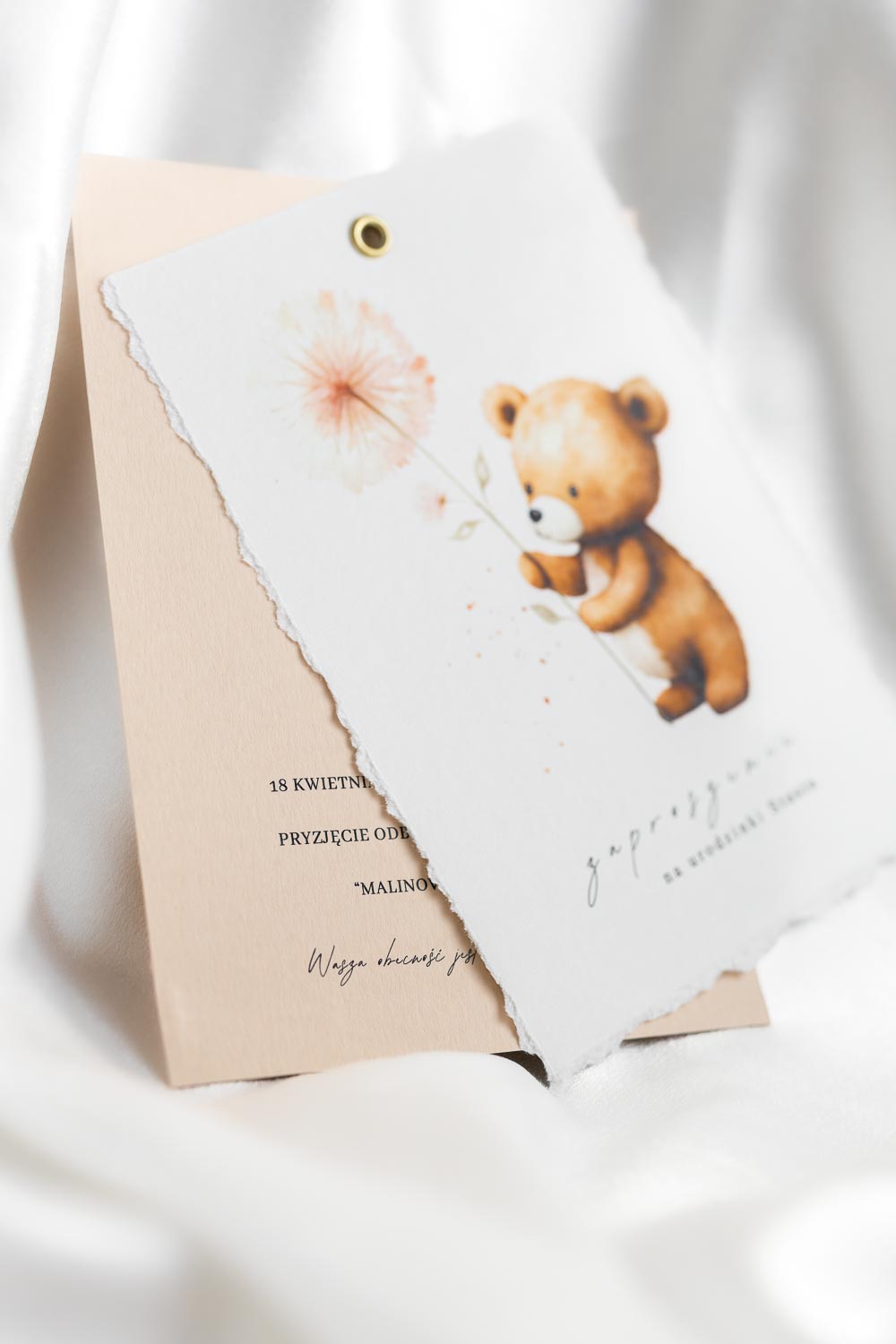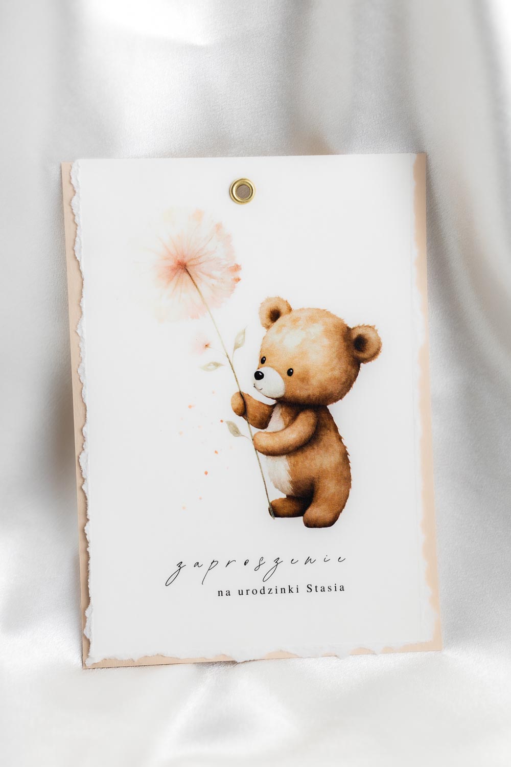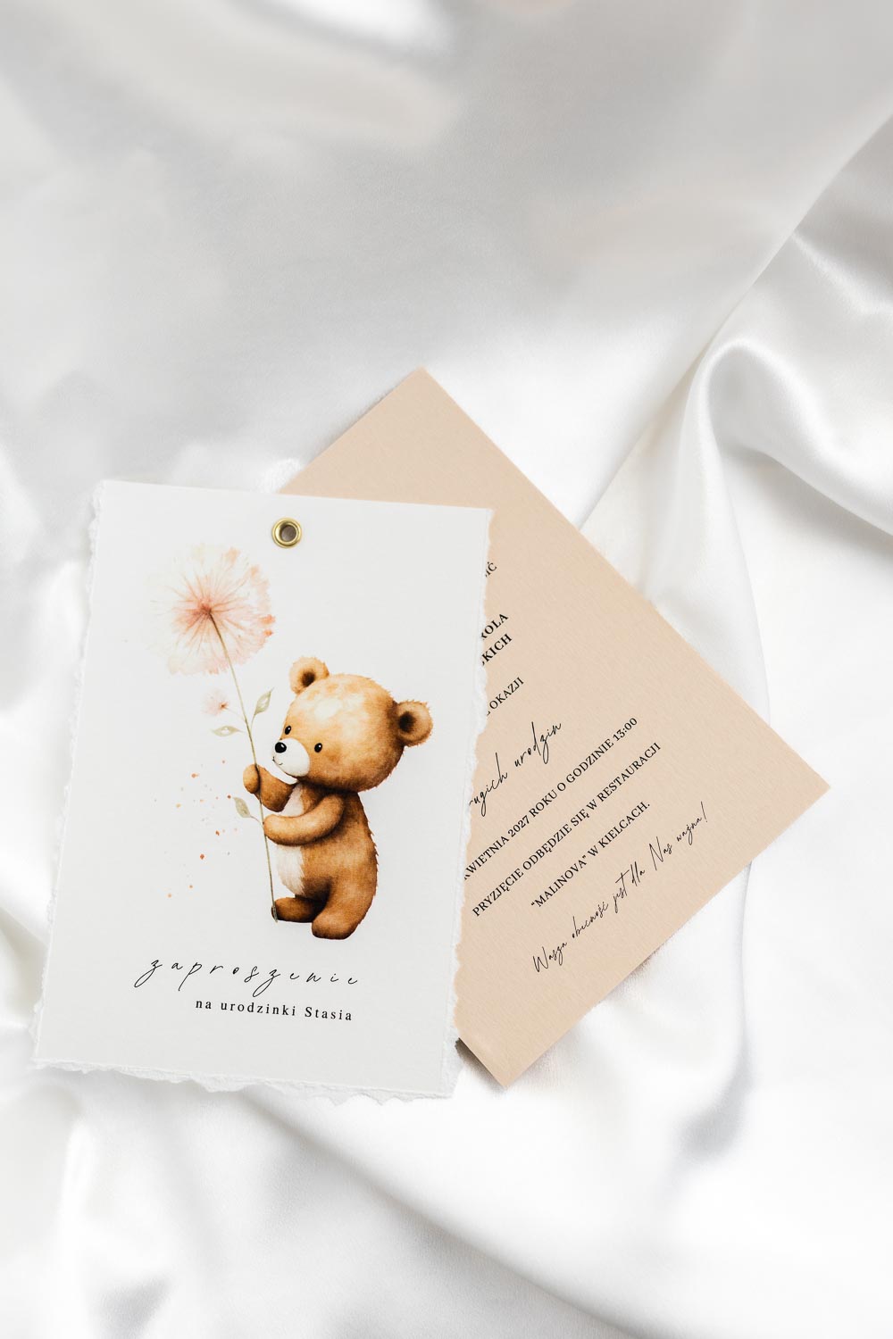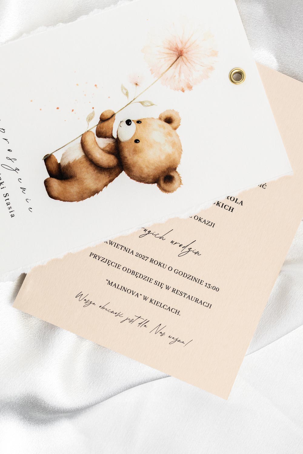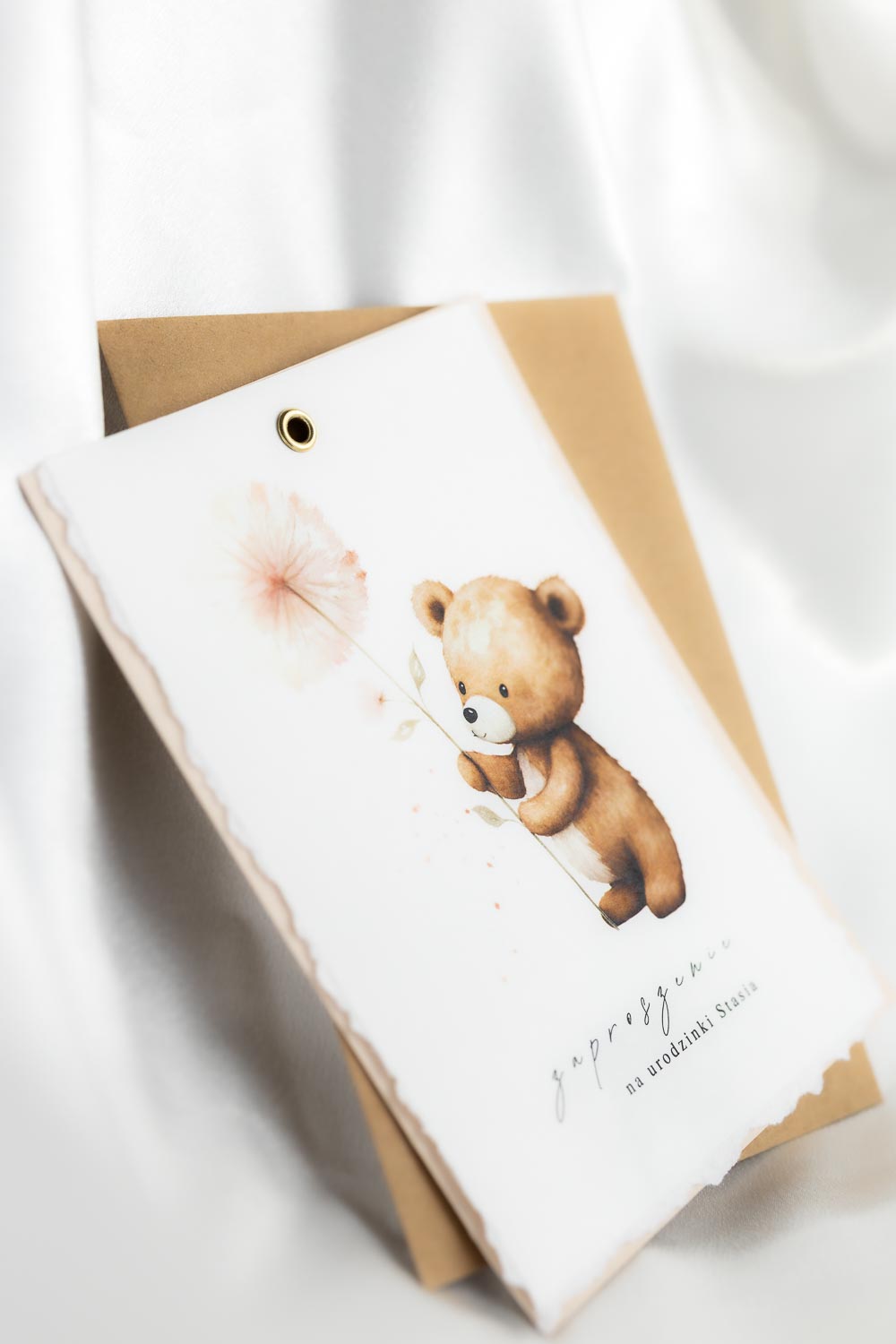 Nowoczesne zaproszenie na pierwsze i każde kolejne urodziny. Minimalistyczna forma z grafiką misia.