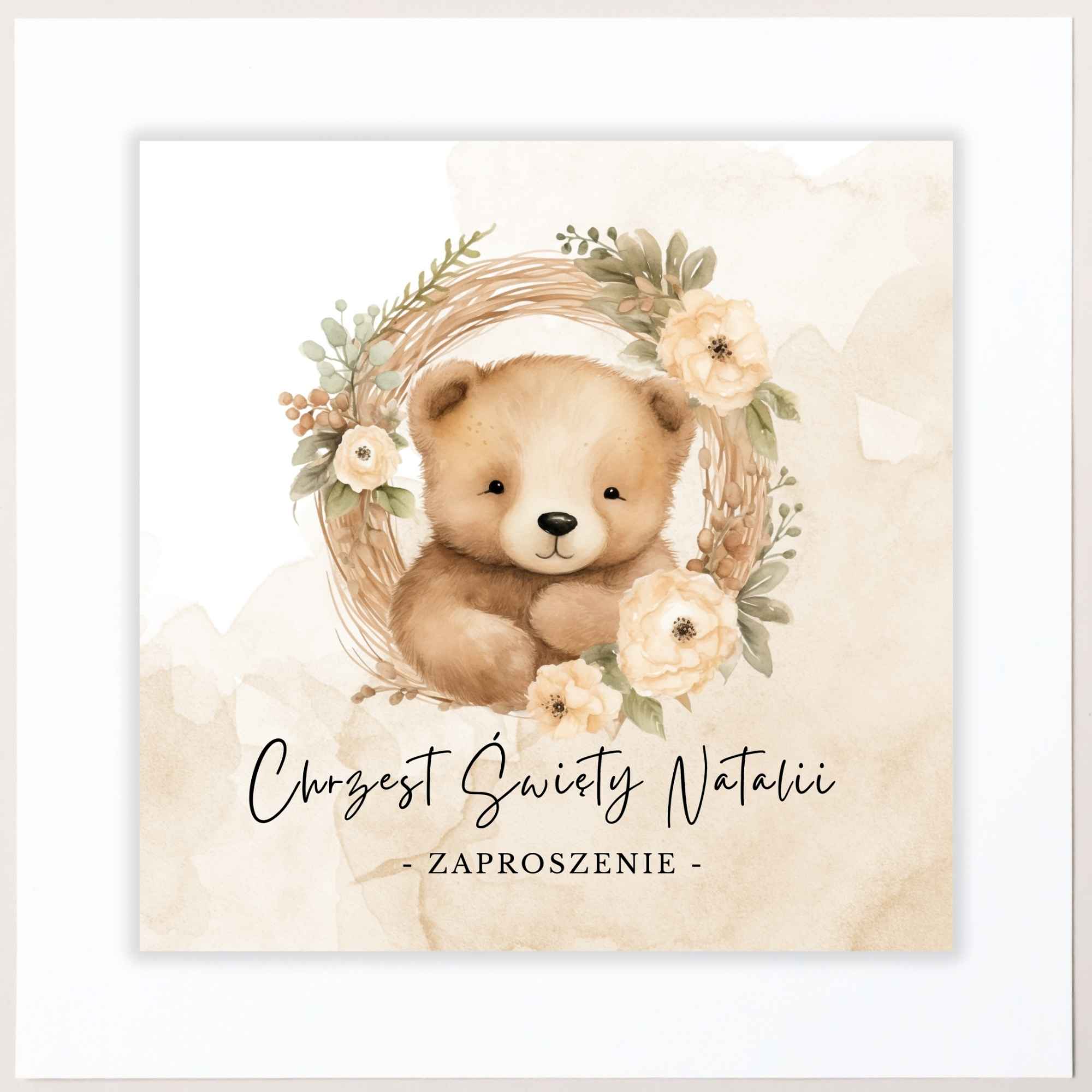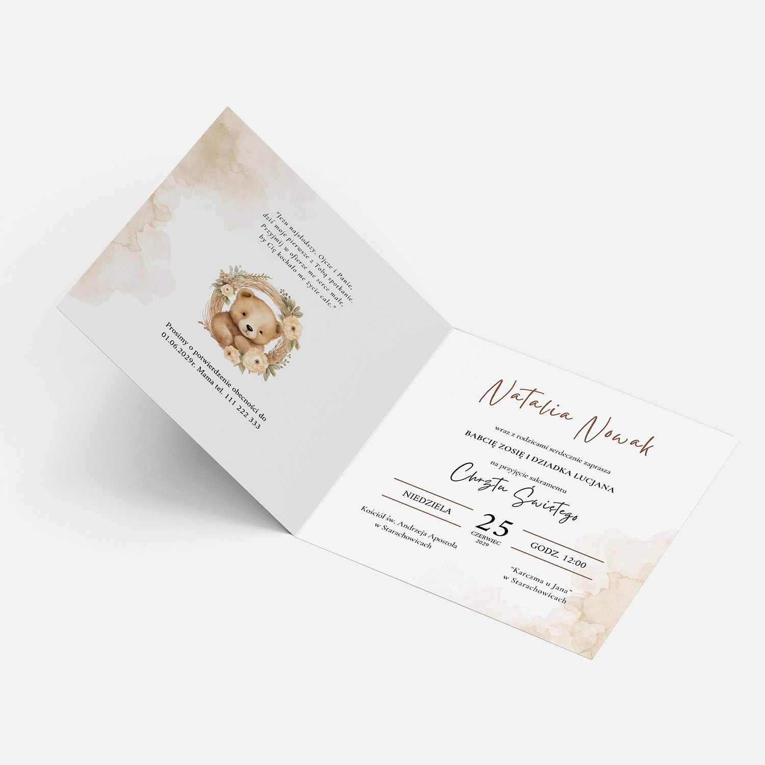 To urocze zaproszenie na Chrzest Święty z delikatnym motywem Misia pięknie podkreśli wyjątkowy charakter tej ważnej uroczystości. Eleganckie zaproszenie na chrzest łączy klasyczny styl z nowoczesną subtelnością. Personalizowane zaproszenie na chrzest święty będzie wyjątkową pamiątką i eleganckim sposobem zaproszenia bliskich na tę szczególną okazję.