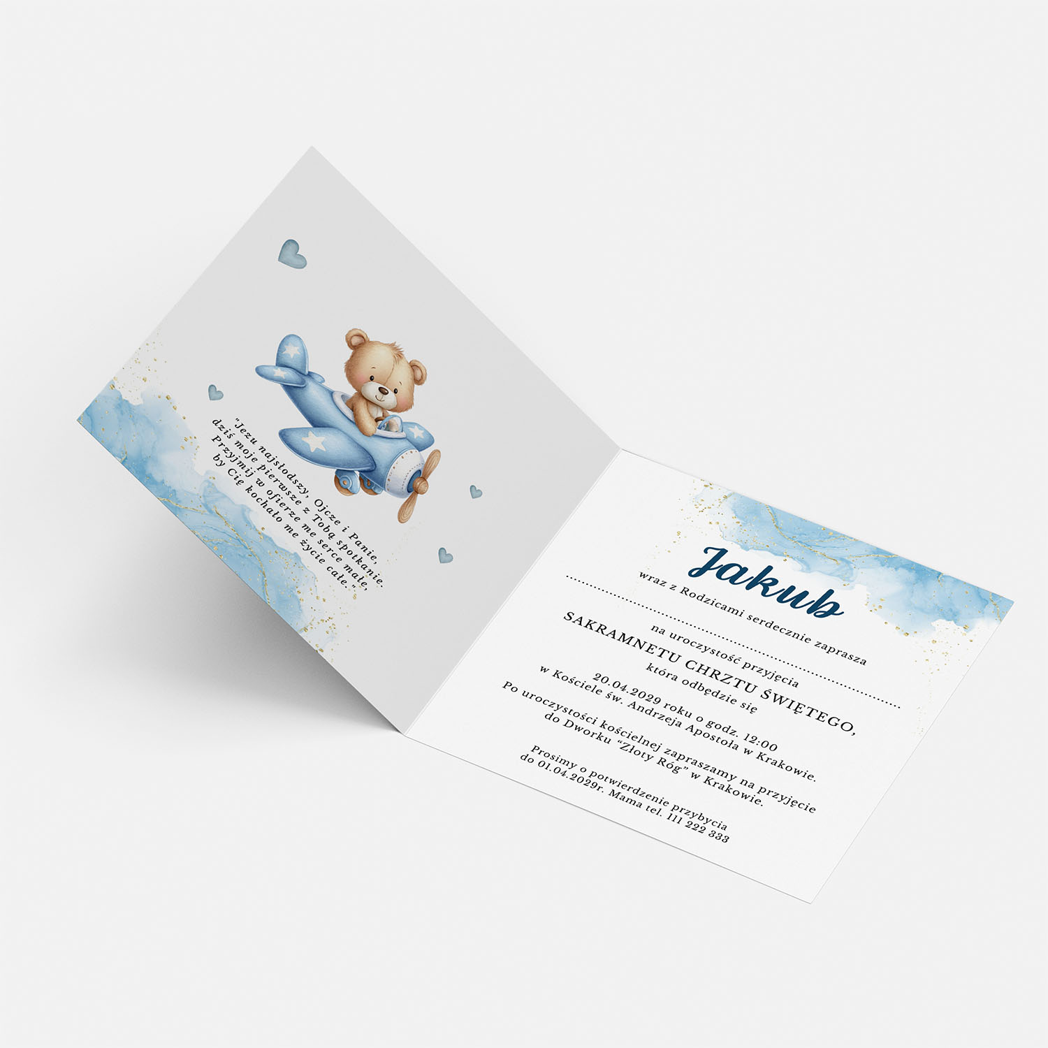 - Zakres personalizacji: imię i data na przodzie zaproszenia, imię dziecka, dane gości, godzina, adres kościoła i lokalu.