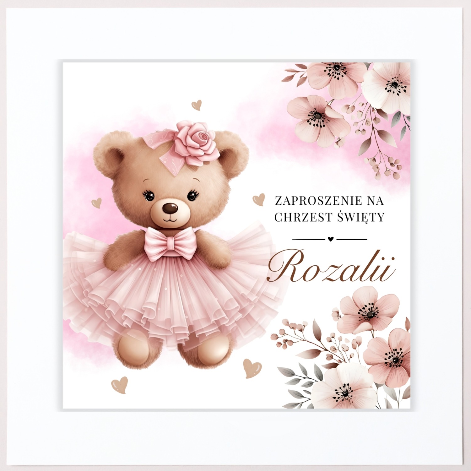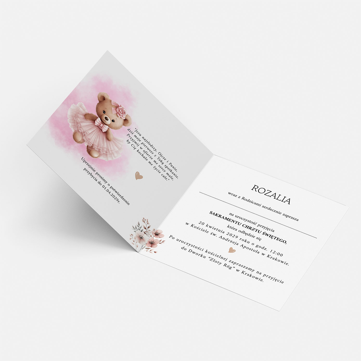 • Zakres personalizacji: imię i data na przodzie zaproszenia, imię dziecka, dane gości, godzina, adres kościoła i lokalu.
