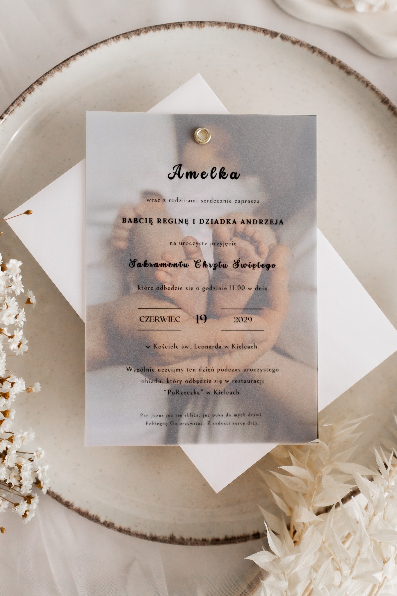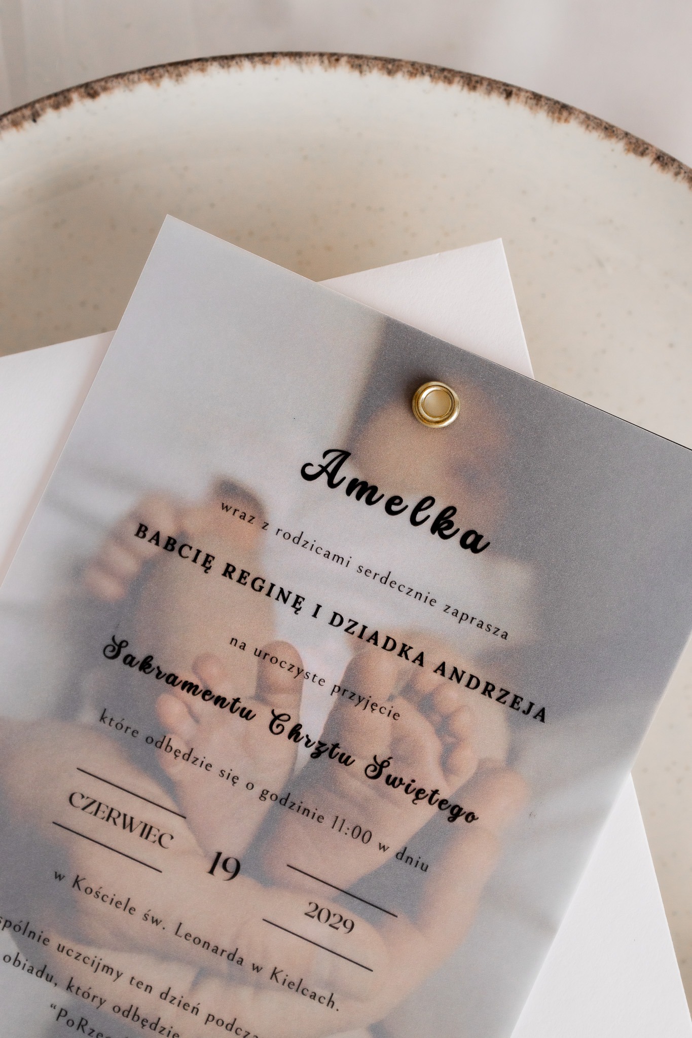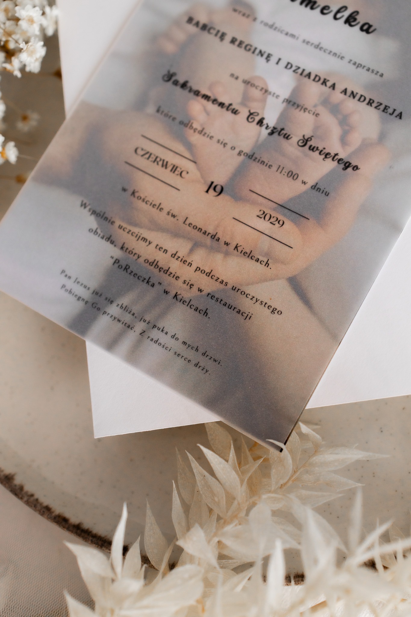 Nowoczesne zaproszenie na Chrzest Święty w minimalistycznej formie z transparentną kalką.