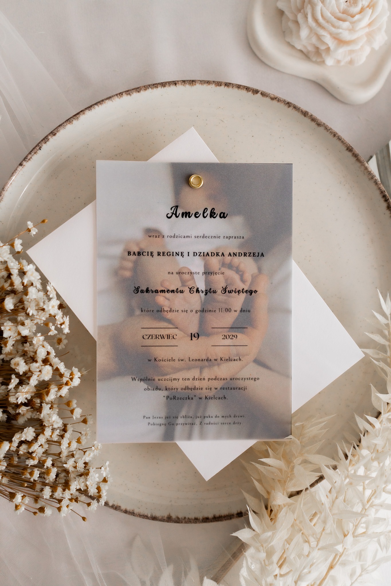 Minimalistyczne i eleganckie zaproszenie na Chrzest Święty, które łączy subtelność z osobistym akcentem.