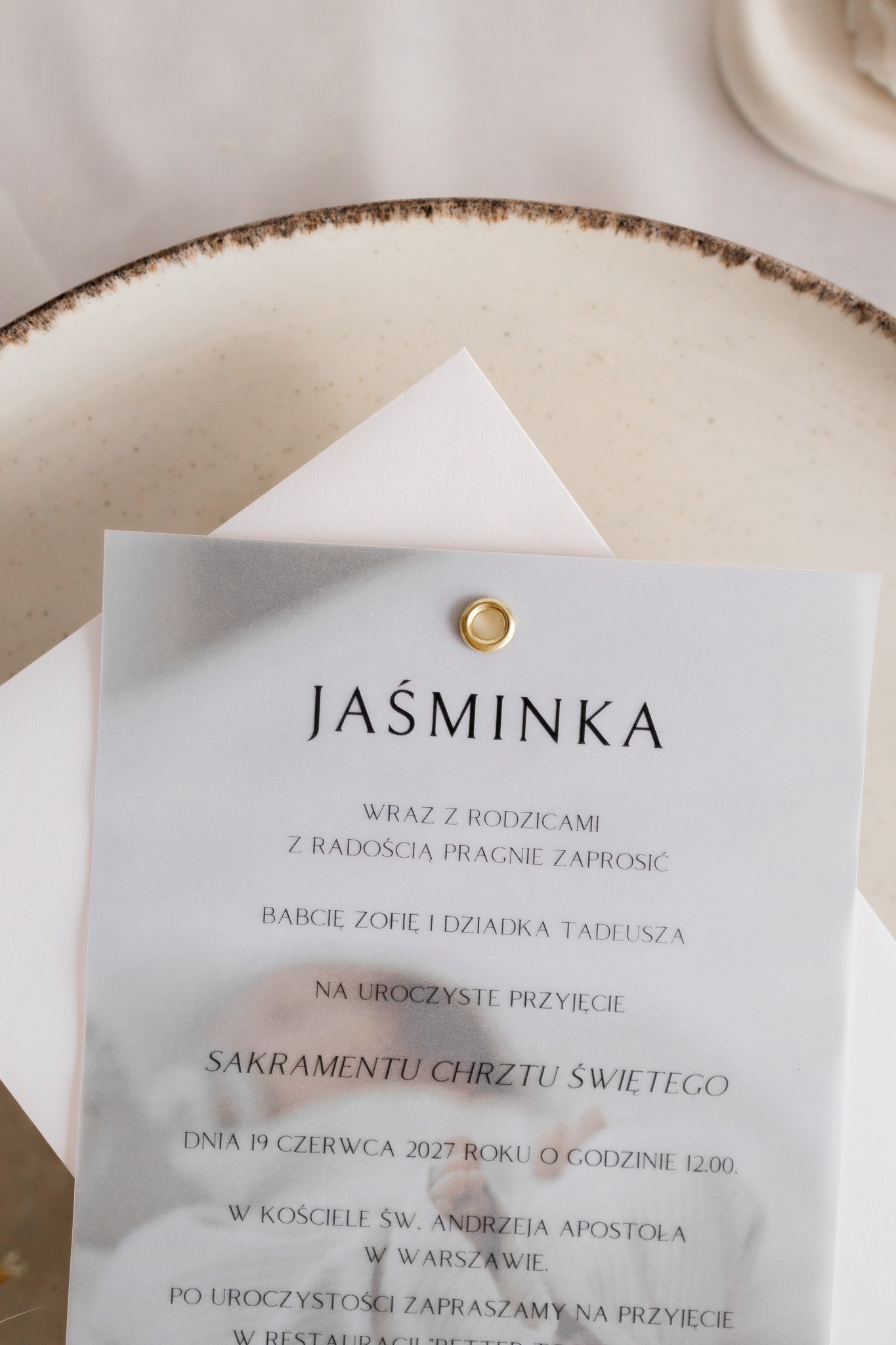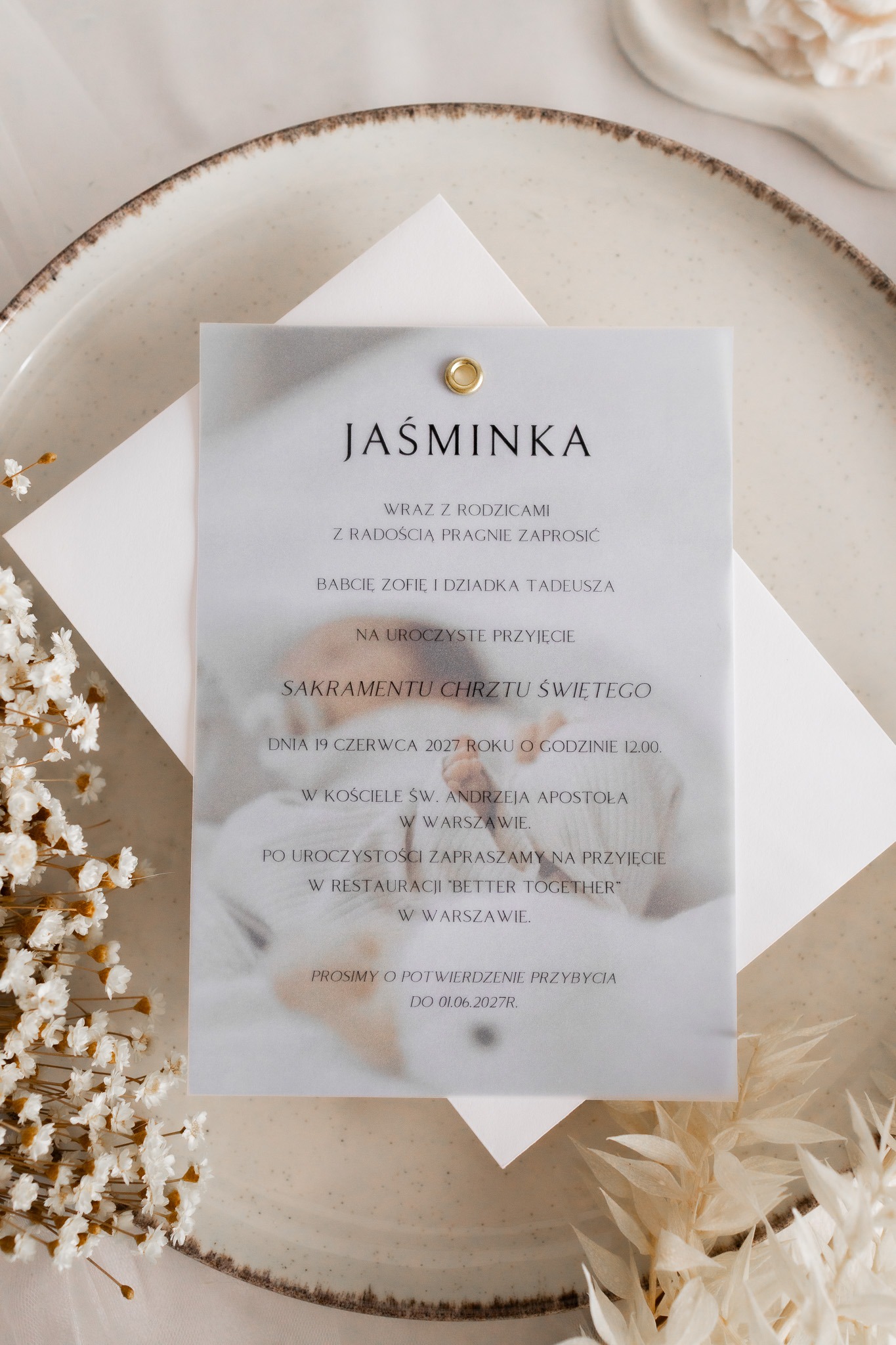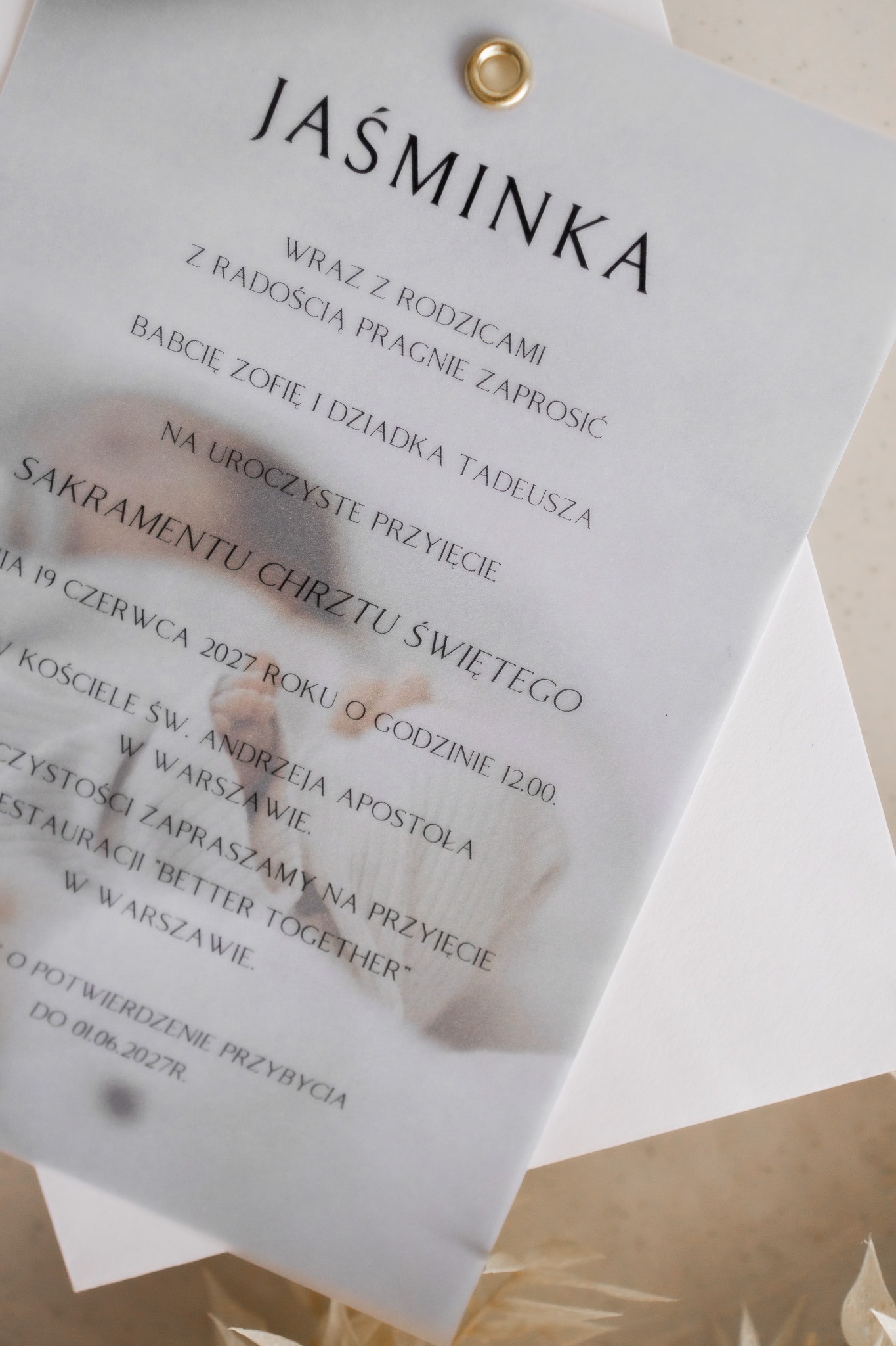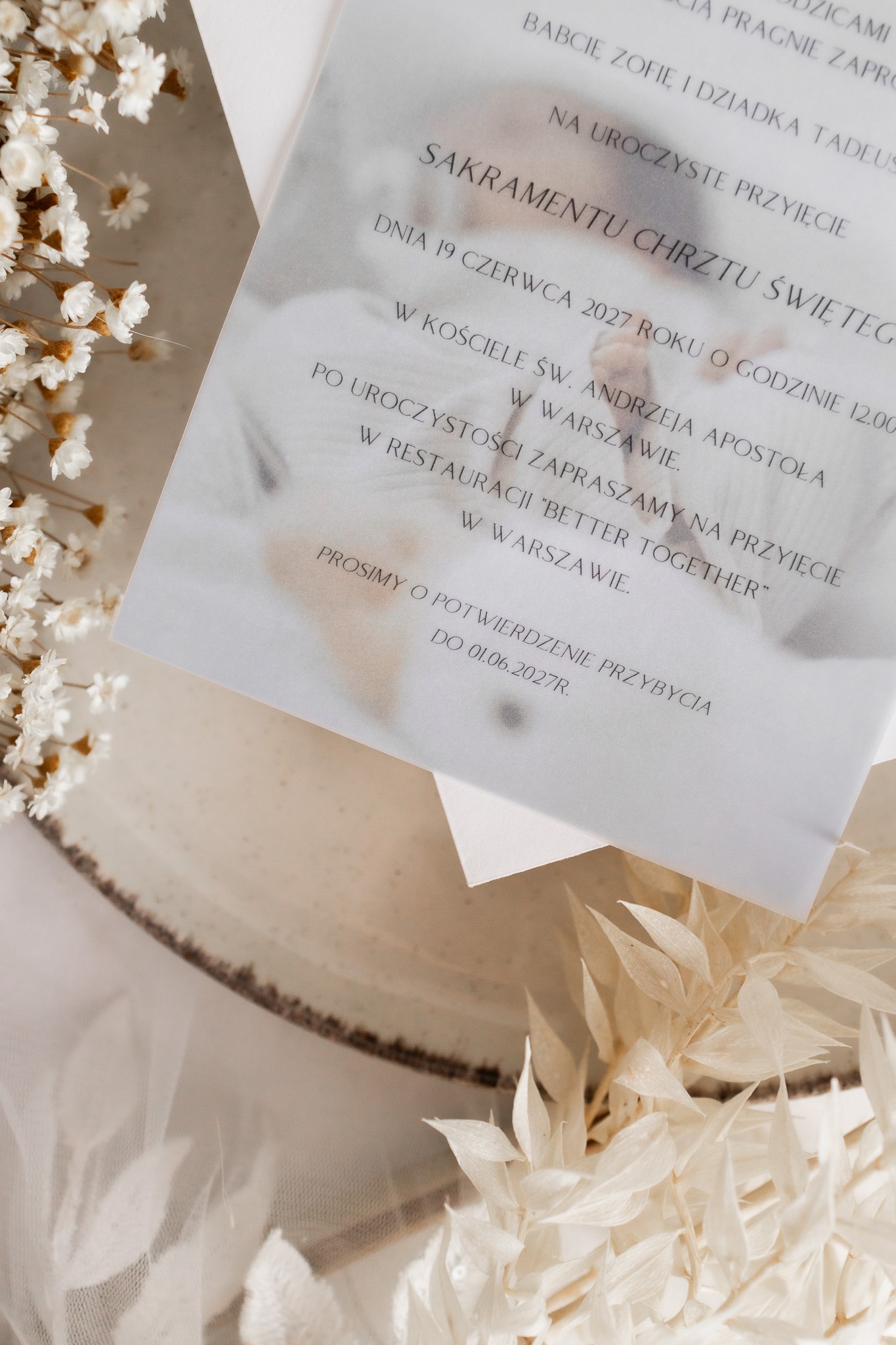 Nowoczesne zaproszenie na Chrzest Święty w minimalistycznej formie z transparentną kalką.