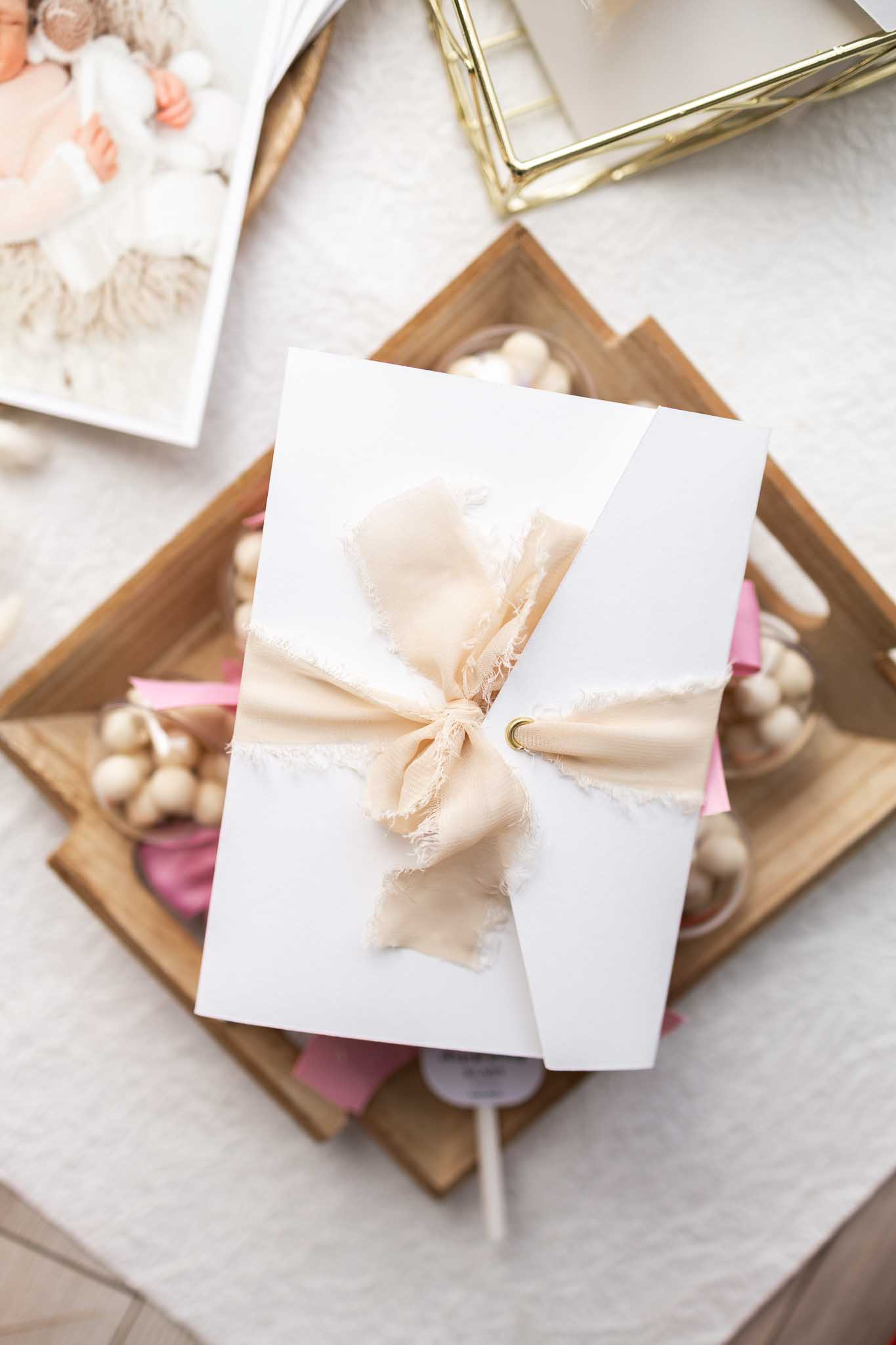 W centrum zaproszenia znajduje się wklejone zdjęcie maluszka, które czyni projekt osobistym i niepowtarzalnym. Złocona treść dodaje uroczystości podniosłego tonu, a delikatna szyfonowa wstążka subtelnie dopełnia całość. Kolor folderu to delikatna, złamana biel.