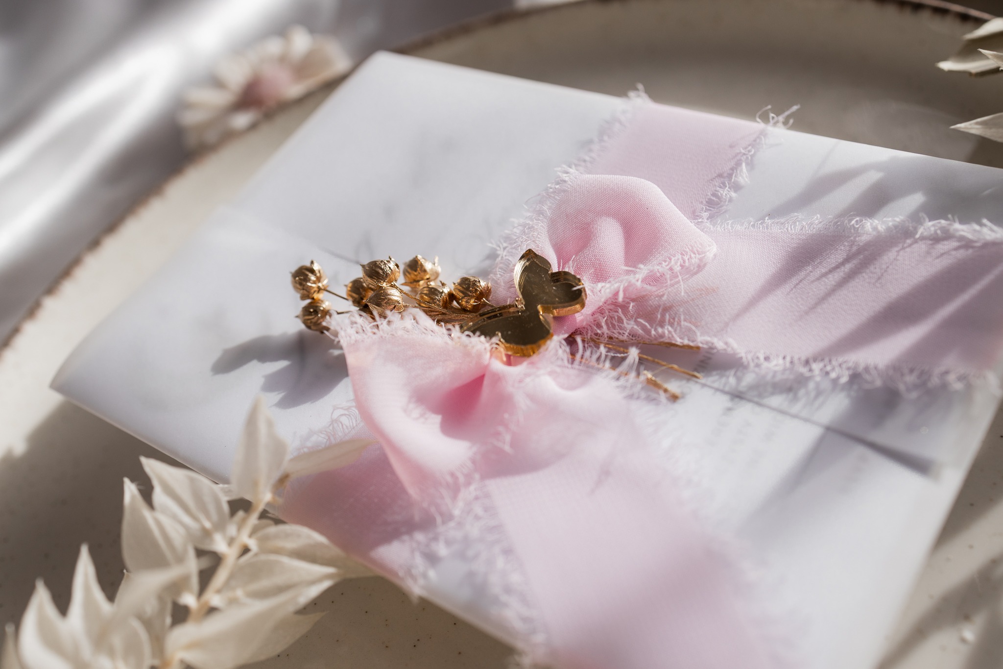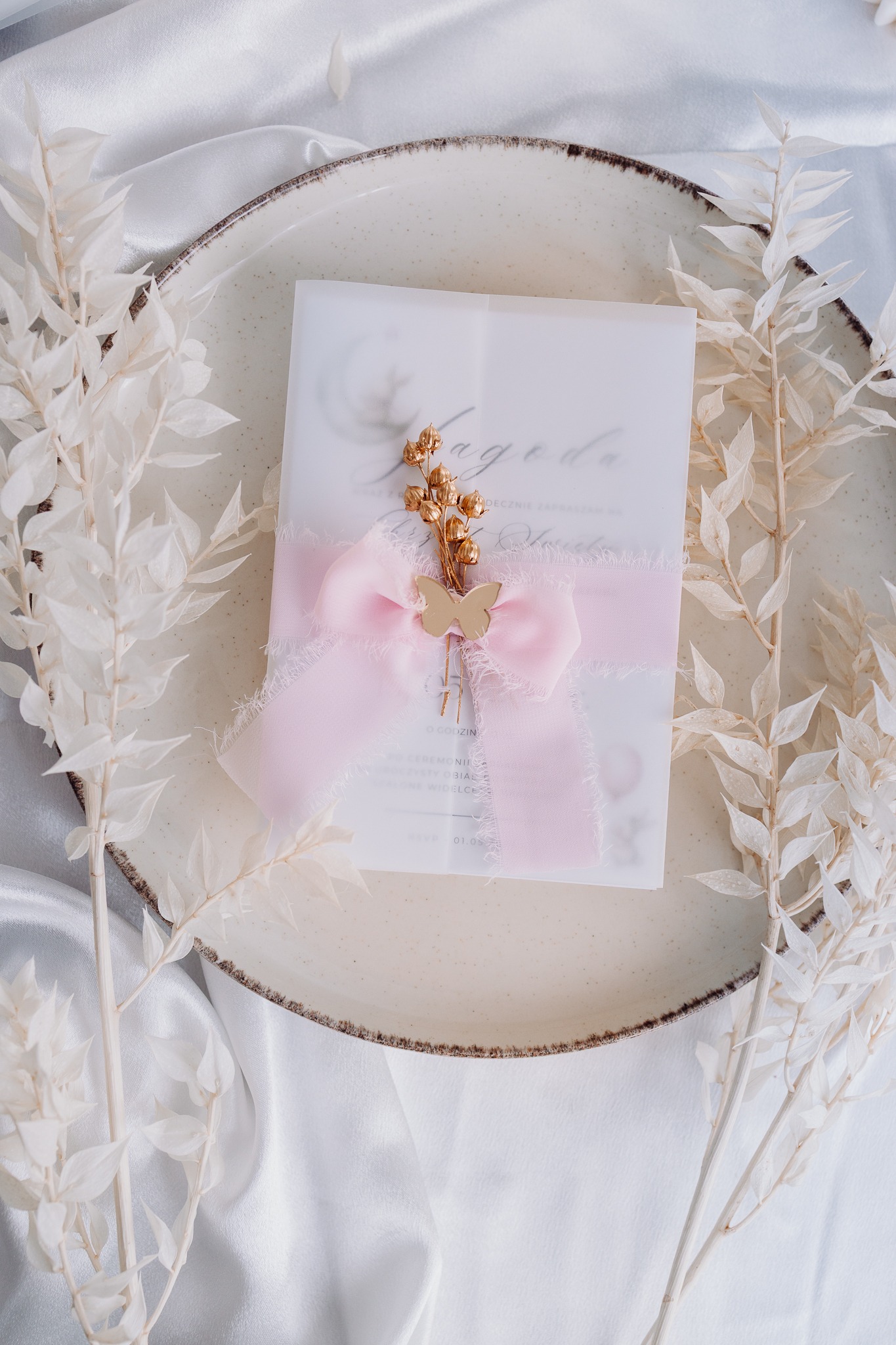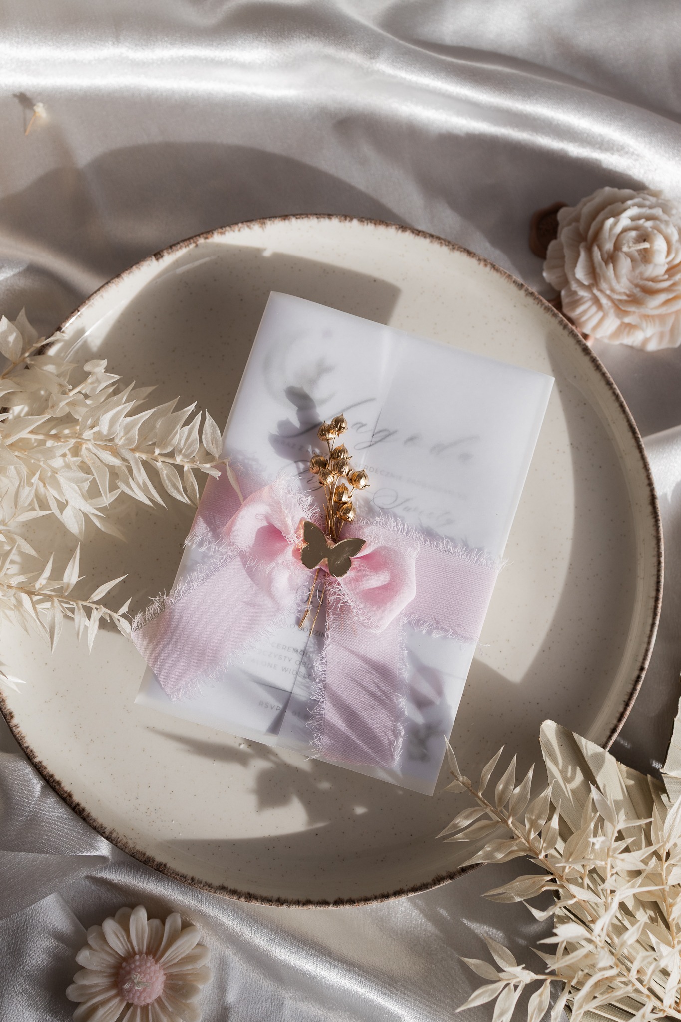 Każde zaproszenie tworzone jest z najwyższą dbałością o detale — od wyboru papieru, przez delikatną kompozycję kwiatka, po starannie wykonany złoty element. Transparentna kalka subtelnie otula treść, nadając całości efektu lekkości i elegancji.