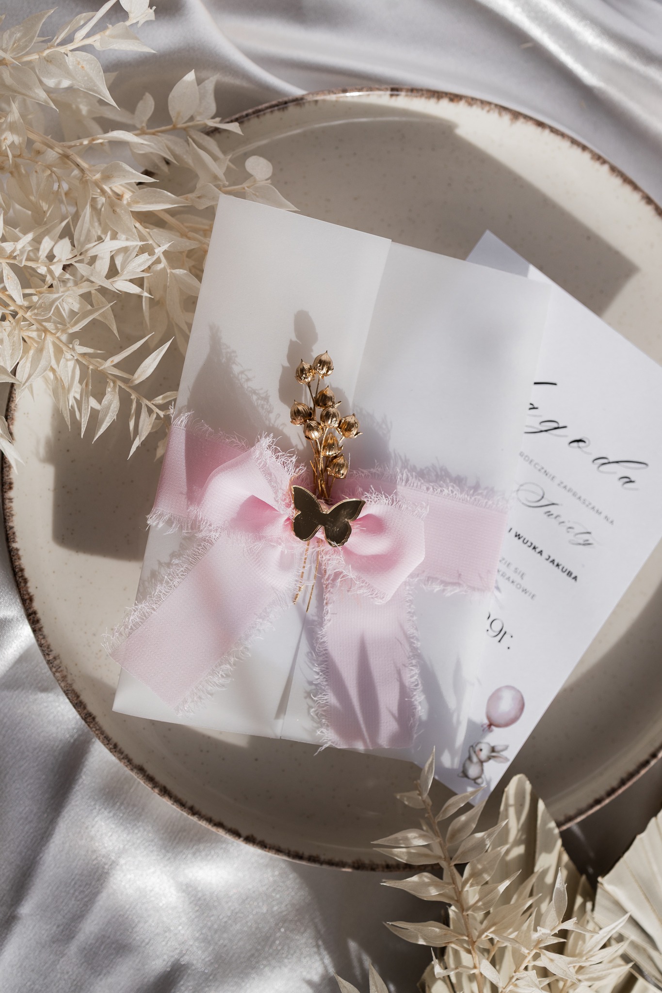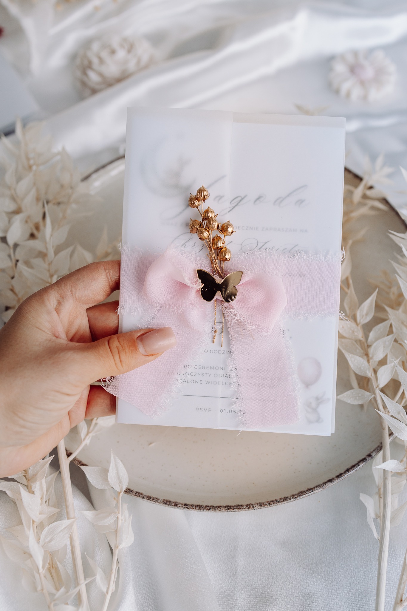 Subtelne i eleganckie zaproszenie komunijne, które zachwyca delikatnością i starannym wykończeniem. Jednokartkowy projekt włożony w półprzezroczystą owijkę z kalki i wstążkę szyfonową, ozdobiony suszonym kwiatkiem i złotym elementem — to połączenie klasy i naturalnego uroku, idealne na tak wyjątkową uroczystość jak Pierwsza Komunia Święta