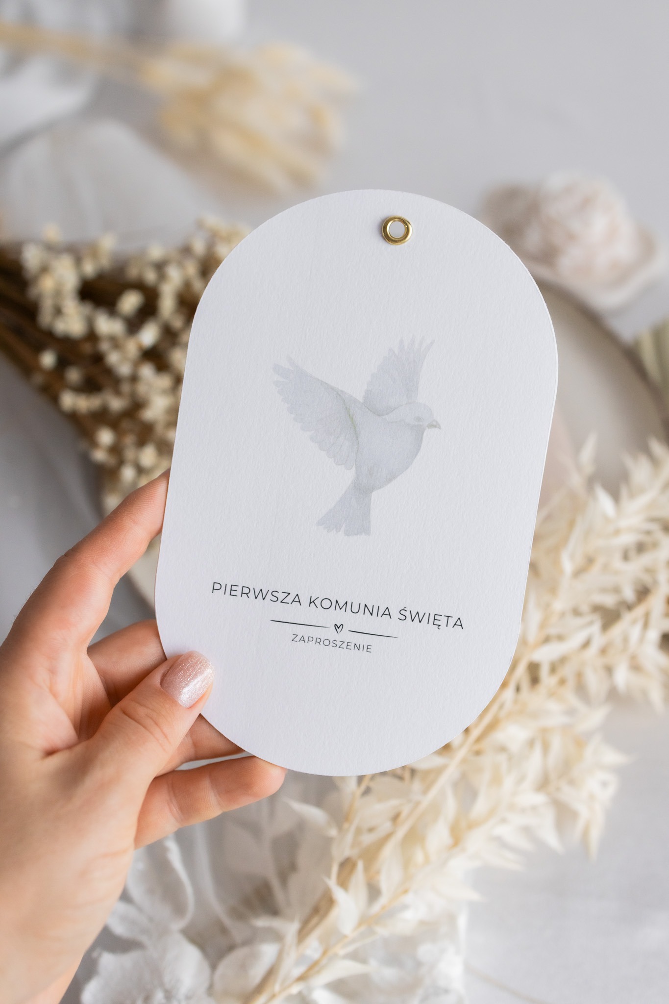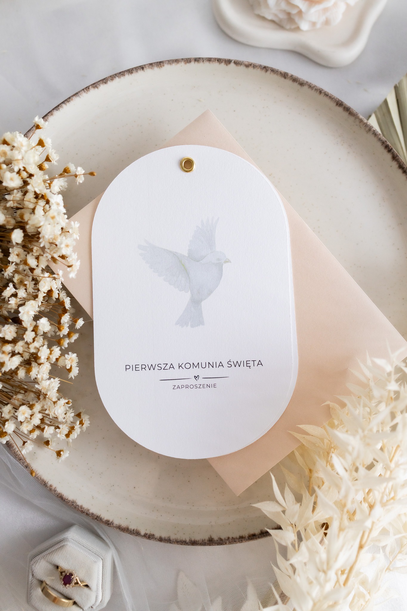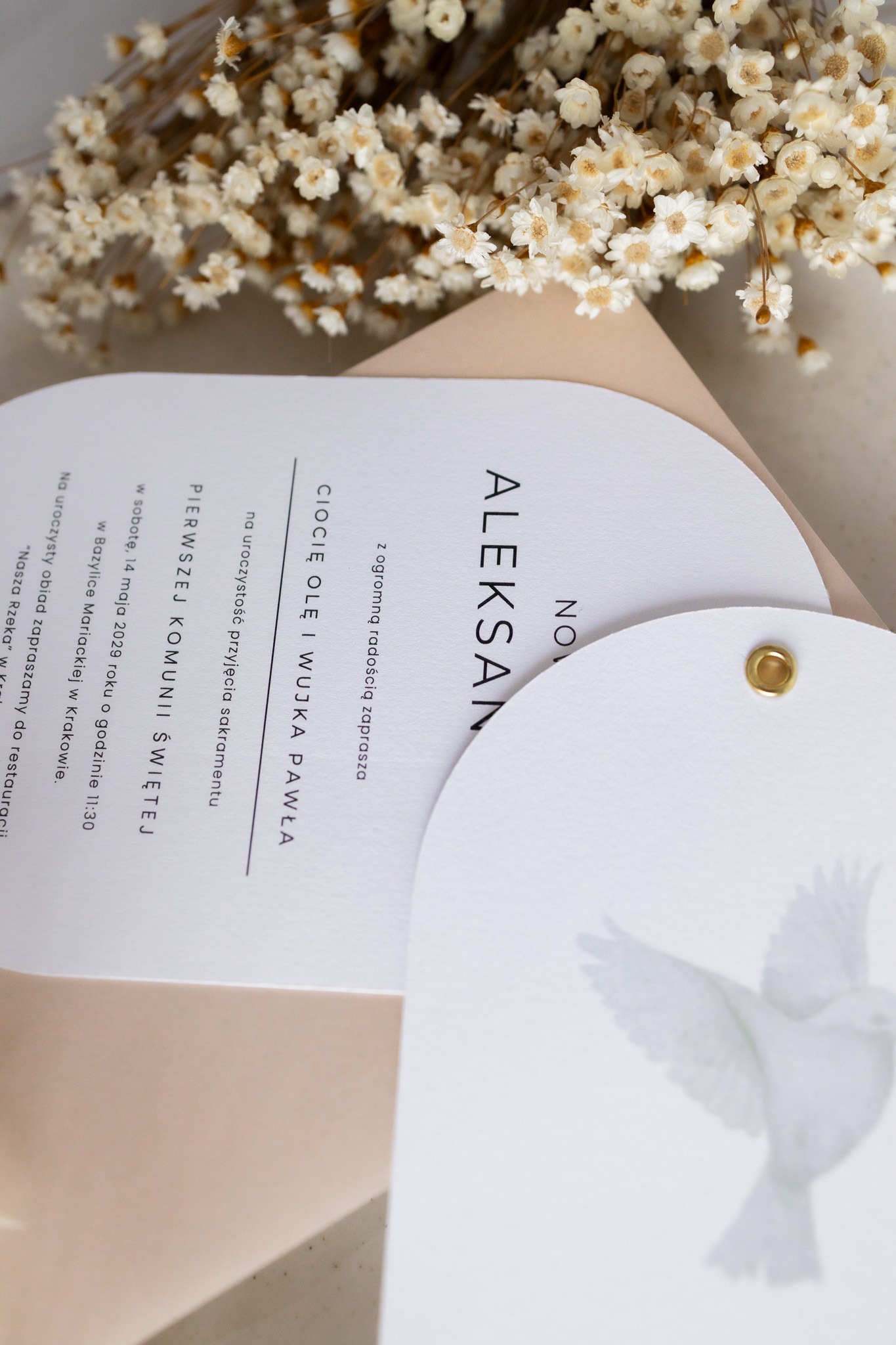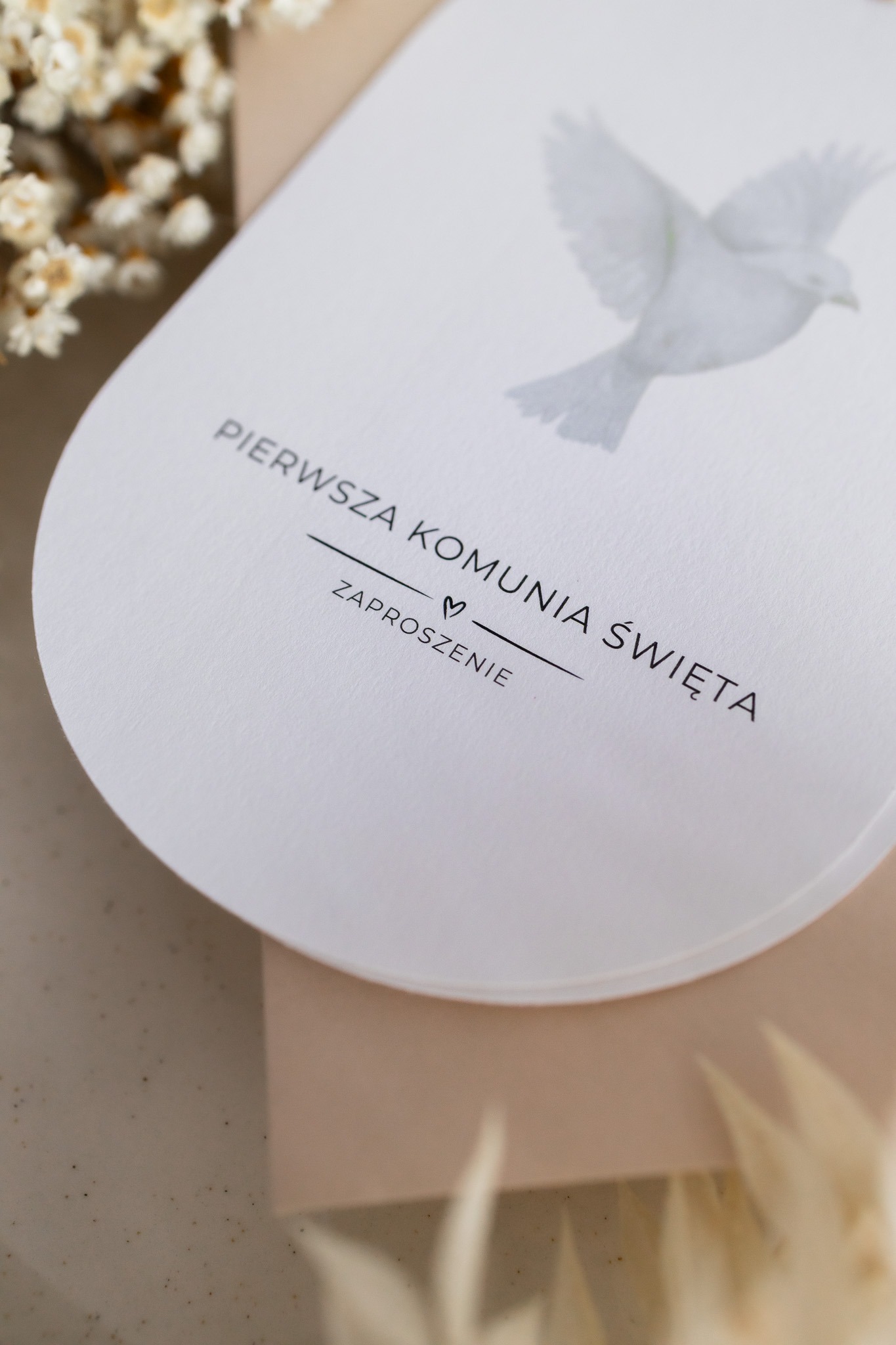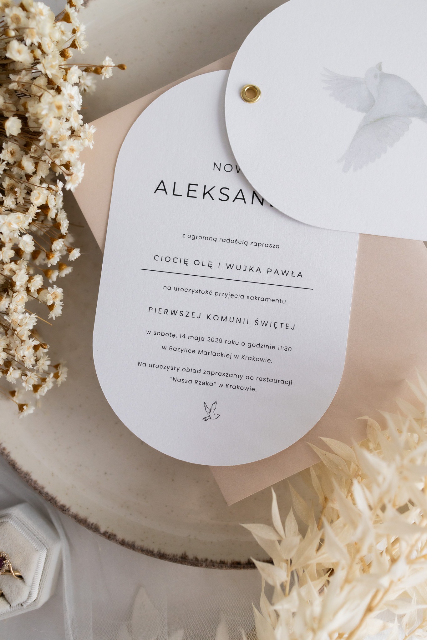 Minimalistyczne i eleganckie zaproszenie na Pierwszą Komunię Świętą, które łączy subtelność z osobistym akcentem.