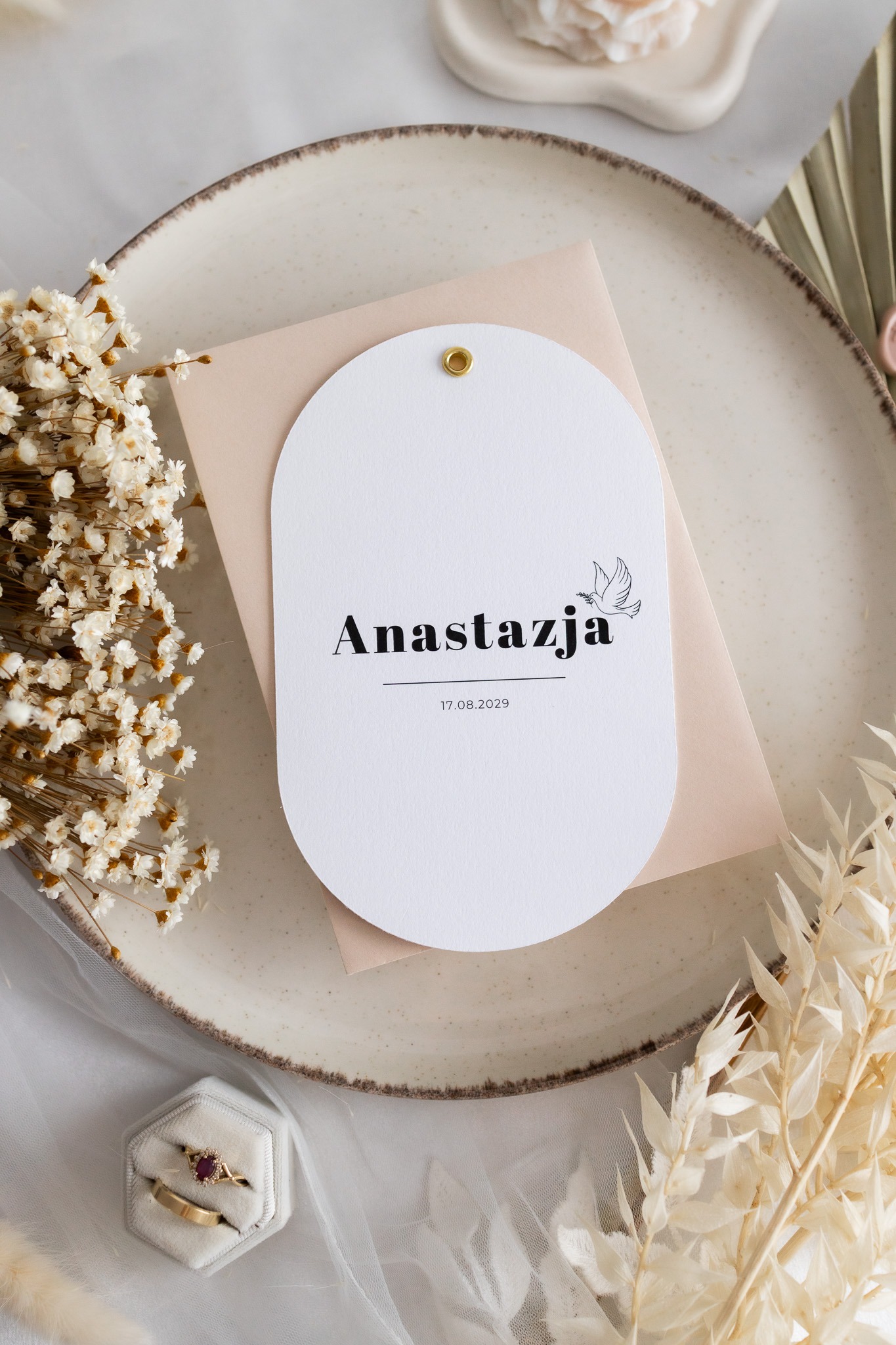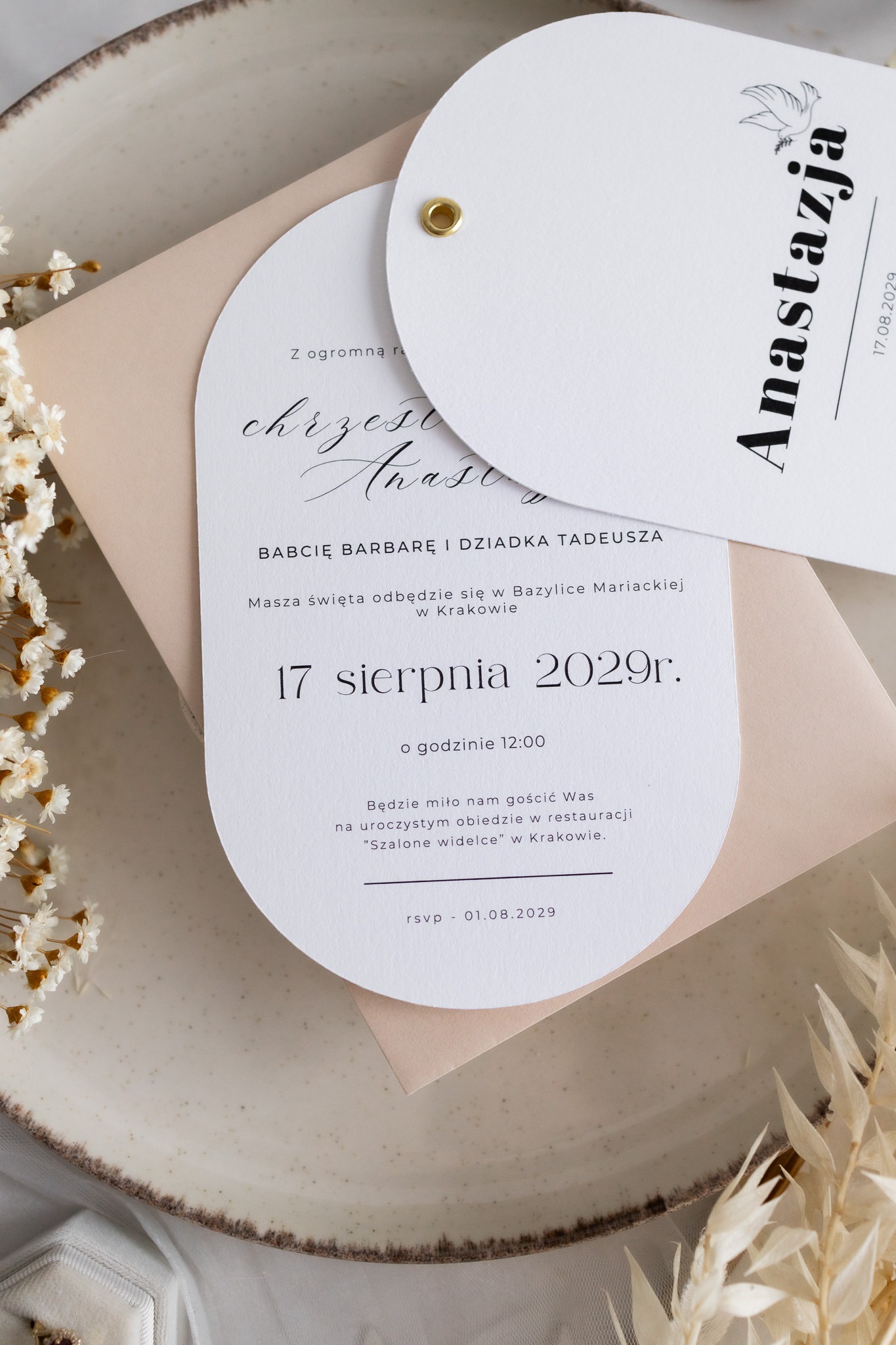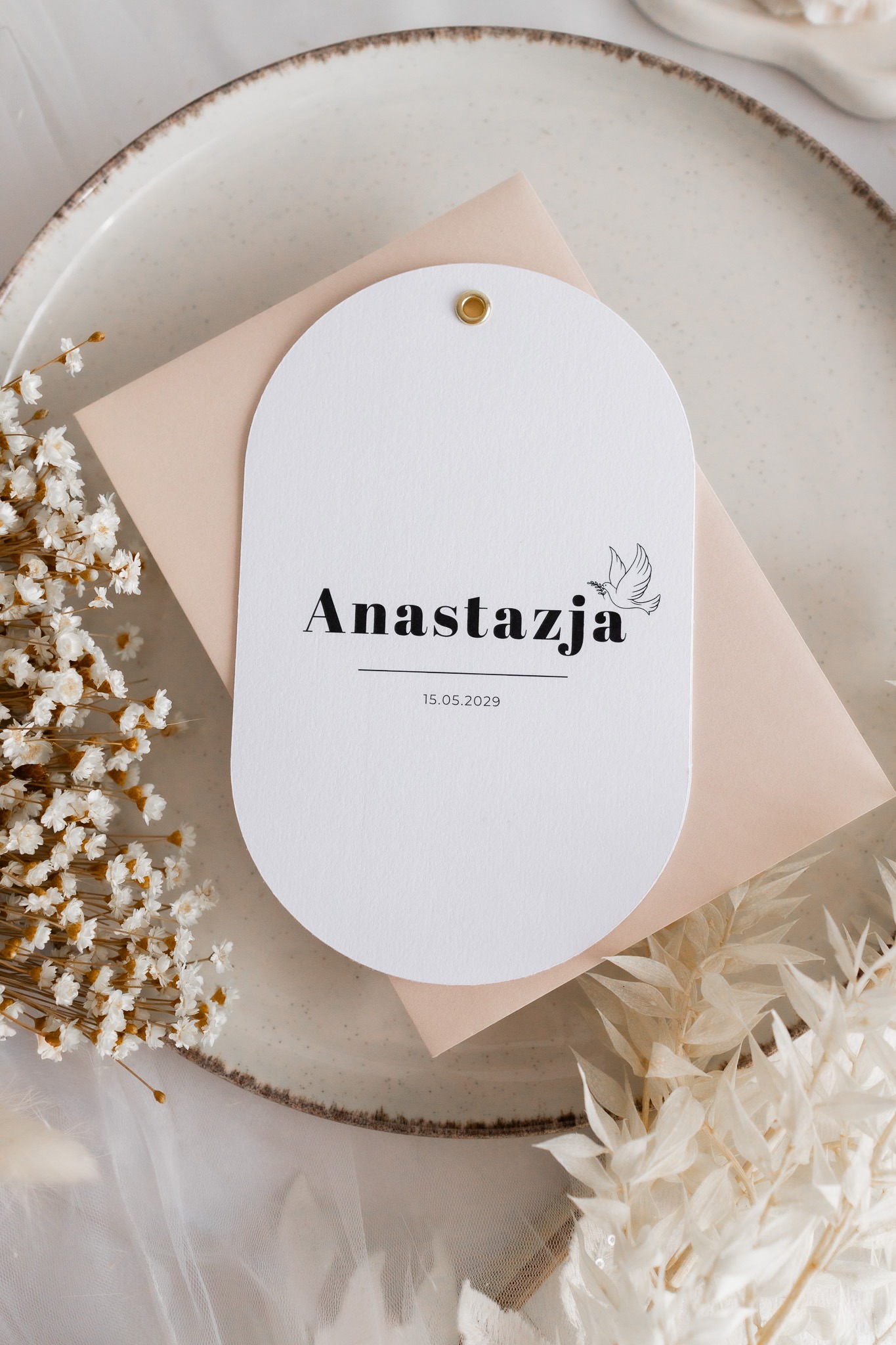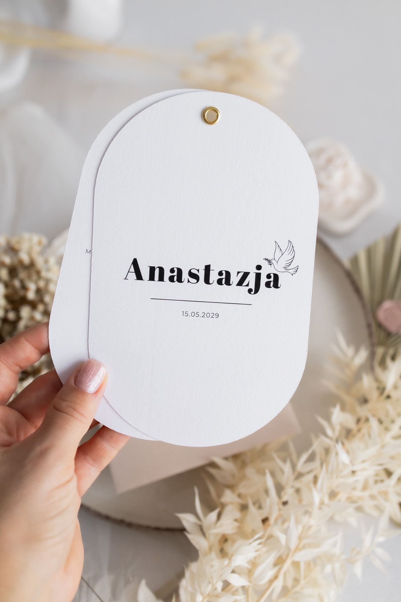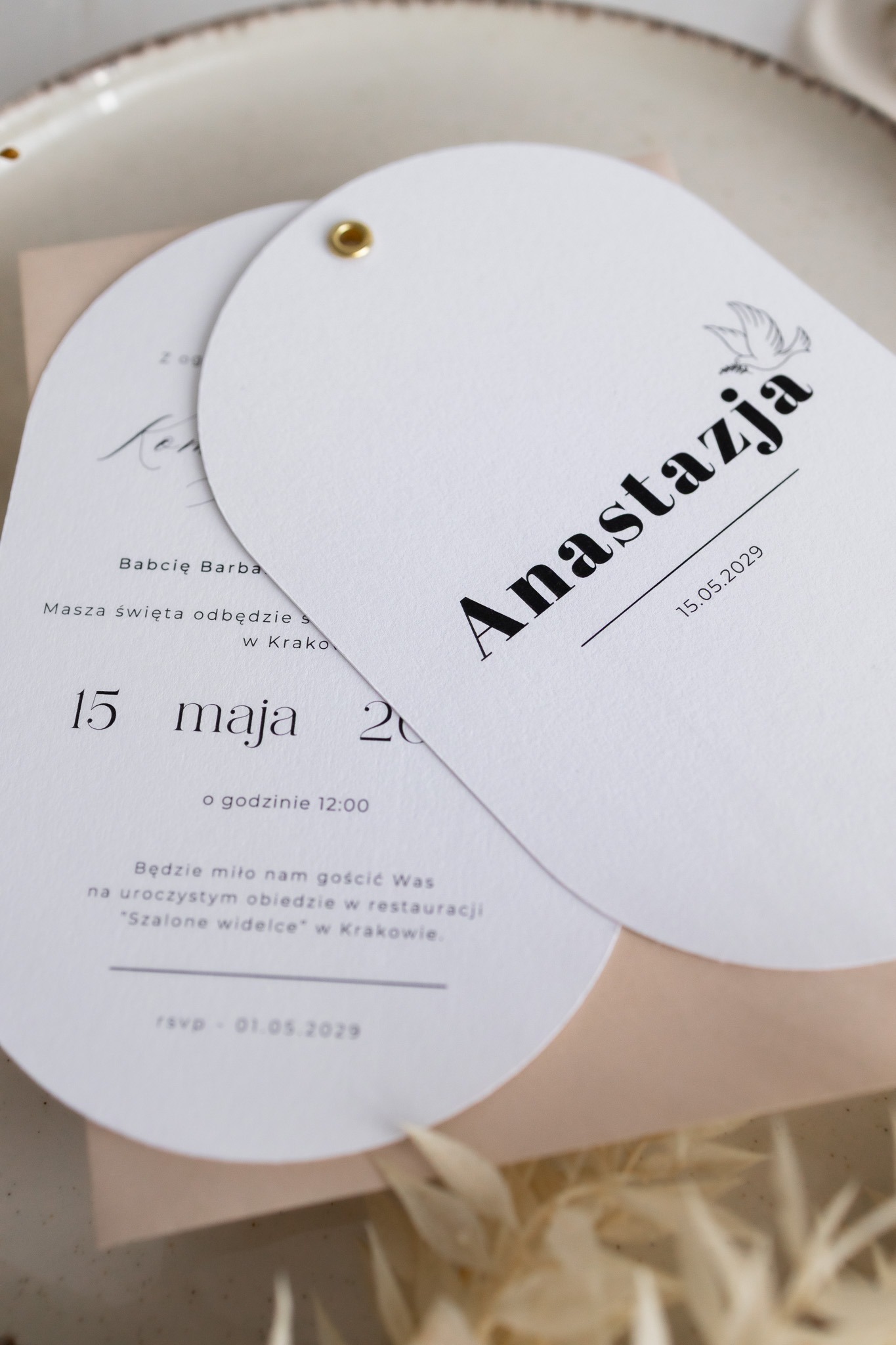 Wyjątkowe zaproszenia w kształcie owalu to idealny wybór dla rodziców, którzy szukają eleganckiej, a zarazem oryginalnej papeterii na wyjątkową uroczystość. Każde zaproszenie wykonane jest na wysokiej jakości, fakturowanym papierze o gramaturze 300 g, który pięknie podkreśla delikatny charakter wydarzenia.