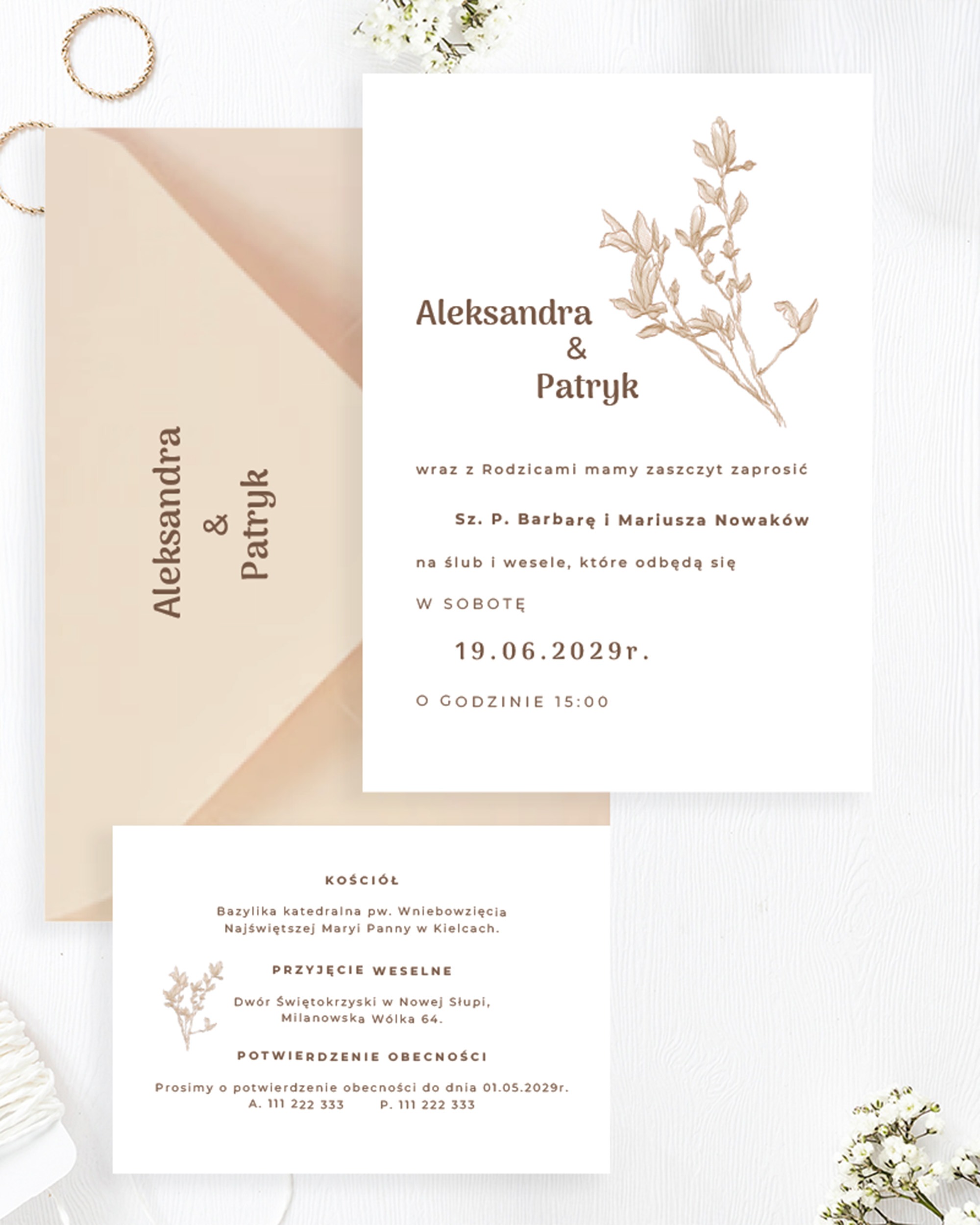 Możemy dowolnie modyfikować tekst zarówno na zaproszeniu, jak i na dodatkowych kartach, tak aby idealnie dopasować je do Waszych potrzeb i stylu uroczystości.