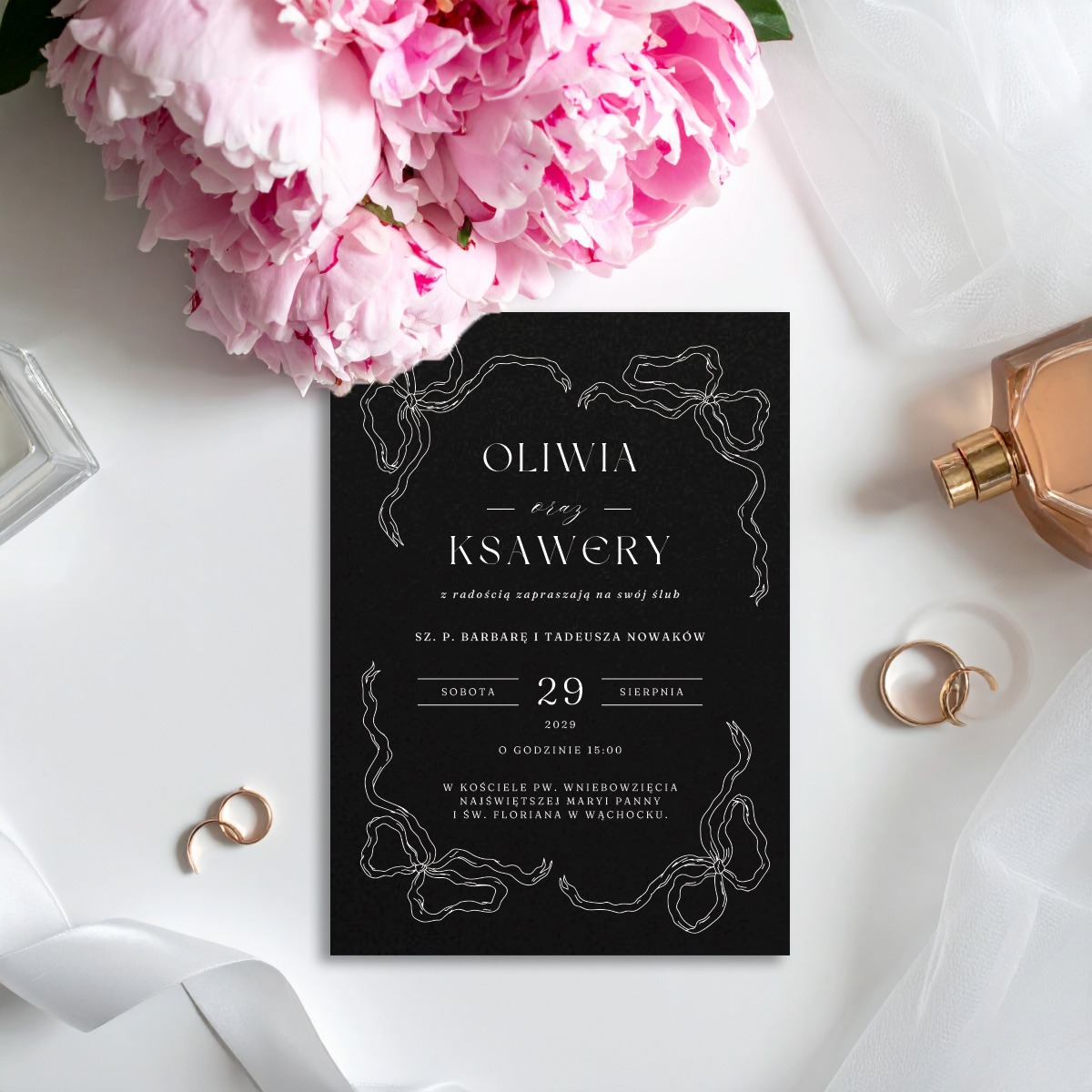 Możemy dowolnie modyfikować tekst zarówno na zaproszeniu, jak i na dodatkowych kartach, tak aby idealnie dopasować je do Waszych potrzeb i stylu uroczystości. Personalizacja gości na zaproszeniu jest wliczona w cenę zaproszenia.