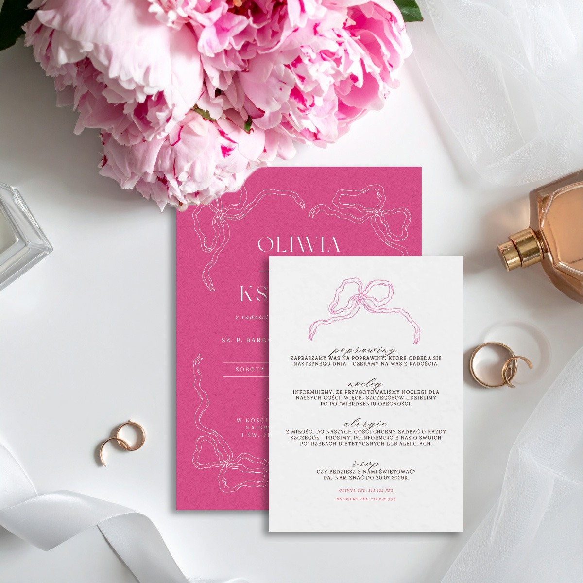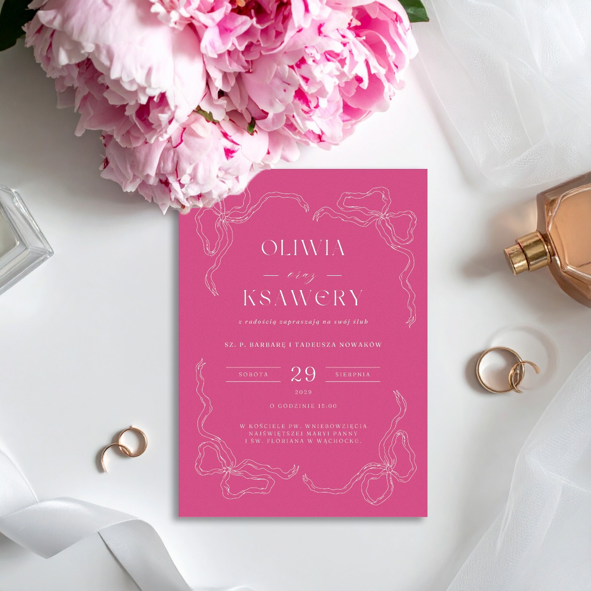 – jednokartkowe zaproszenie na fakturowanym papierze w kolorze fuksji i czerni