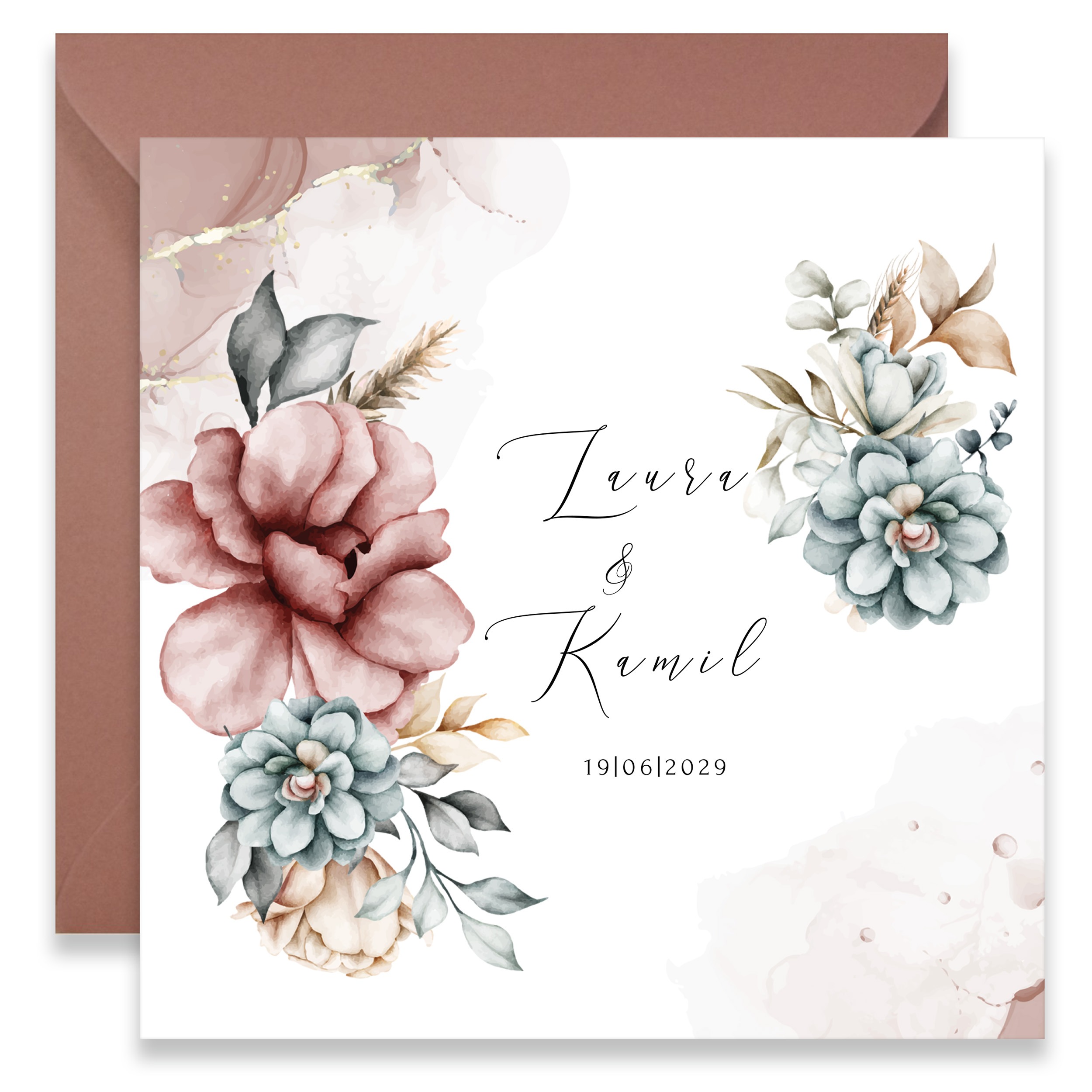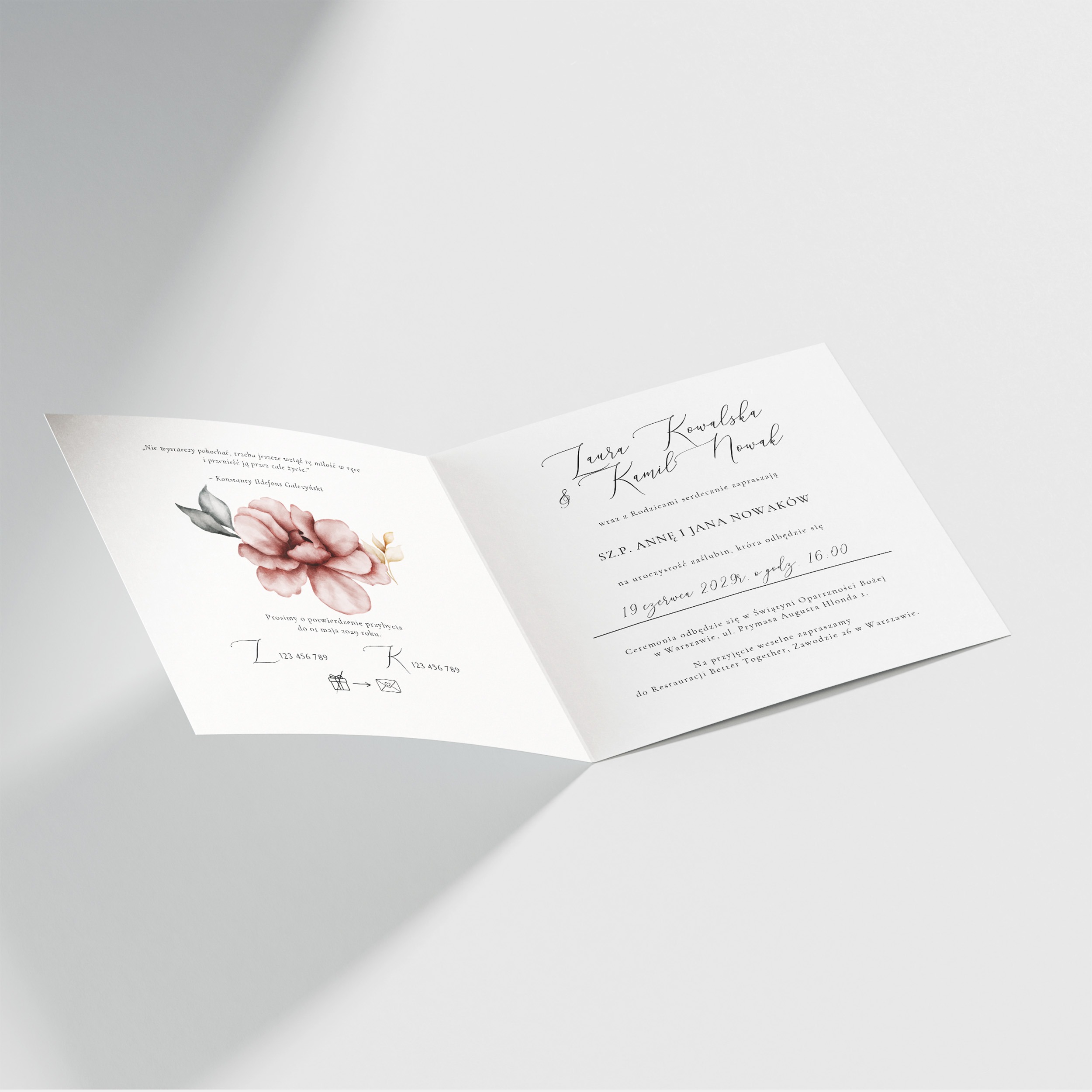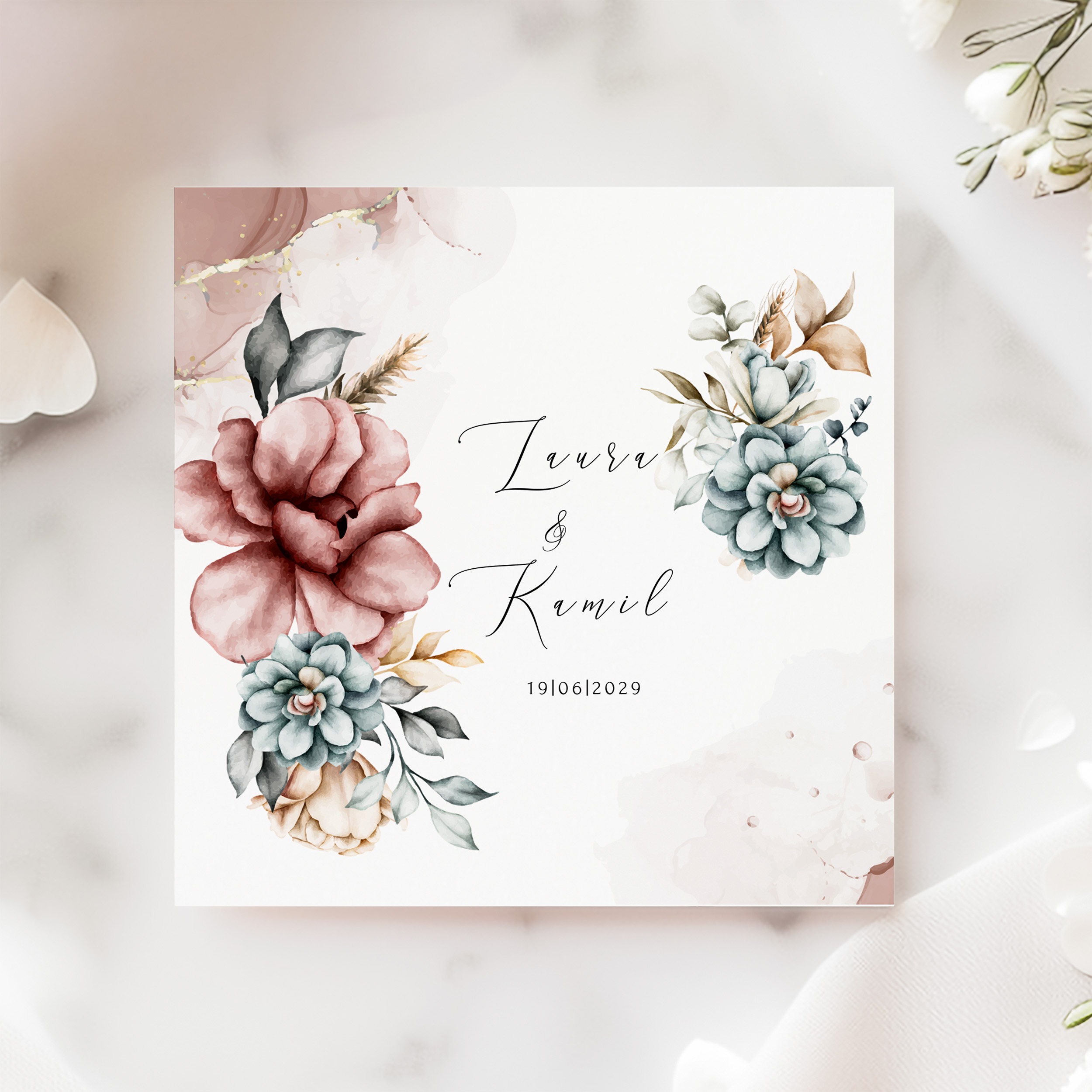 Składane zaproszenie na ślub z motywem różowych i niebieskich kwiatów. Nasza kolekcja to połączenie minimalistycznego stylu i romantycznego charakteru. To zaproszenia, które idealnie oddają wyjątkowy klimat uroczystości, dodając im klasy i niepowtarzalnego uroku.