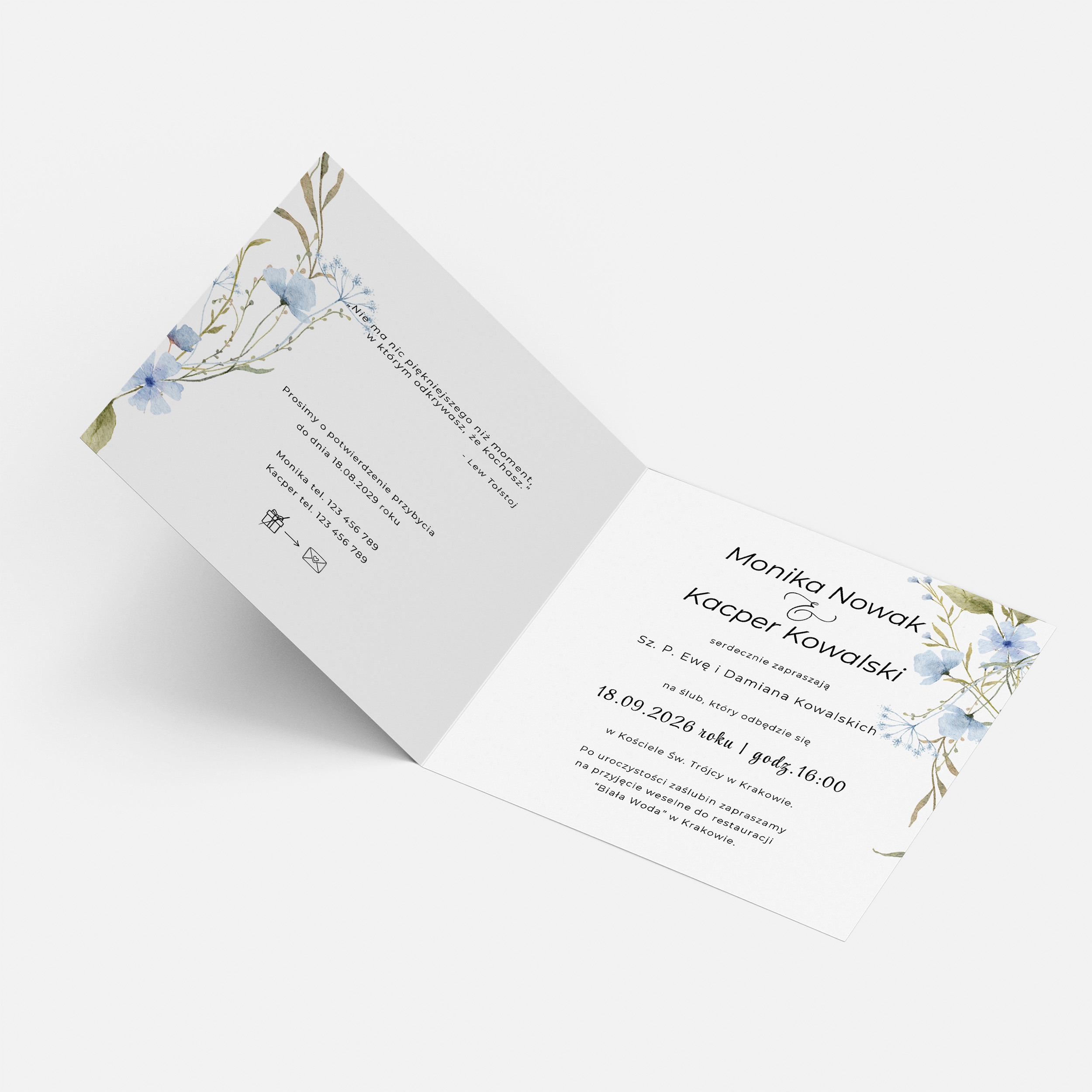 Zaproszenie na ślub z niebieskimi kwiatami. Nasza kolekcja to połączenie wyrafinowanego stylu i romantycznego charakteru. Kwiaty w towarzystwie pudrowych i intensywnych tonów tworzą kompozycję pełną ciepła, pasji i elegancji. To zaproszenia, które idealnie oddają wyjątkowy klimat uroczystości, dodając im klasy i niepowtarzalnego uroku.