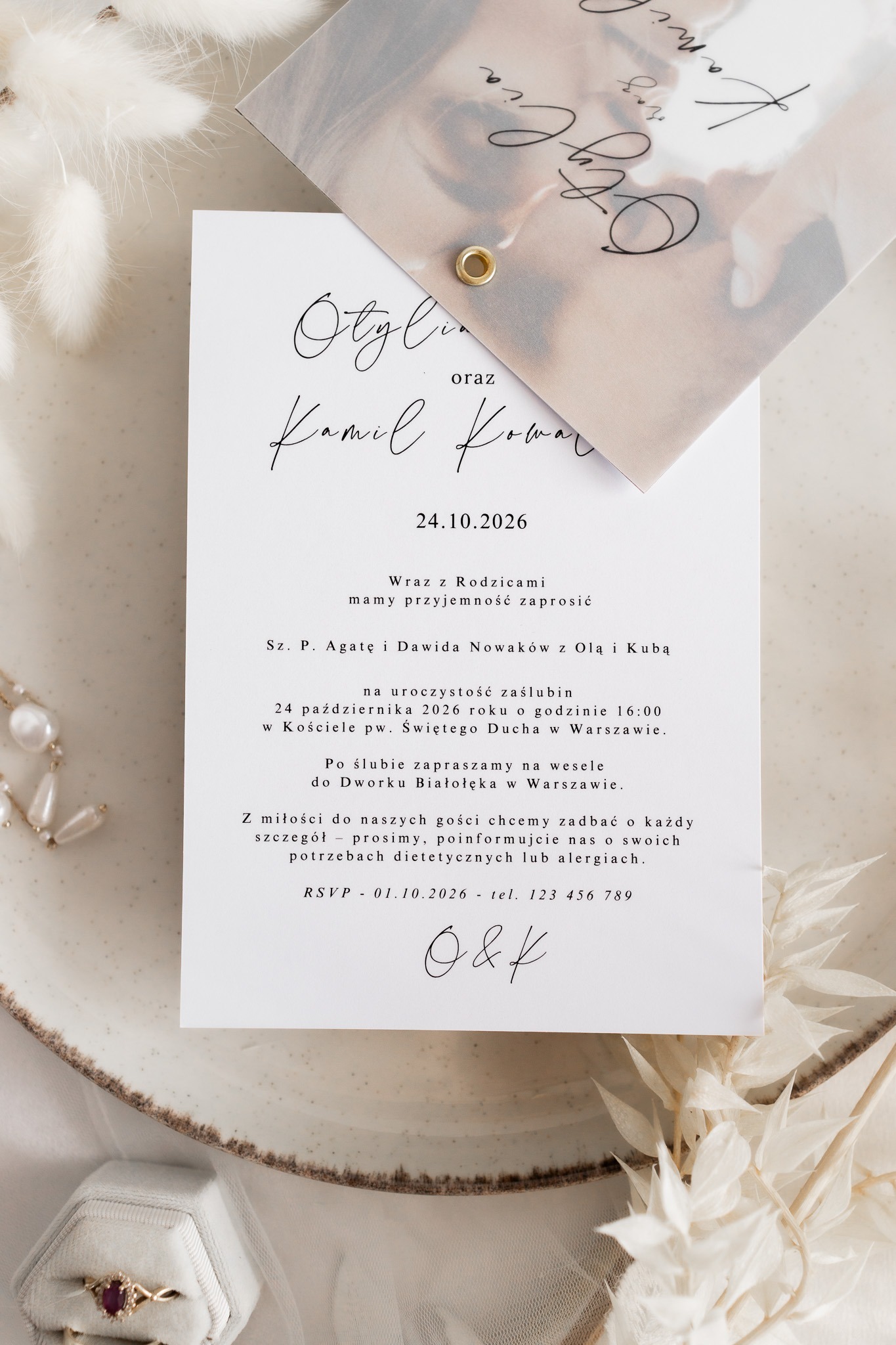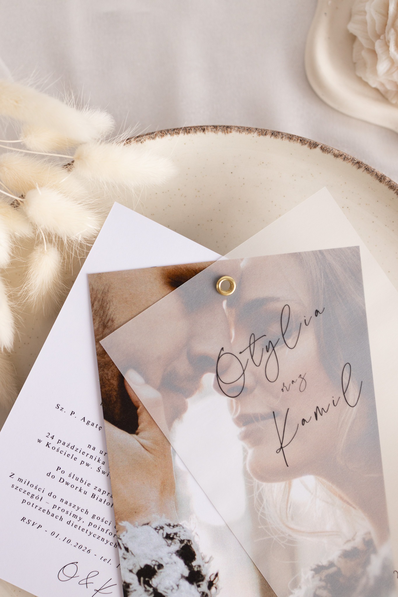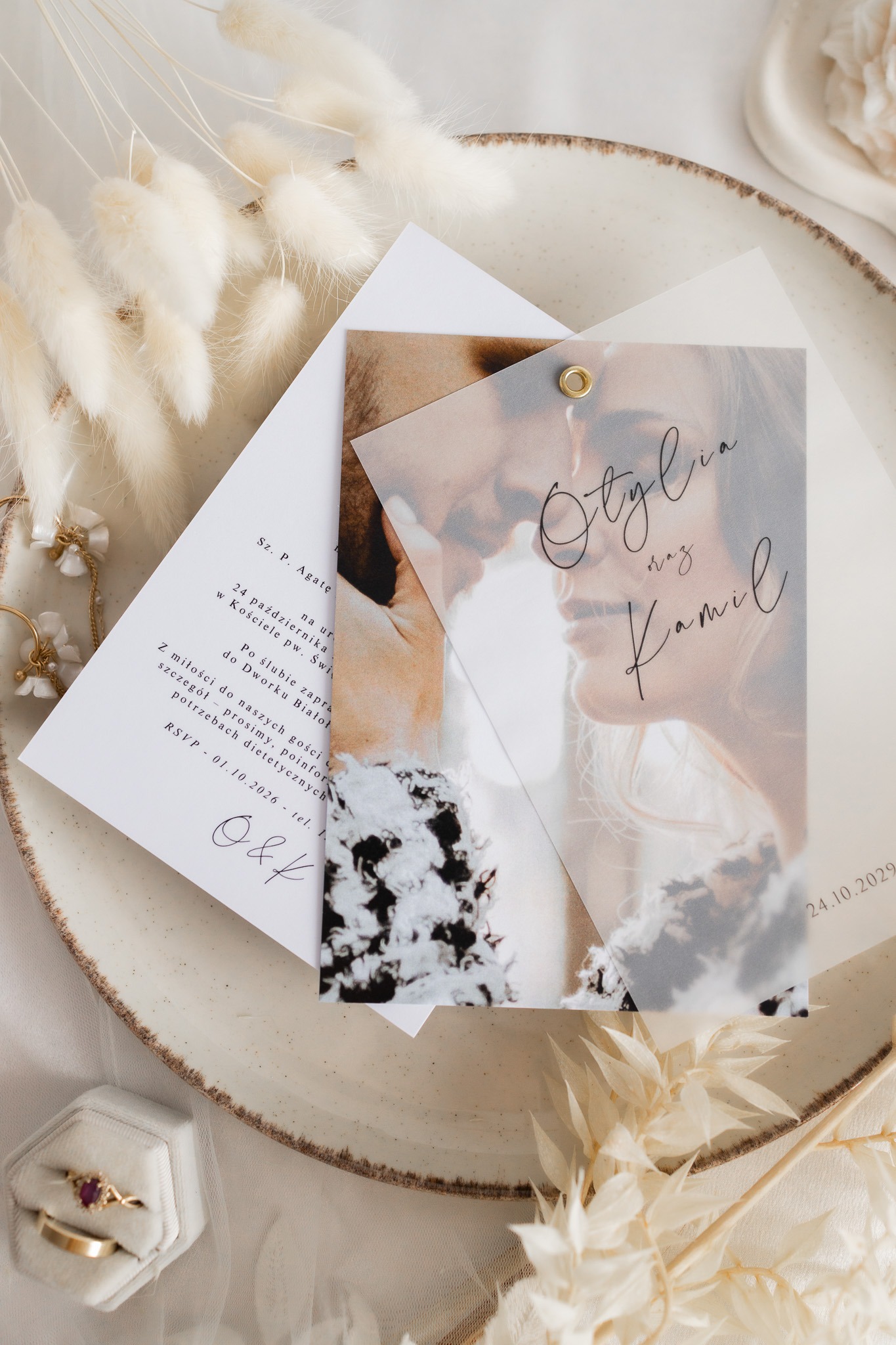 - Kalka (półprzezroczysta warstwa) – na którą nanosimy spersonalizowaną treść Waszych imion/daty ślubu, czarnym nadrukiem, subtelnie przenikającym przez kalkę.