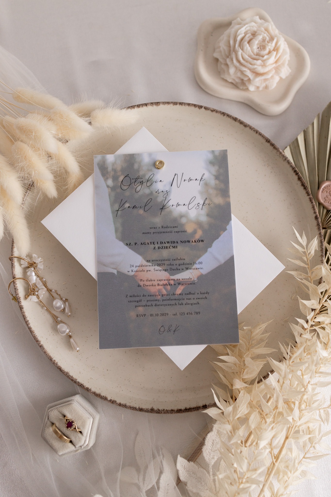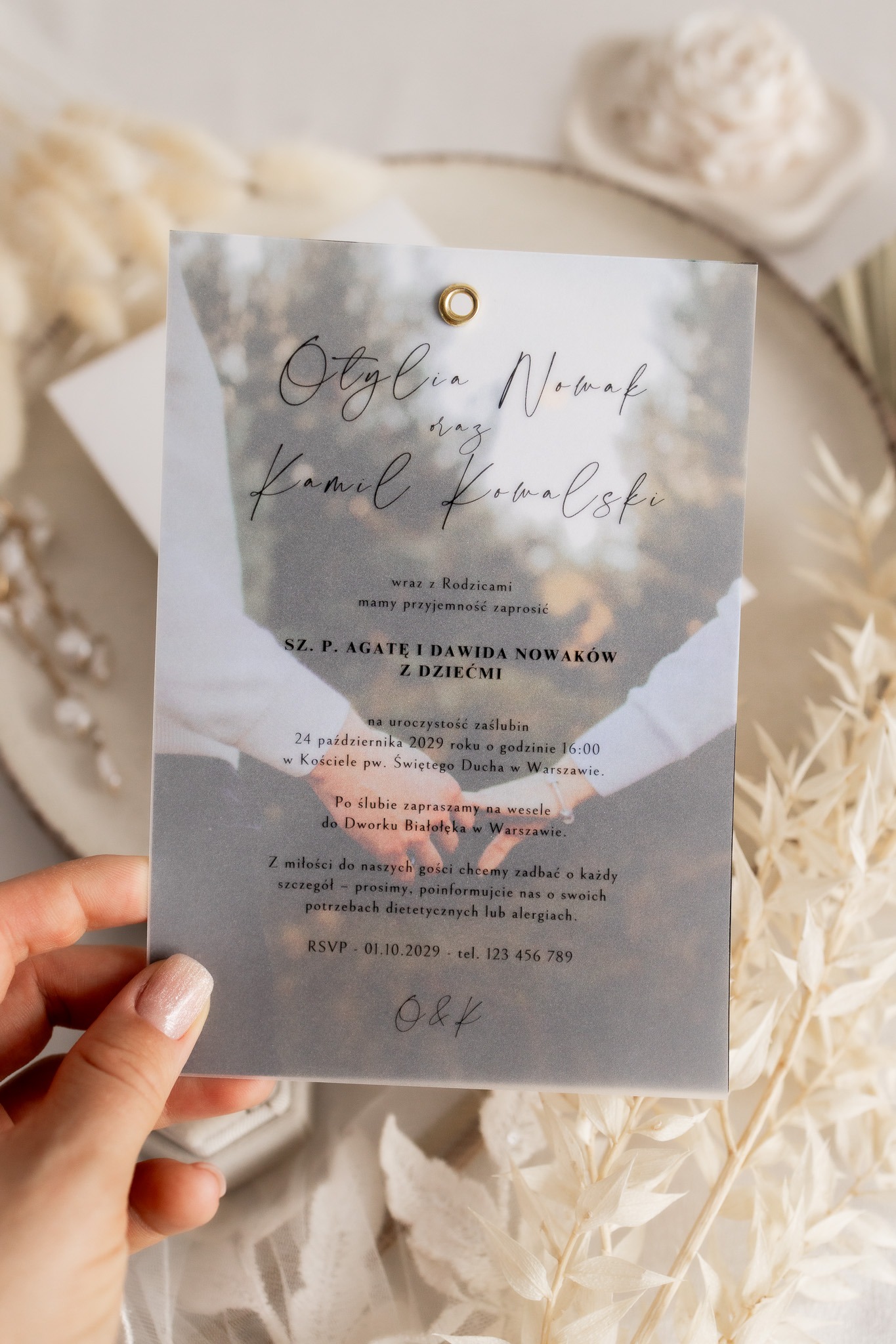 (imiona i nazwiska pary młodej, godzinę mszy, adres kościoła i przyjęcia, datę potwierdzającą obecność, nr tel.)