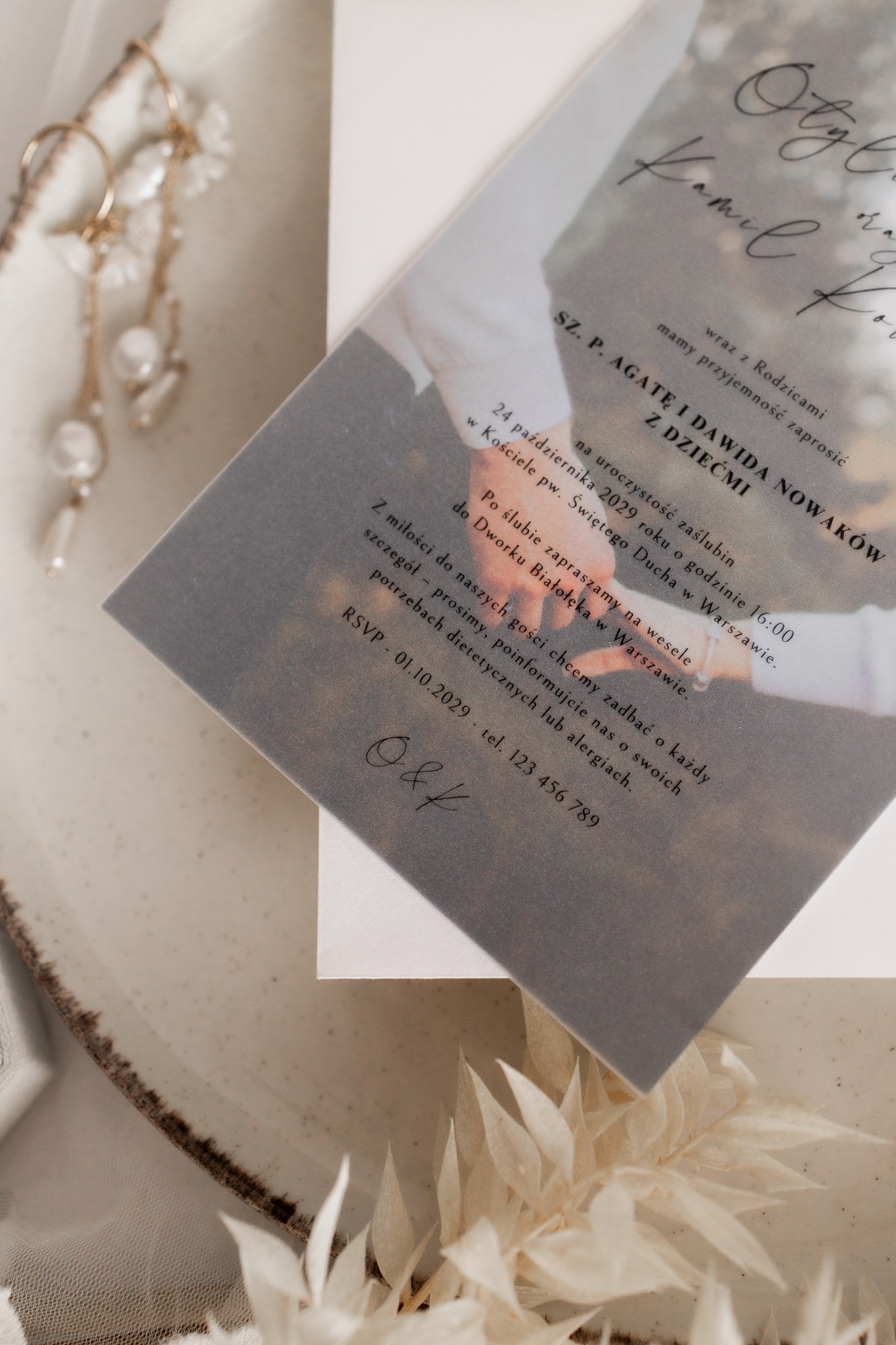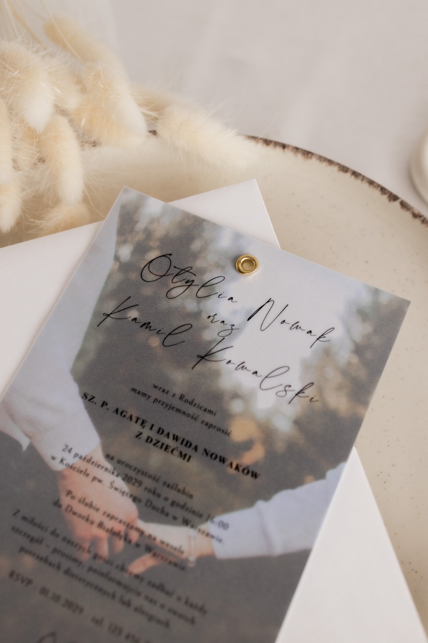 • Kalka (półprzezroczysta warstwa) – na którą nanosimy spersonalizowaną treść zaproszenia czarnym nadrukiem, subtelnie przenikającym przez kalkę.