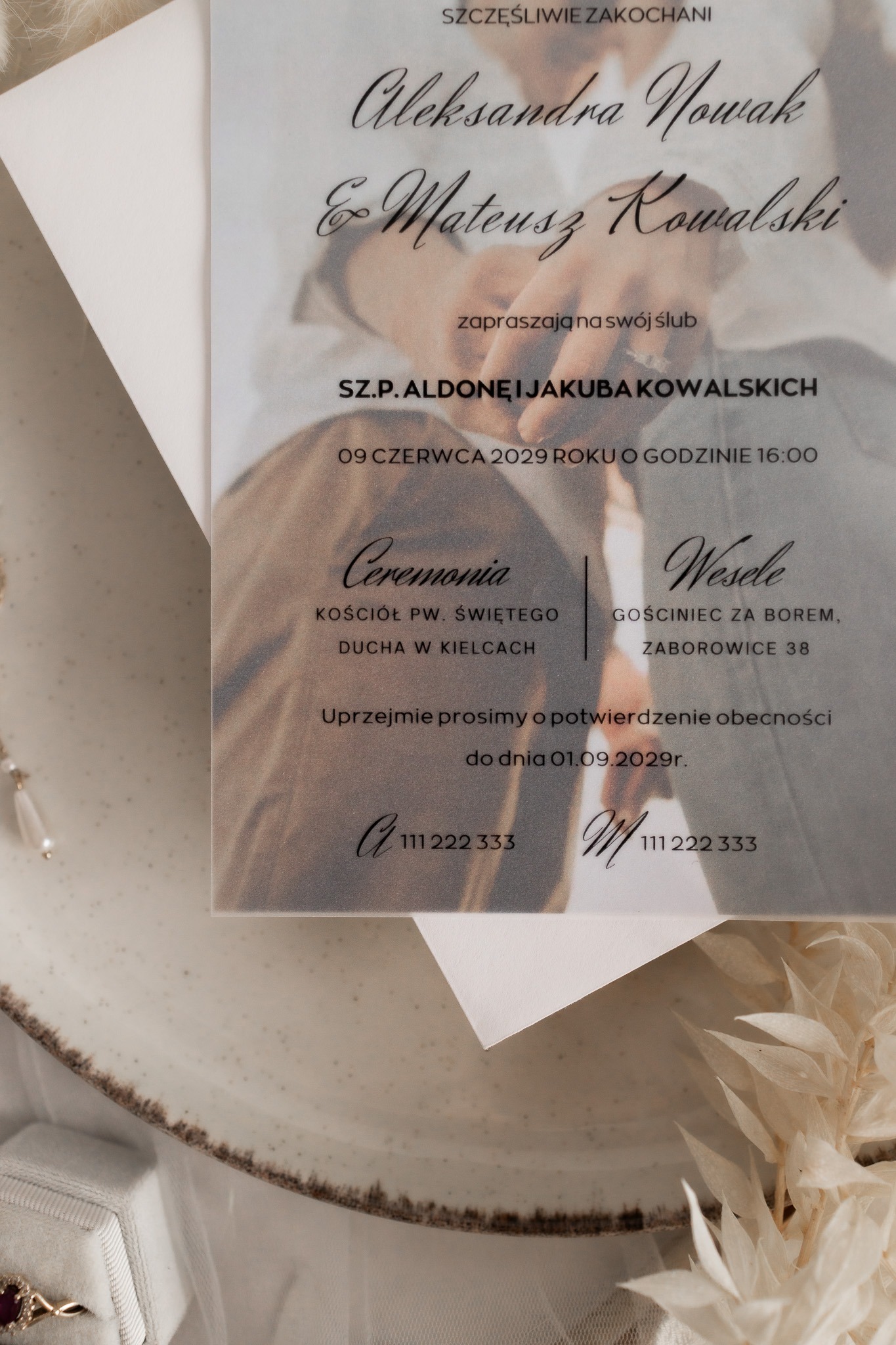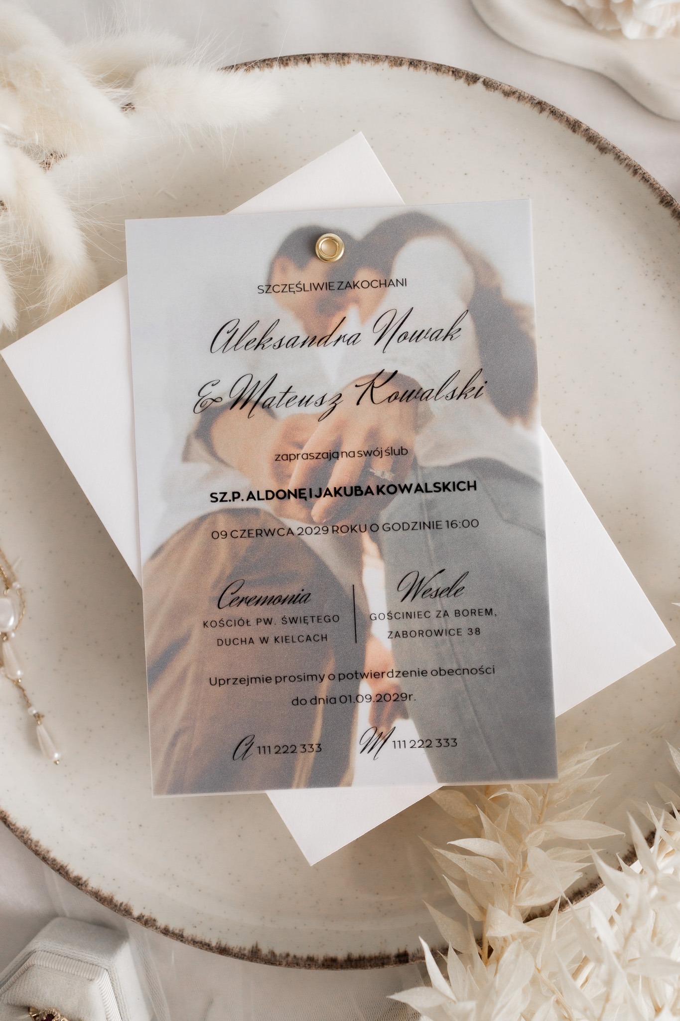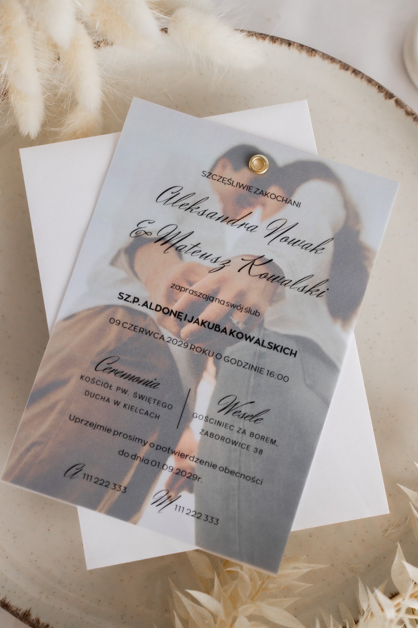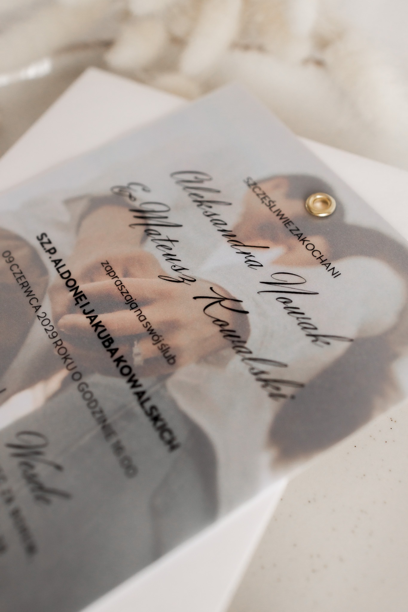 Kalka (półprzezroczysta warstwa) – na którą nanosimy spersonalizowaną treść zaproszenia czarnym nadrukiem, subtelnie przenikającym przez kalkę.