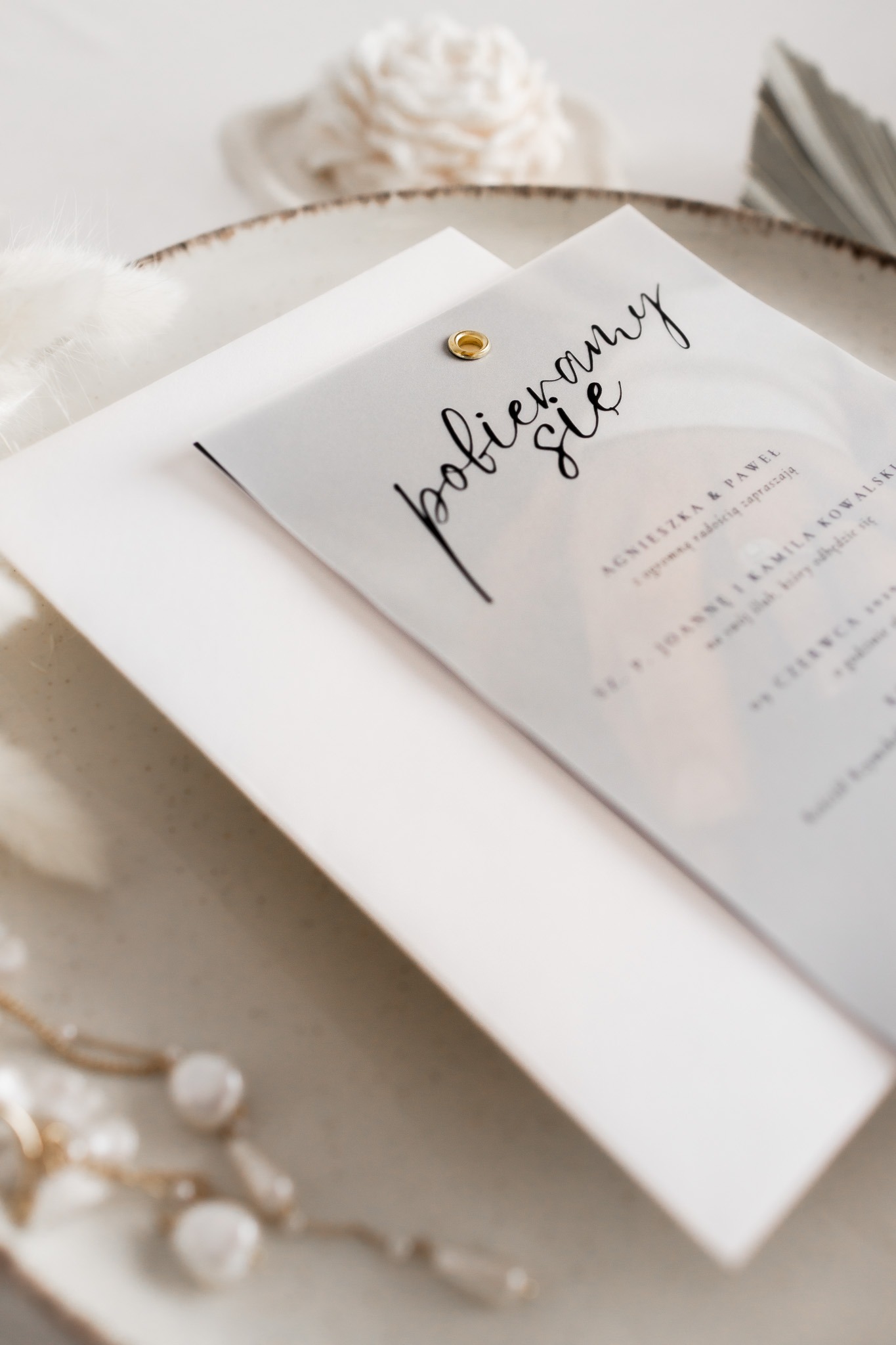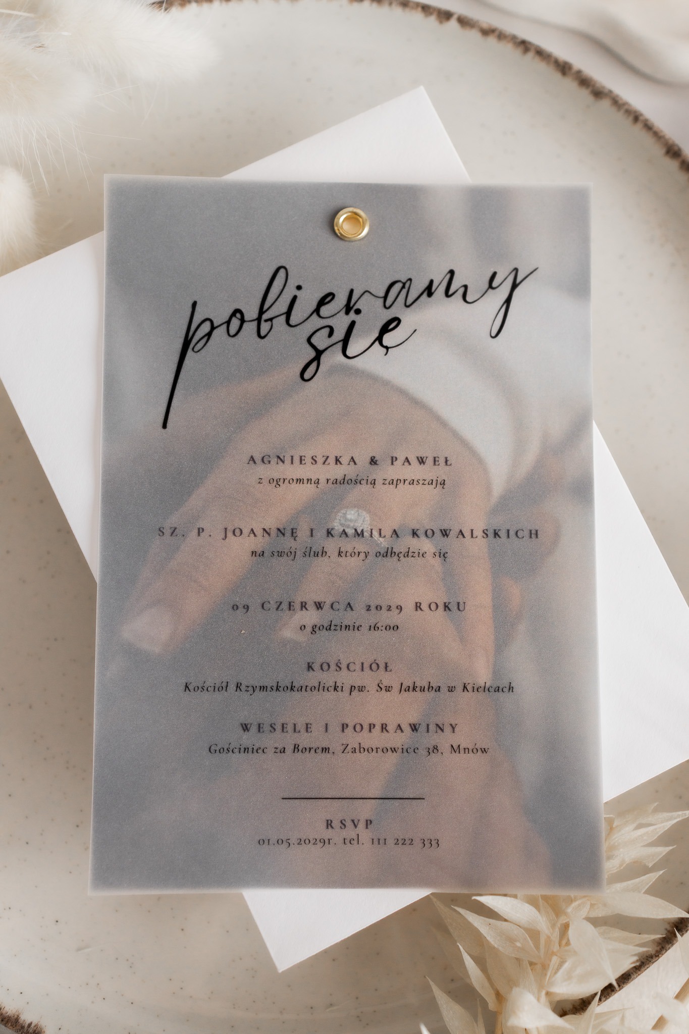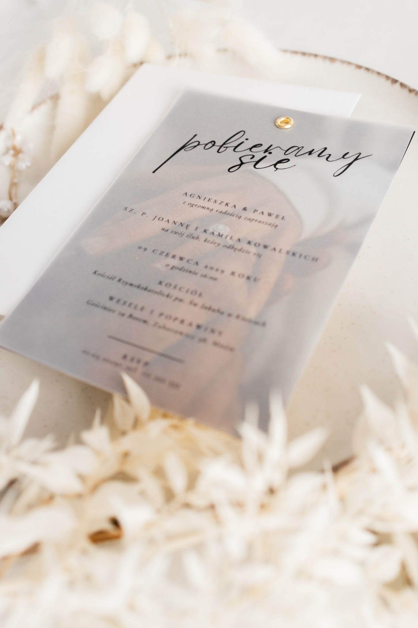 - Kalka (półprzezroczysta warstwa) – na którą nanosimy spersonalizowaną treść zaproszenia czarnym nadrukiem, subtelnie przenikającym przez kalkę.