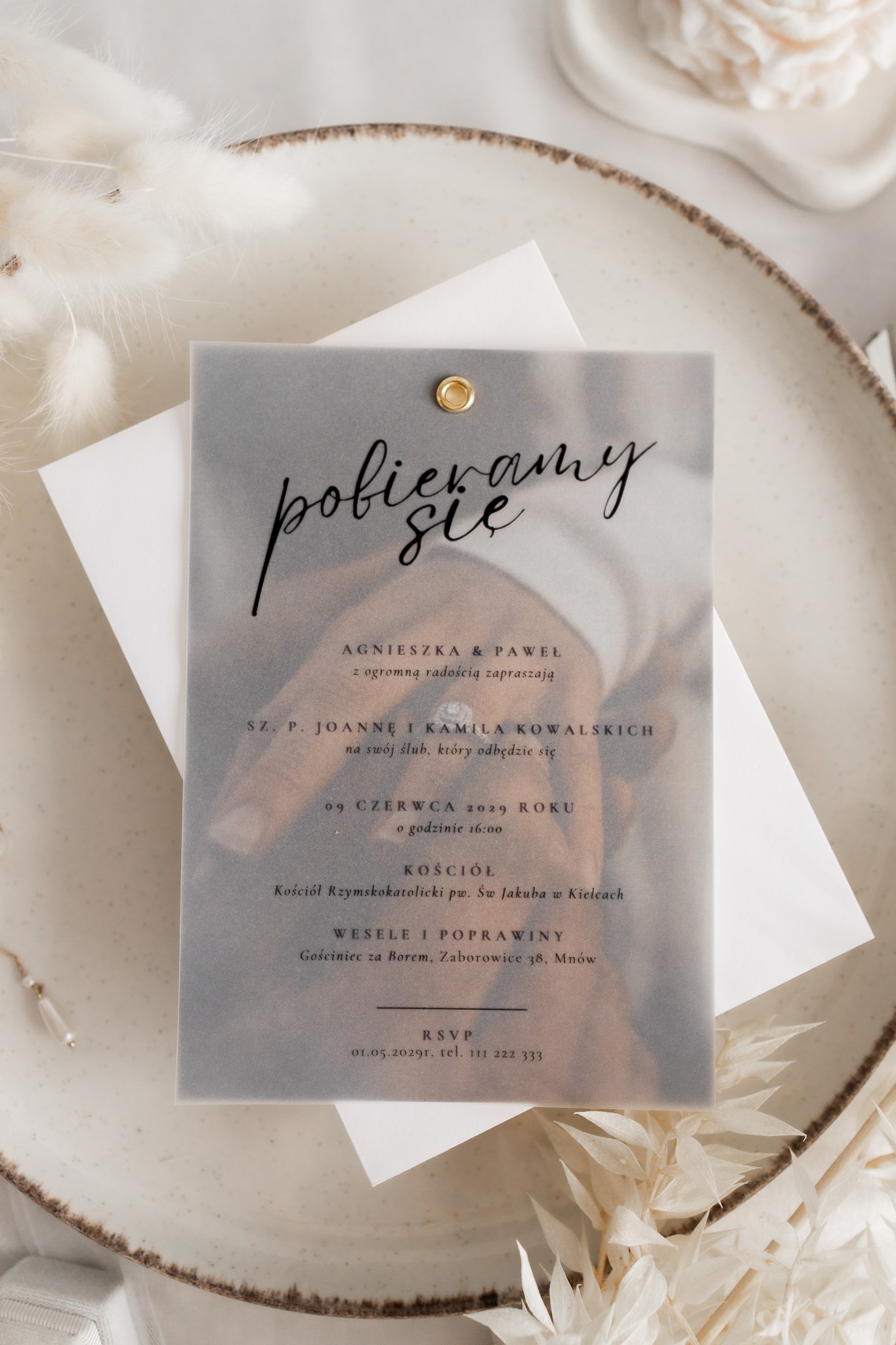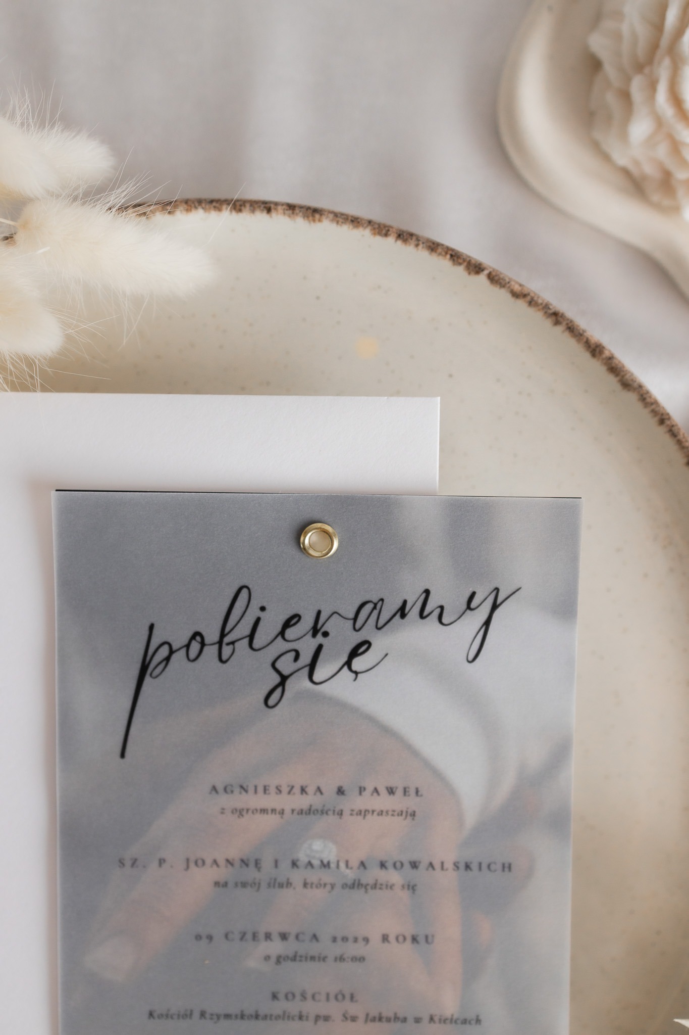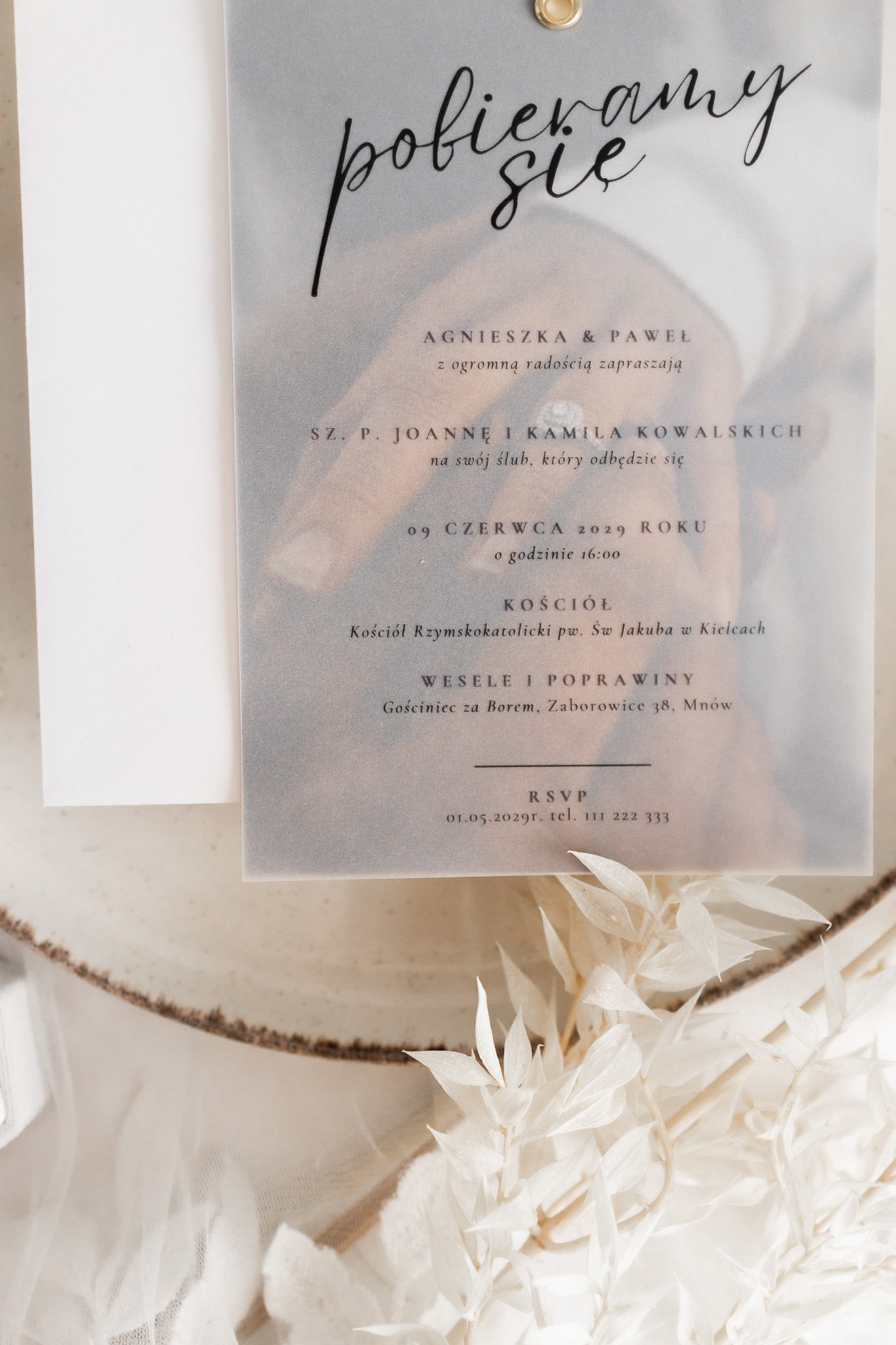 - Kalka (półprzezroczysta warstwa) – na którą nanosimy spersonalizowaną treść zaproszenia czarnym nadrukiem, subtelnie przenikającym przez kalkę.