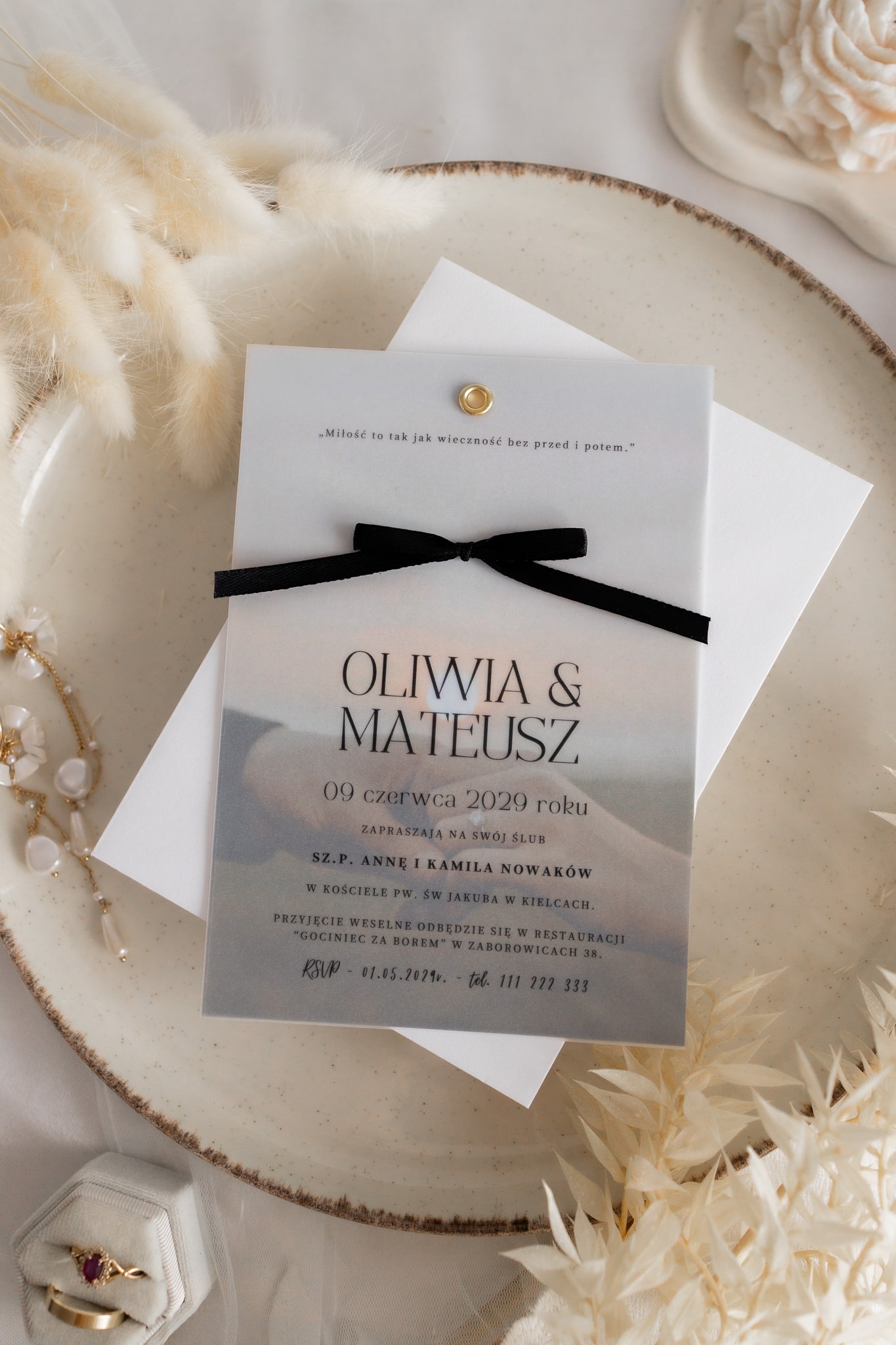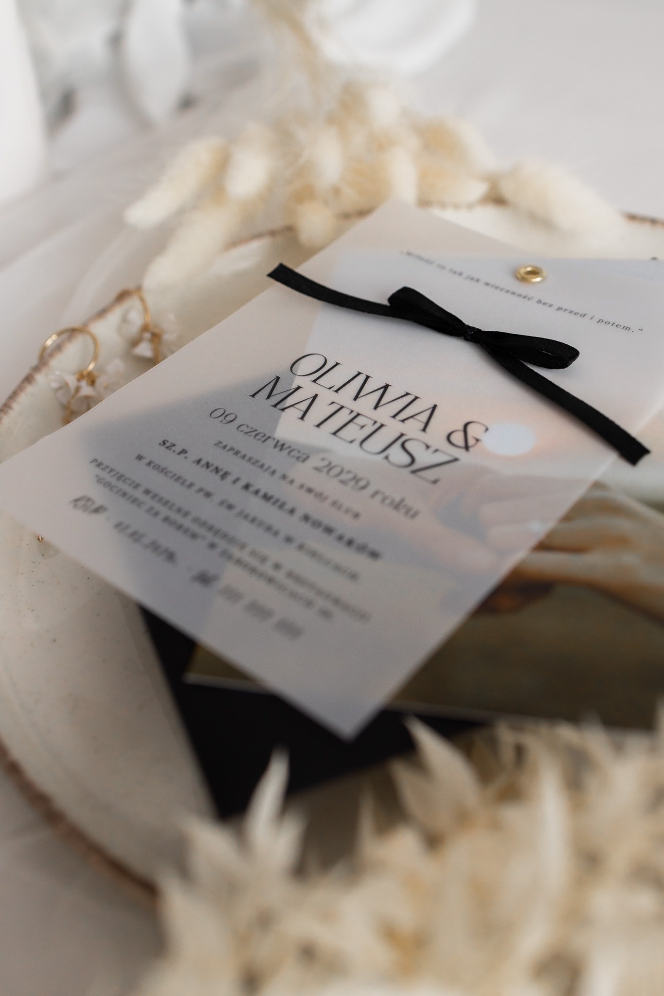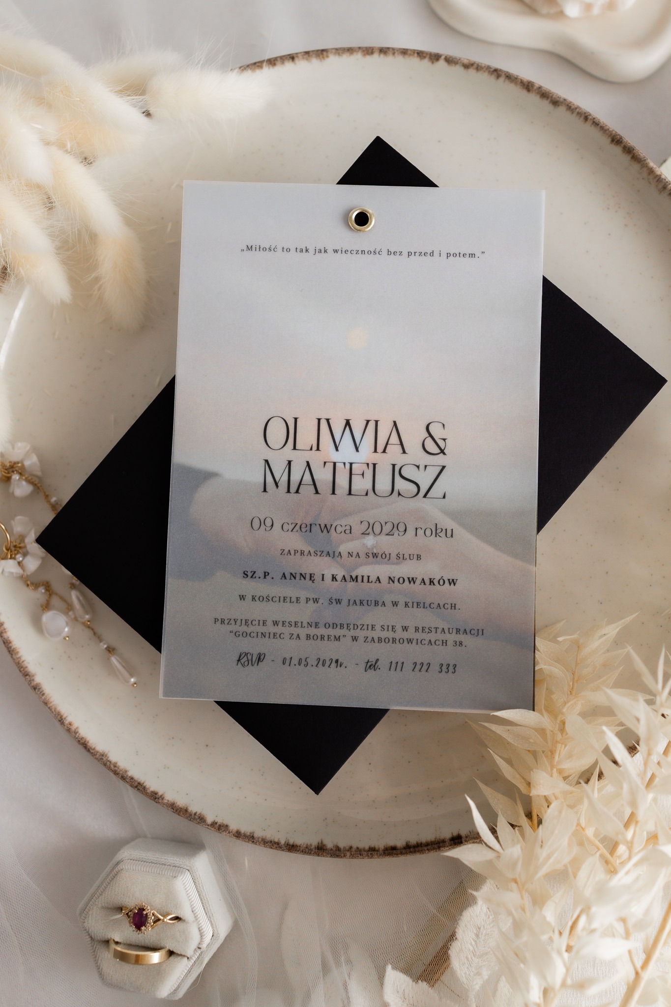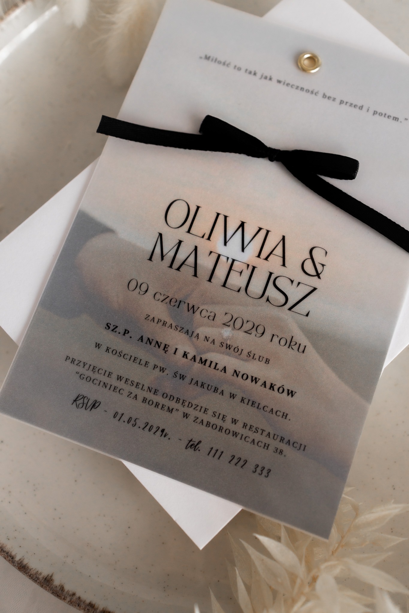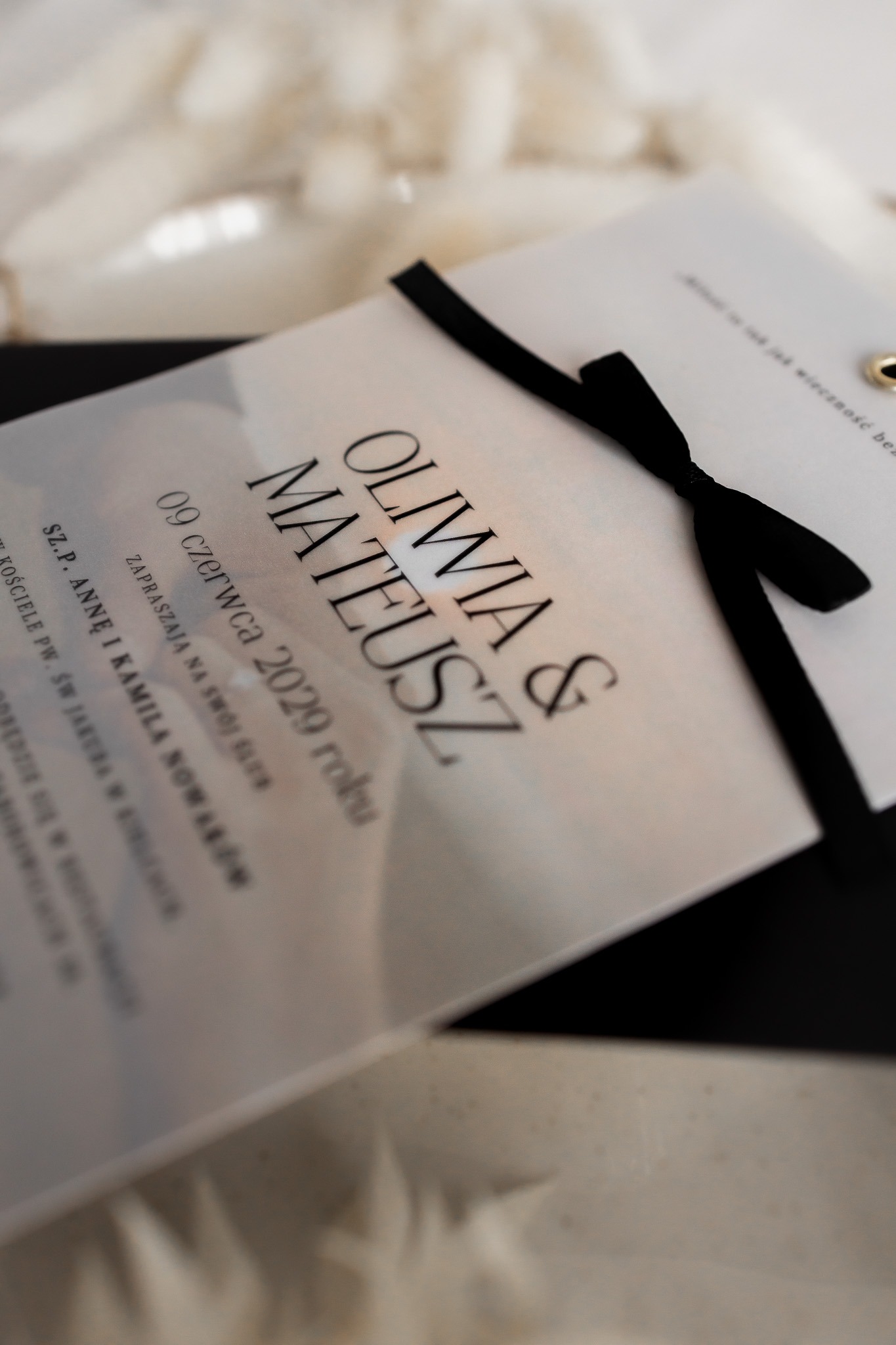 Kalka (półprzezroczysta warstwa) – na którą nanosimy spersonalizowaną treść zaproszenia czarnym nadrukiem, subtelnie przenikającym przez kalkę.