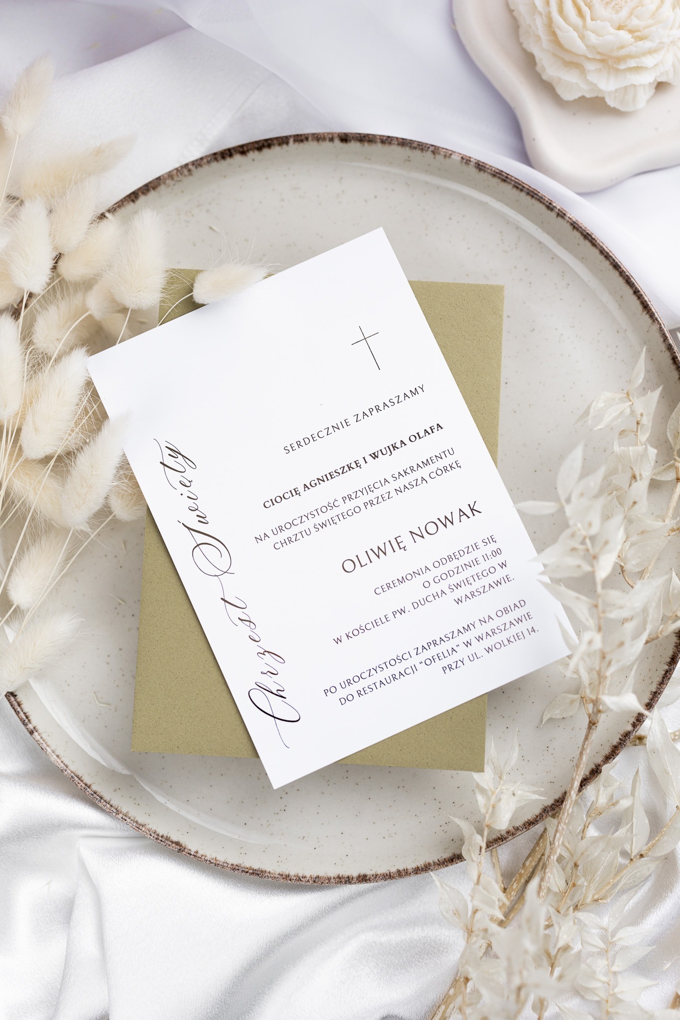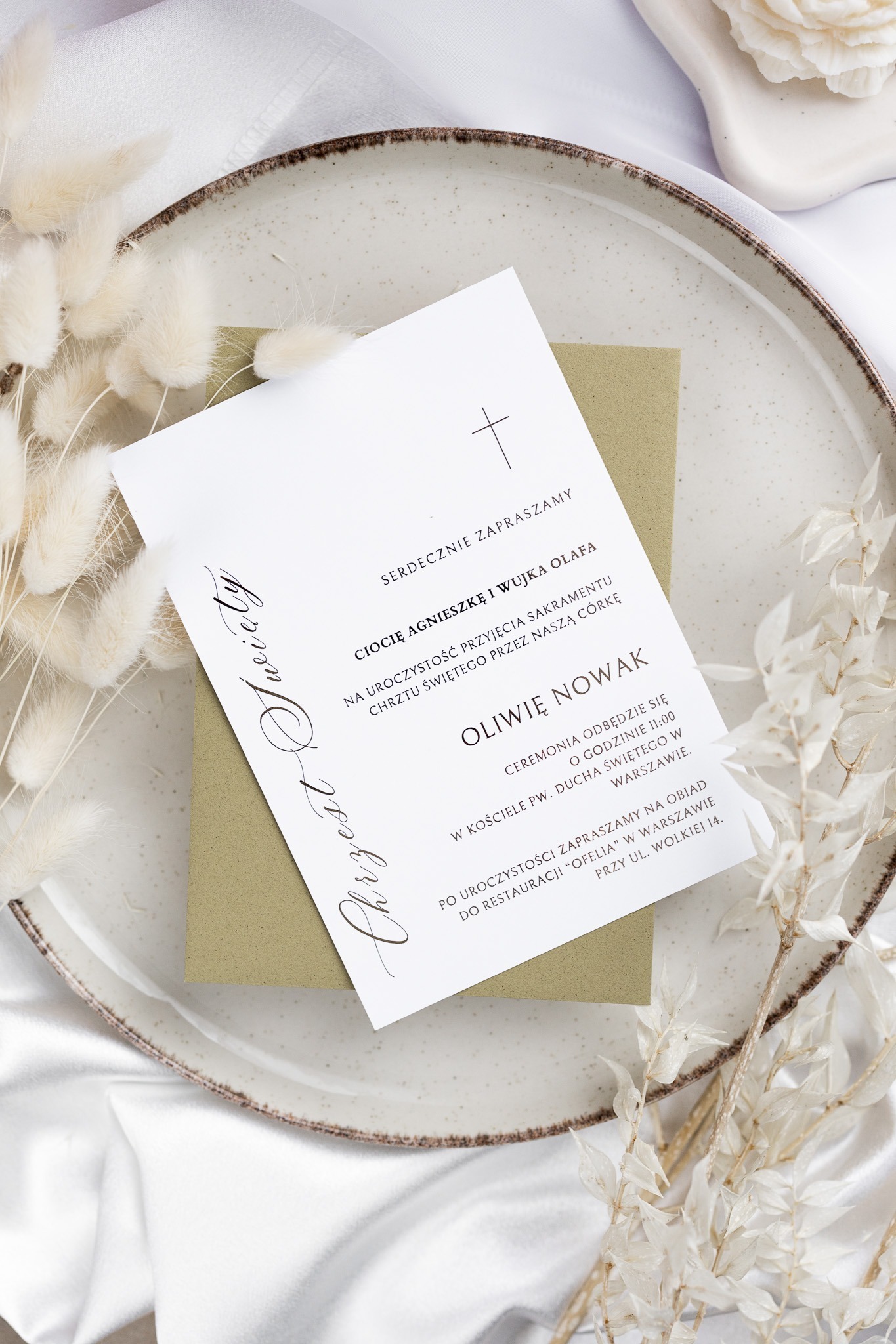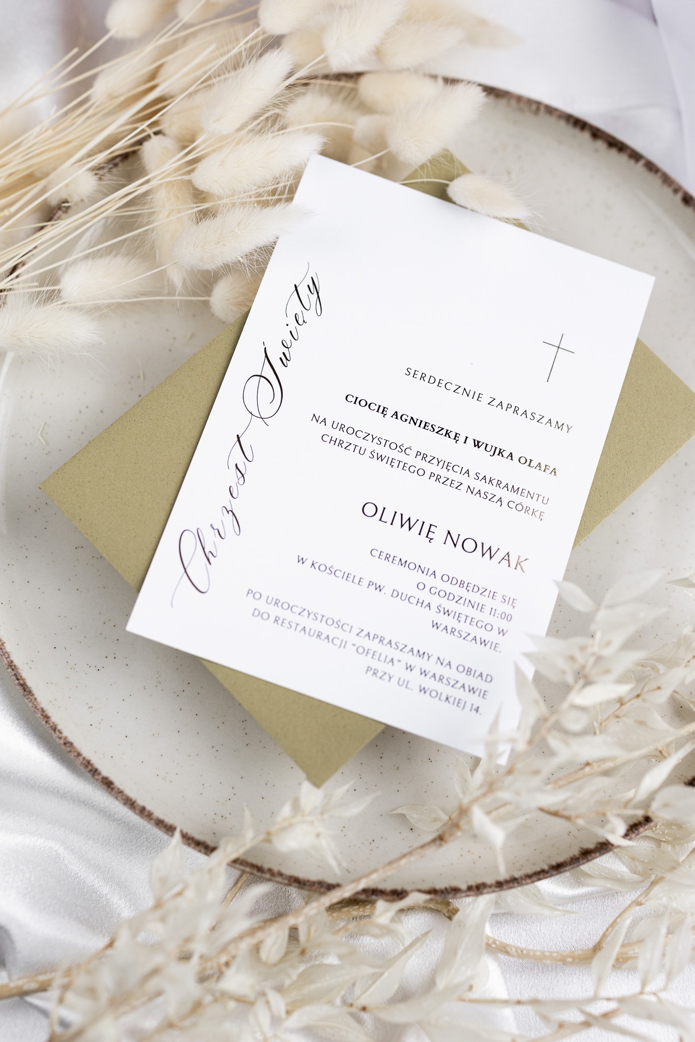Nowoczesne zaproszenie na Chrzest Święty w minimalistycznej formie ze złoconym tekstem.