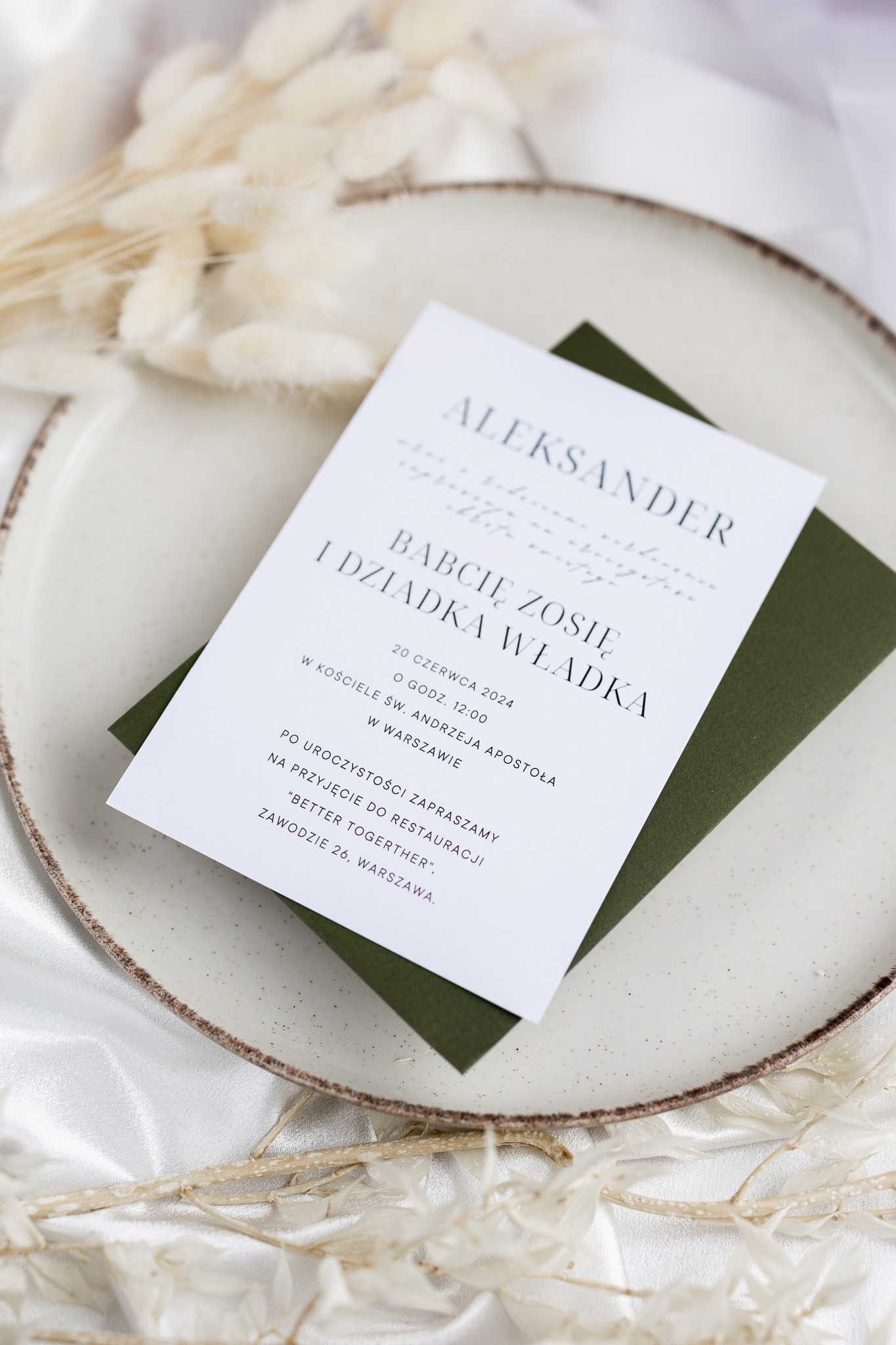 Nowoczesne zaproszenie na Chrzest Święty w minimalistycznej formie ze złoconym tekstem.