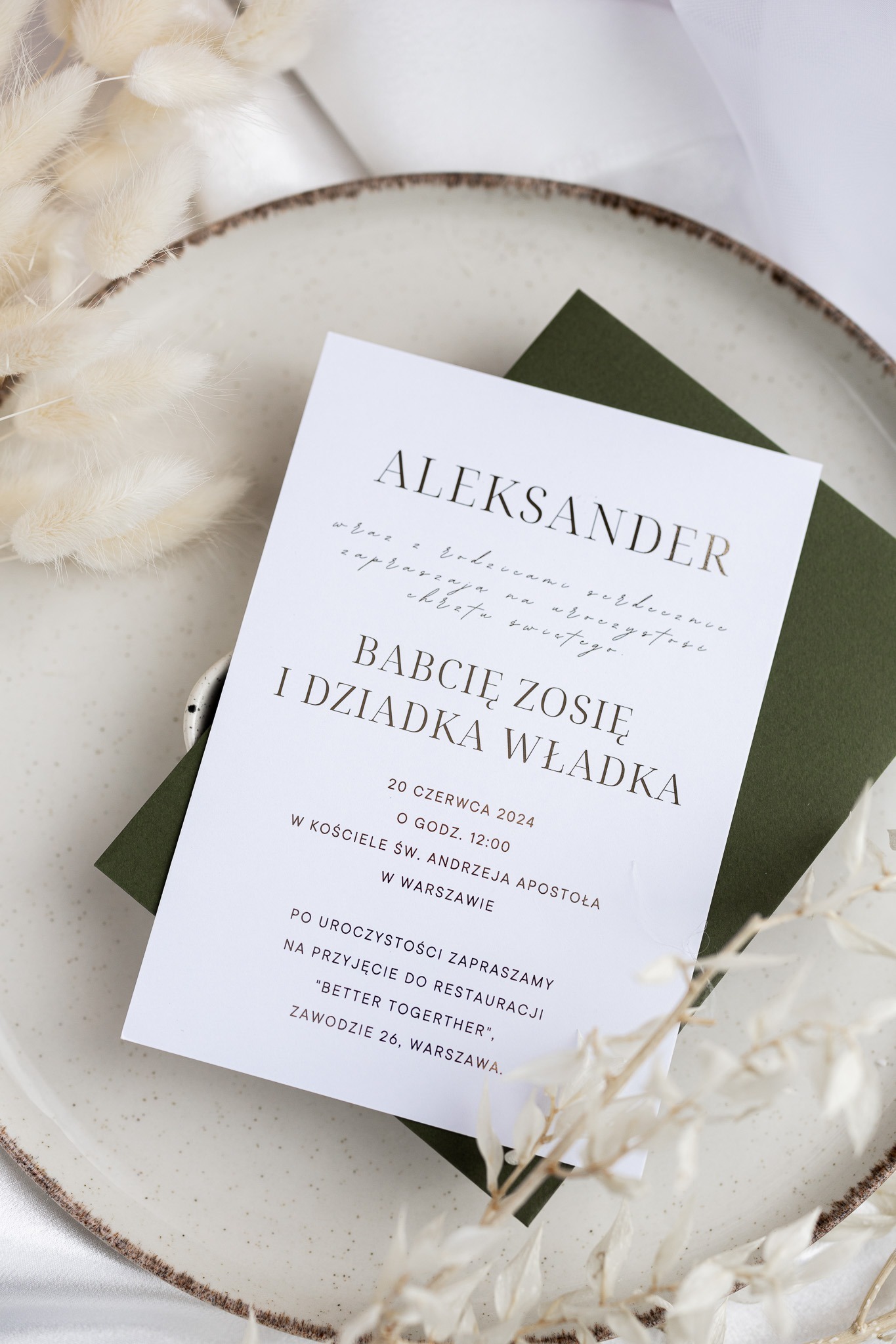 Subtelny układ treści podkreśla uroczysty charakter zaproszenia. Prosta, a zarazem efektowna konstrukcja zaproszenia, idealna na szczególne okazje.