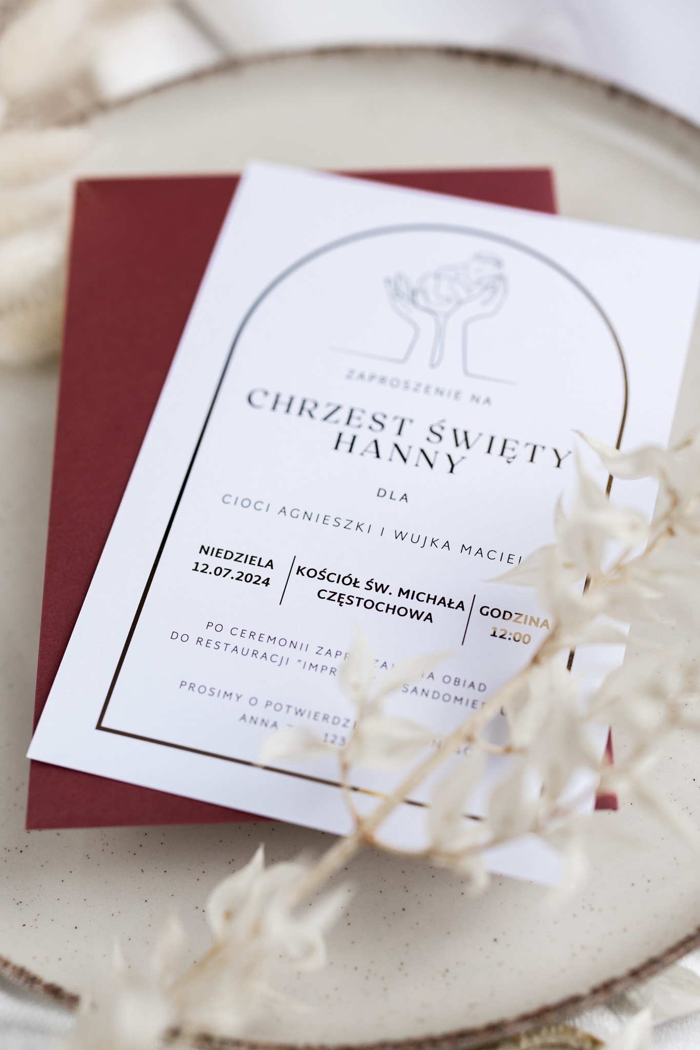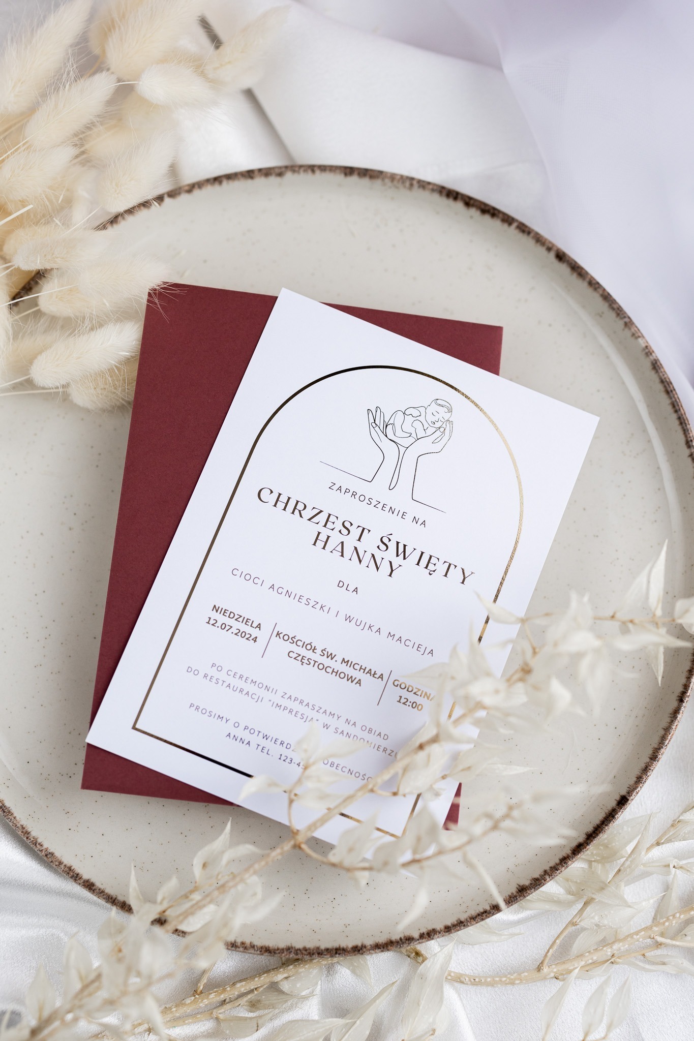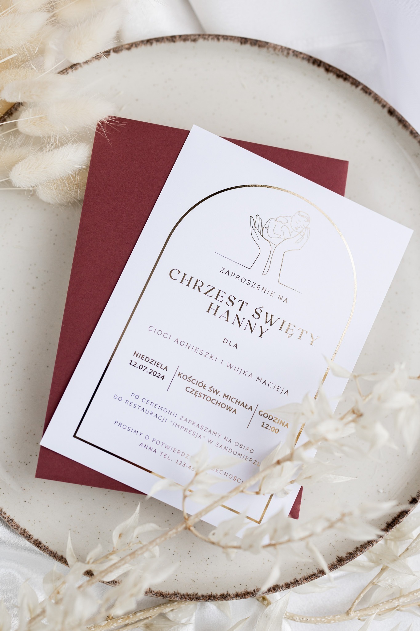 Nowoczesne zaproszenie na Chrzest Święty w minimalistycznej formie ze złoconym tekstem.