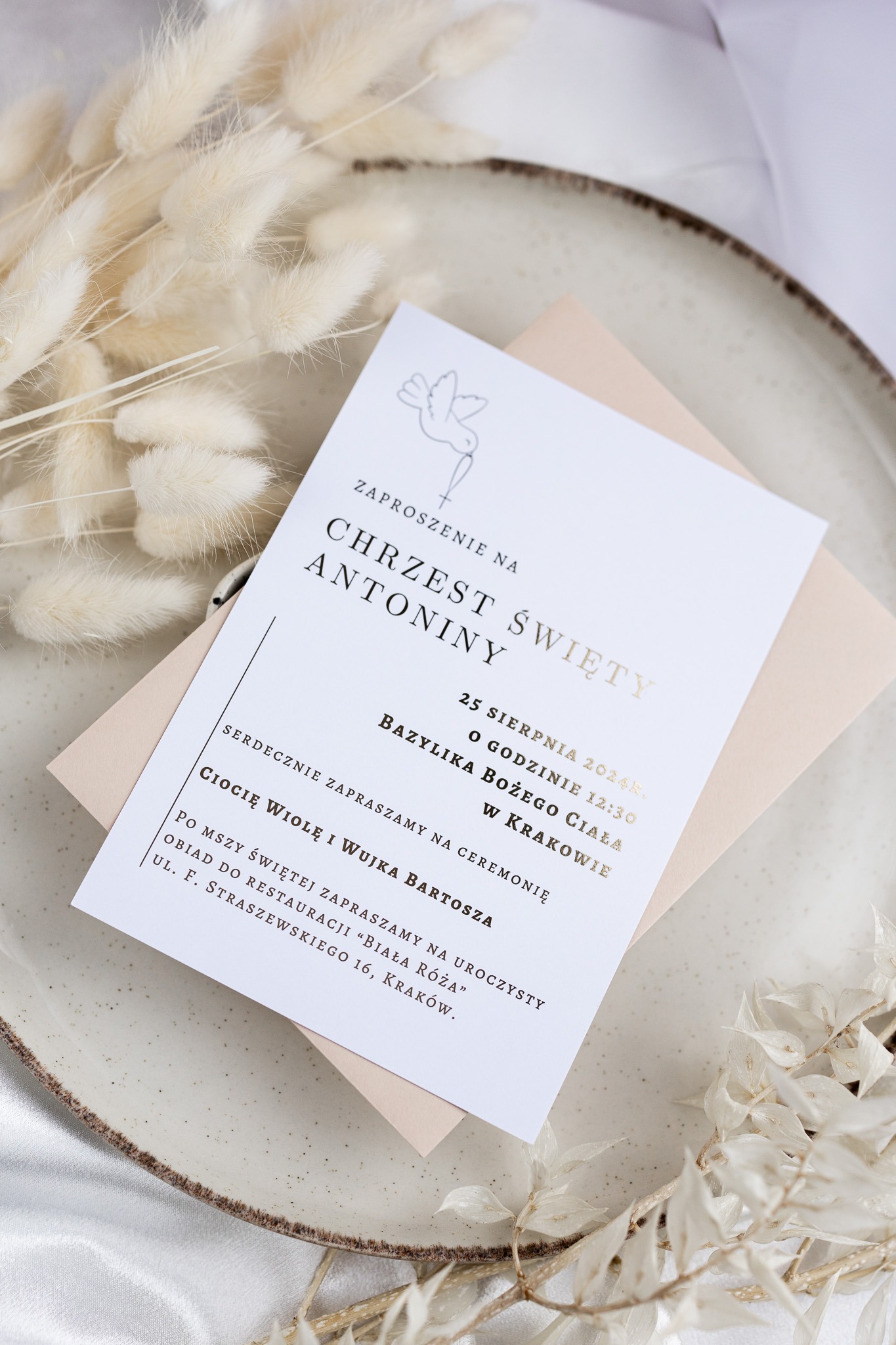 Nowoczesne zaproszenie na Chrzest Święty w minimalistycznej formie ze złoconym tekstem.