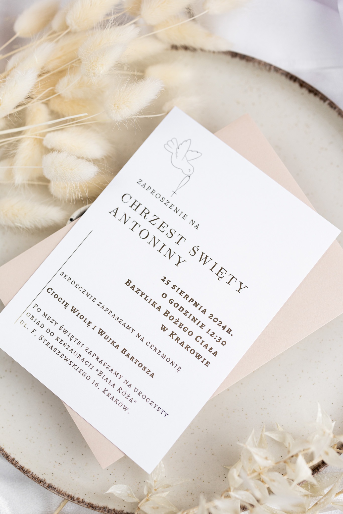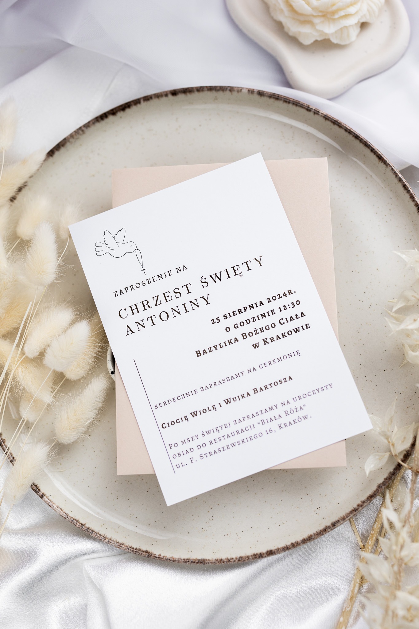 Subtelny grafika ptaka podkreśla uroczysty charakter zaproszenia. Prosta, a zarazem efektowna konstrukcja zaproszenia, idealna na szczególne okazje.