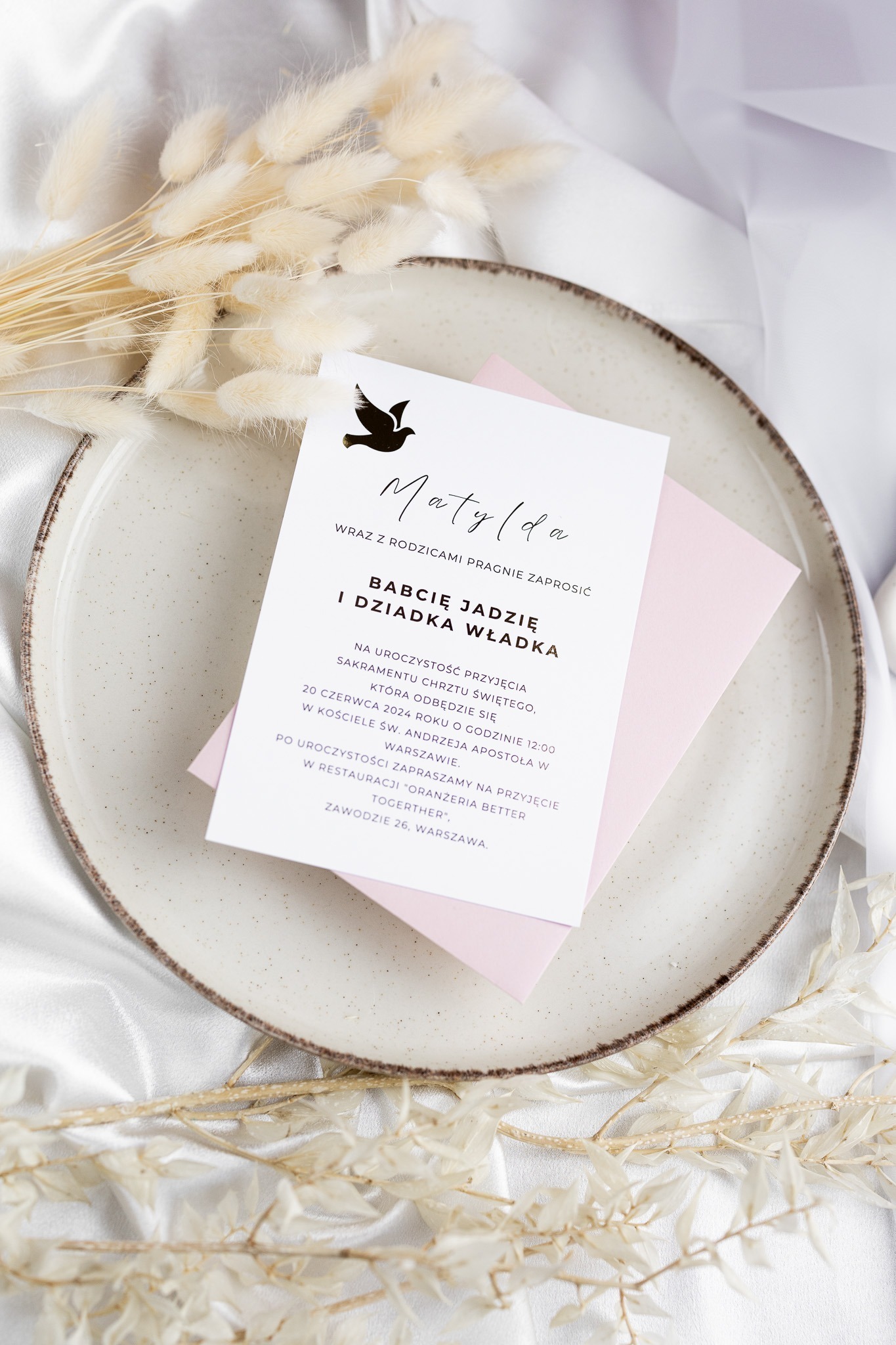 Subtelny grafika ptaka podkreśla uroczysty charakter zaproszenia. Prosta, a zarazem efektowna konstrukcja zaproszenia, idealna na szczególne okazje.