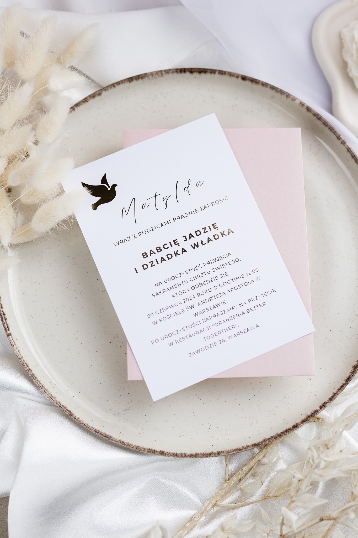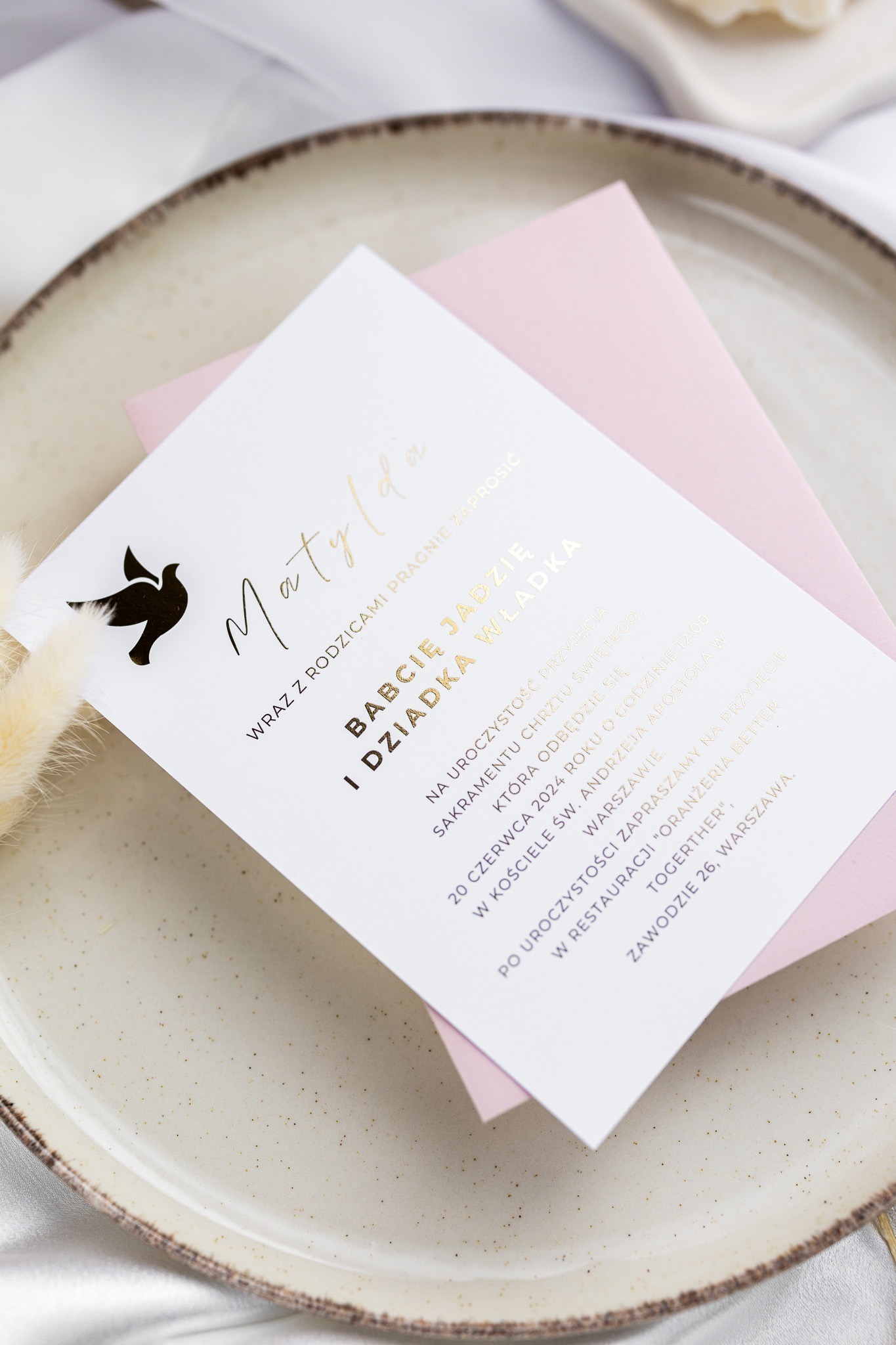 Nowoczesne zaproszenie na Chrzest Święty w minimalistycznej formie ze złoconym tekstem.