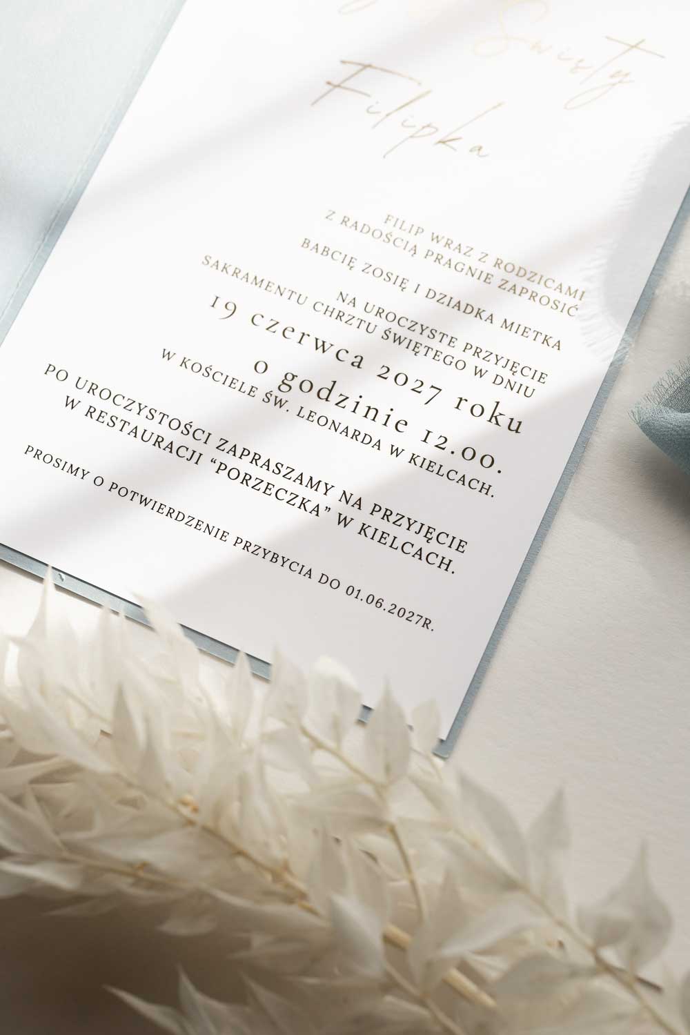 ZŁOCONE ZAPROSZENIE NA CHRZEST ŚWIĘTY Z WSTĄŻKĄ