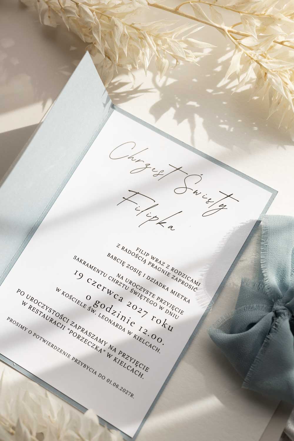 Nowoczesne zaproszenie na Chrzest Święty. Minimalistyczna forma. Każde zaproszenie możemy spersonalizować pod daną okoliczność.