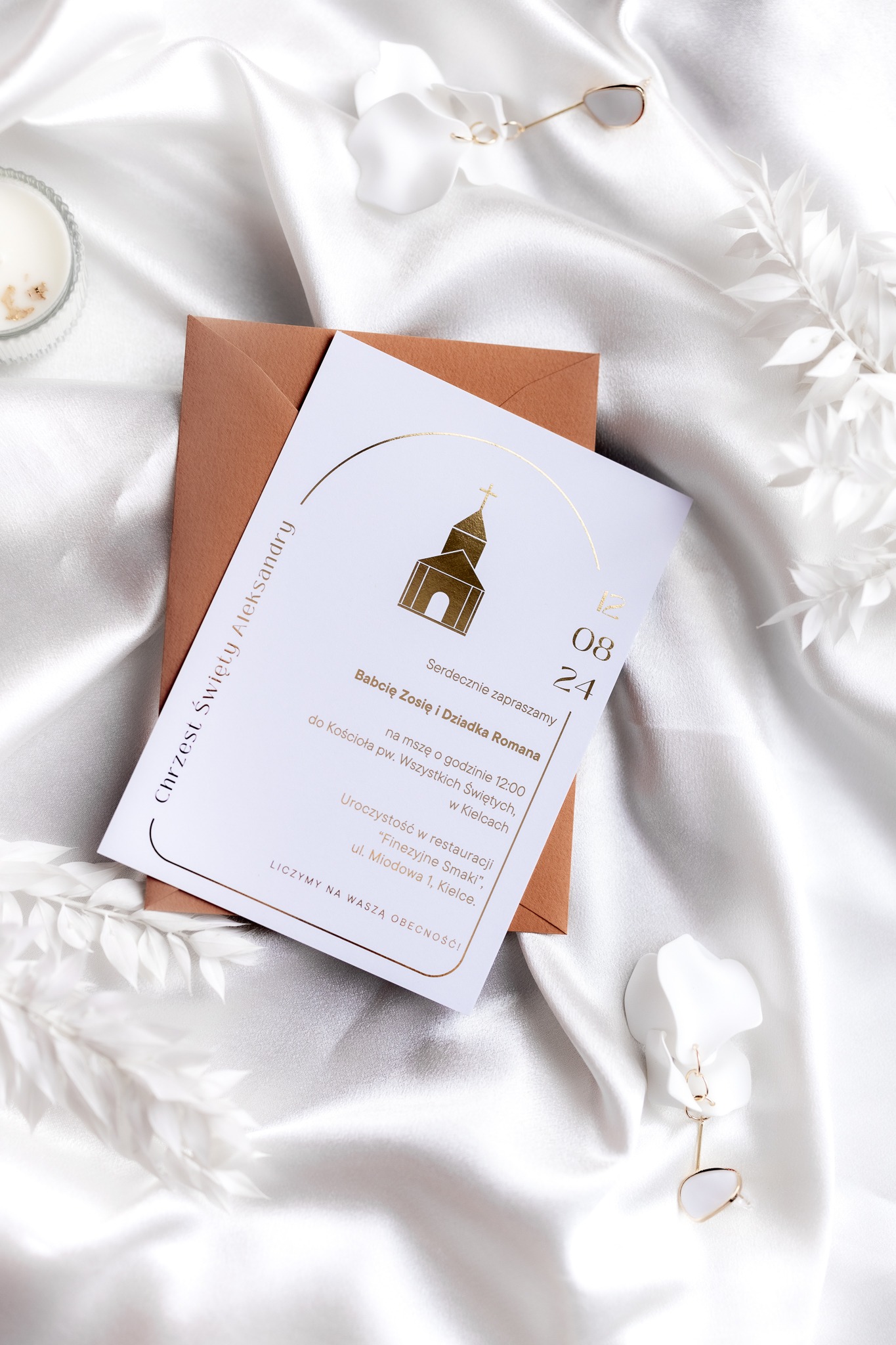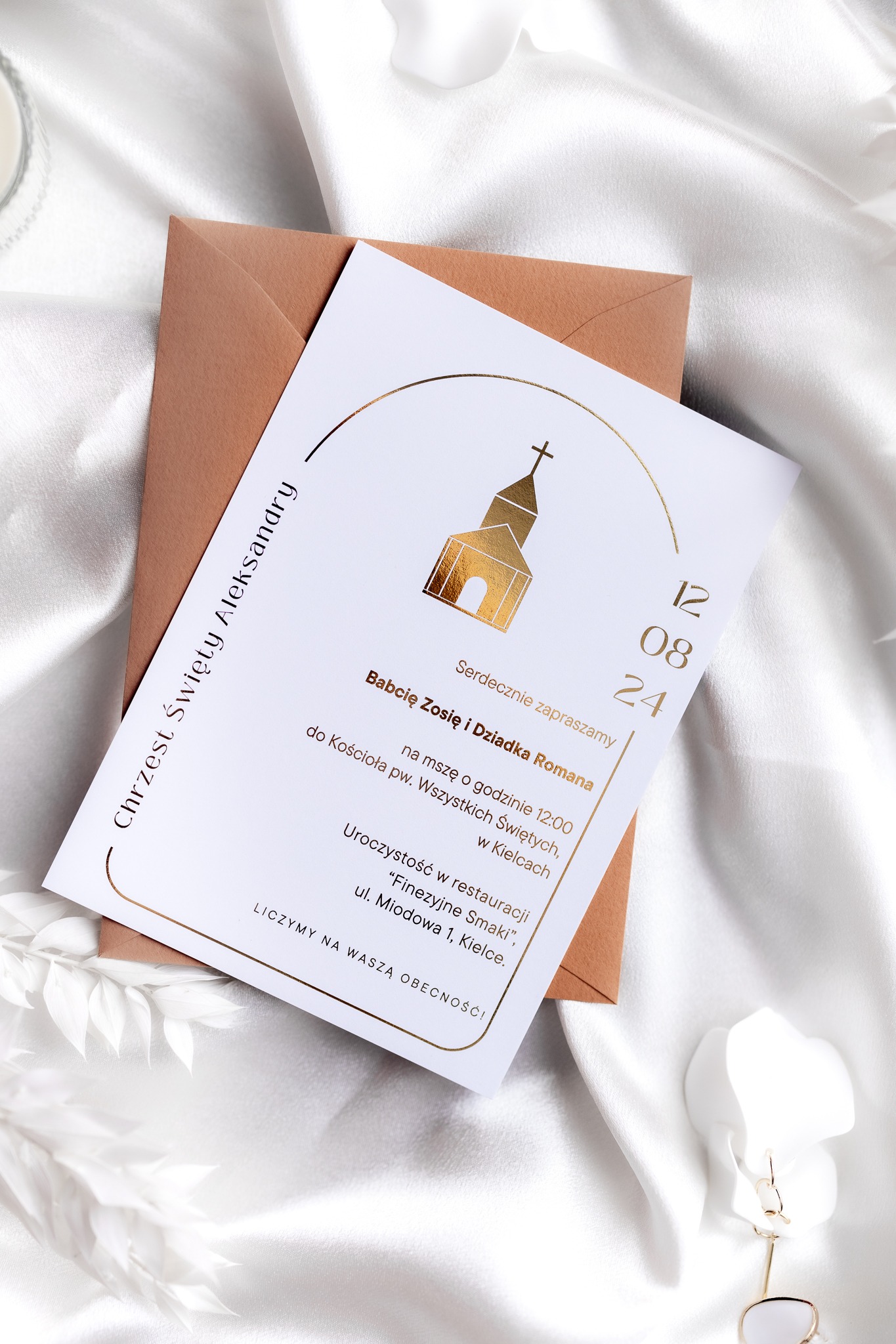 Motyw kościoła to subtelna grafika podkreślająca uroczysty charakter zaproszenia. Treść zaproszenia została pokryta złotą folią, co nadaje całości wyjątkowego blasku i elegancji. Prosta, a zarazem efektowna konstrukcja zaproszenia, idealna na szczególne okazje.